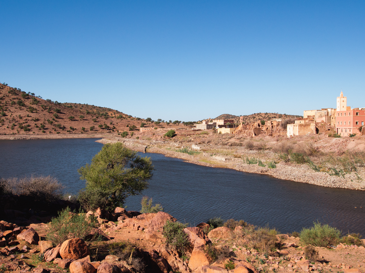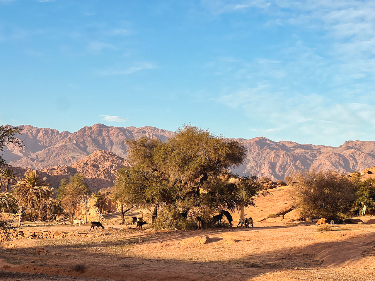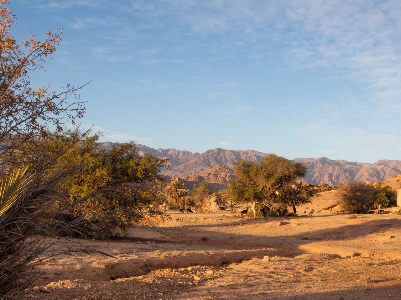 On aperçoit quelques bergers avec leurs troupeaux de chèvres, et on croise de petits villages. Celui-ci a été construit dans une position stratégique, à proximité de la ressource la plus précieuse du désert, un réservoir d’eau.