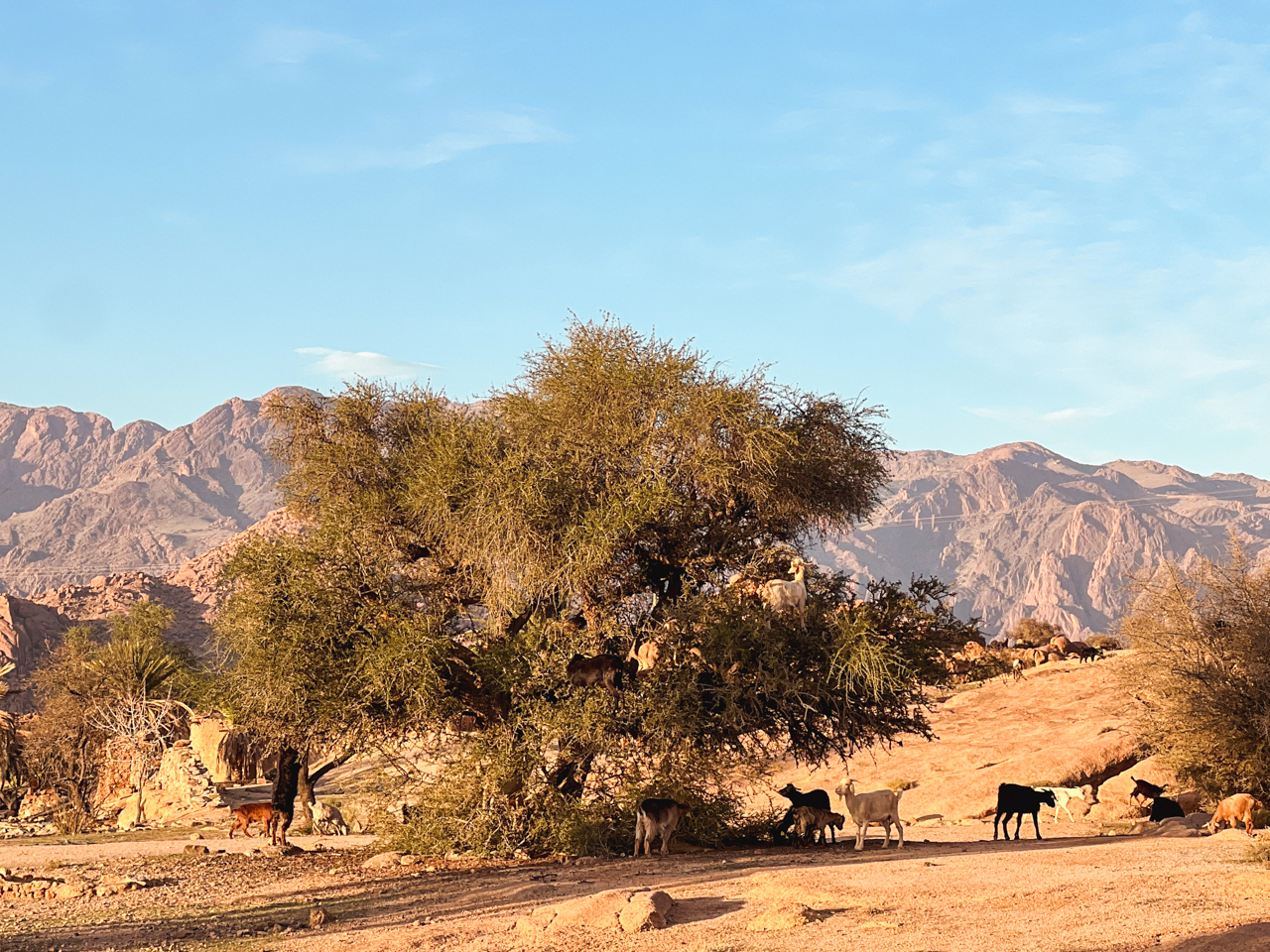 Un peu plus loin, un berger surveille son troupeau de chèvres, on est super excité car ce sont des chèvres qui grimpent aux arbres arganiers pour en manger le fruit. C’est un des symboles de la région du Souss. On se gare sur le bord de la route en essayant de laisser suffisamment de place au cas où une voiture viendrait à passer puis on s’approche de l’arbre. Le berger nous salue mais on n’est pas rassuré pour s’approcher plus près avec le chien qui est très actif autour des bêtes.