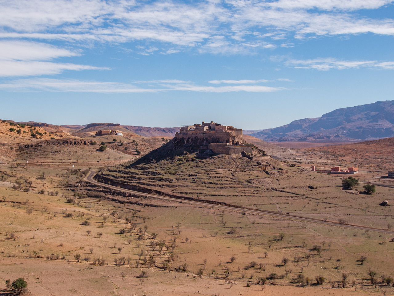 Après cette pause agréable au soleil, on reprend la route et on enchaine les lacets, jusqu’à arriver à la Kasbah de Tizourgane, un ancien village fortifié restauré en hôtel qui domine la vallée sur son piton rocheux, une magnifique vue depuis le bord de la route.