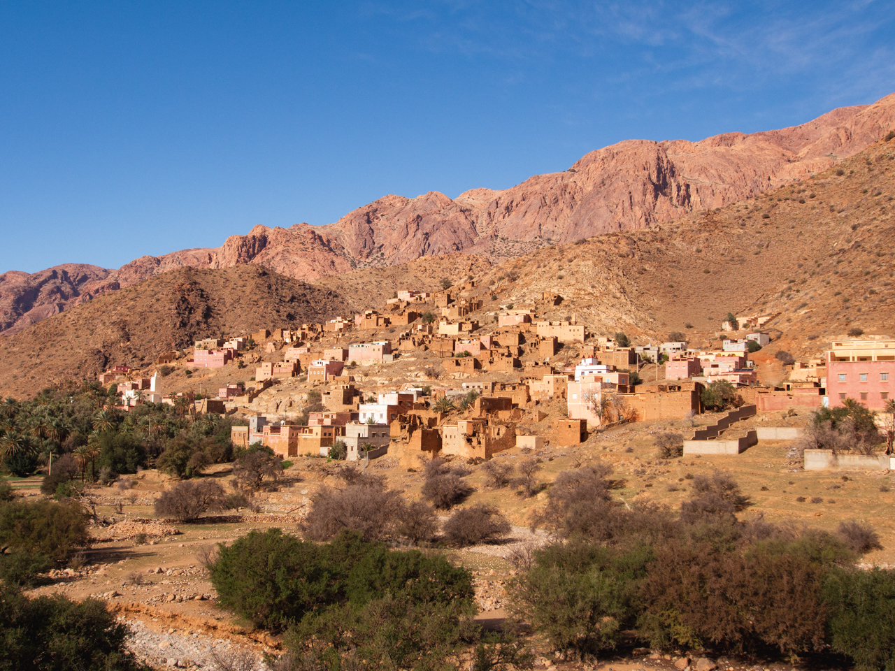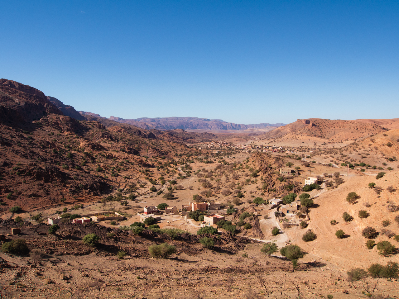 Après avoir passé le plus haut col, on descend sur Tafraout. Il faut bien garder le frein moteur car cette descente et raide et interminable, il y a des camions qui nous laissent passer gentiment. Puis on arrive dans ce décor de merveilleux de la vallée des Ammeln et ses villages accrochés aux hautes montagnes rougeoyantes.