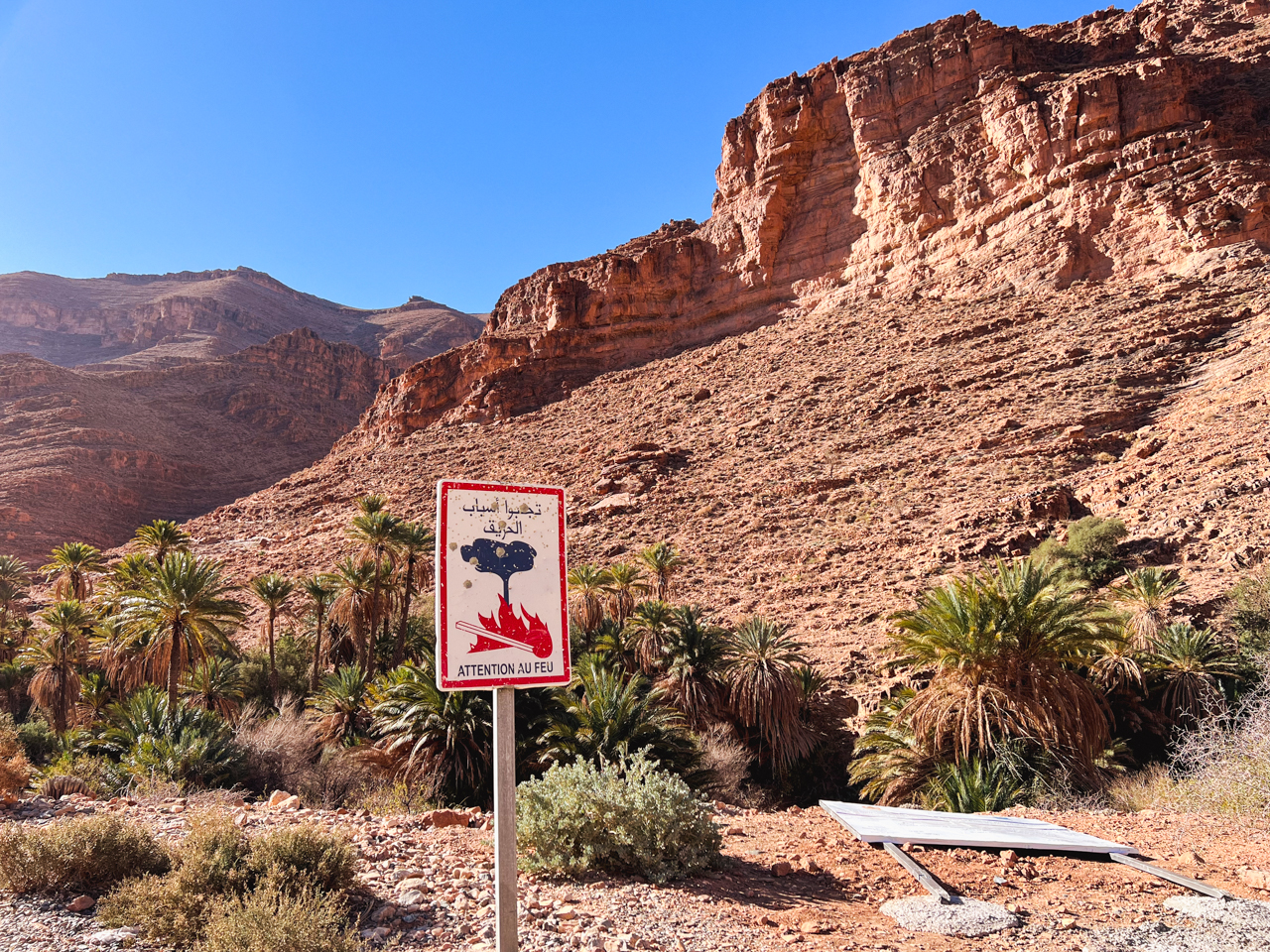 D’ailleurs, c’est amusant de voir qu’au Maroc de nombreux panneaux de circulation sont similaires à ceux que l’on voit en France sur le bord des routes. Comme ici à l’entrée de la palmeraie avec cet avertissement du danger d’incendie.