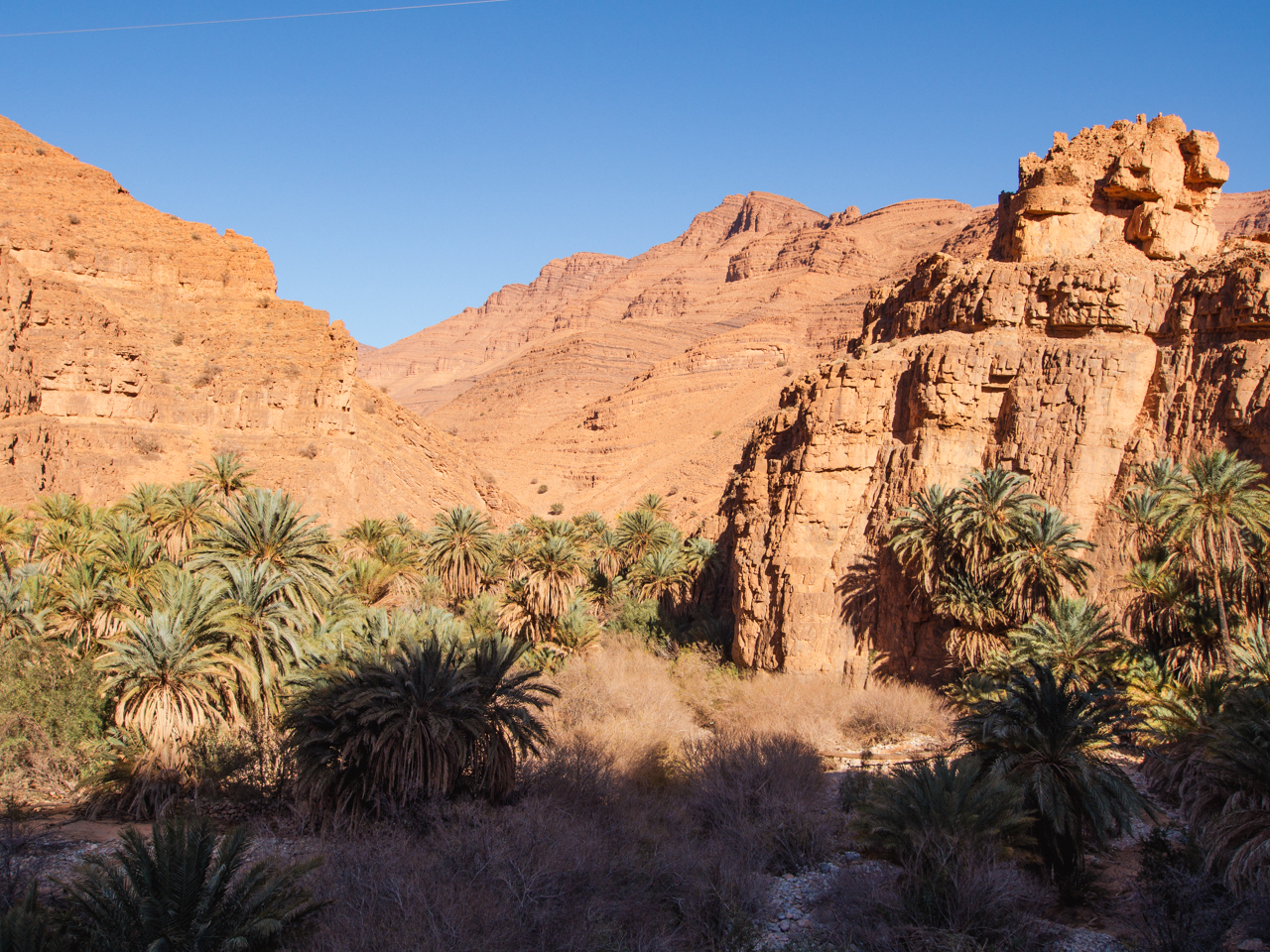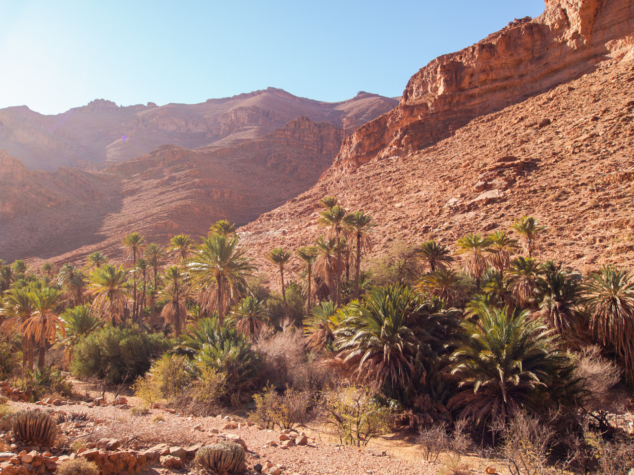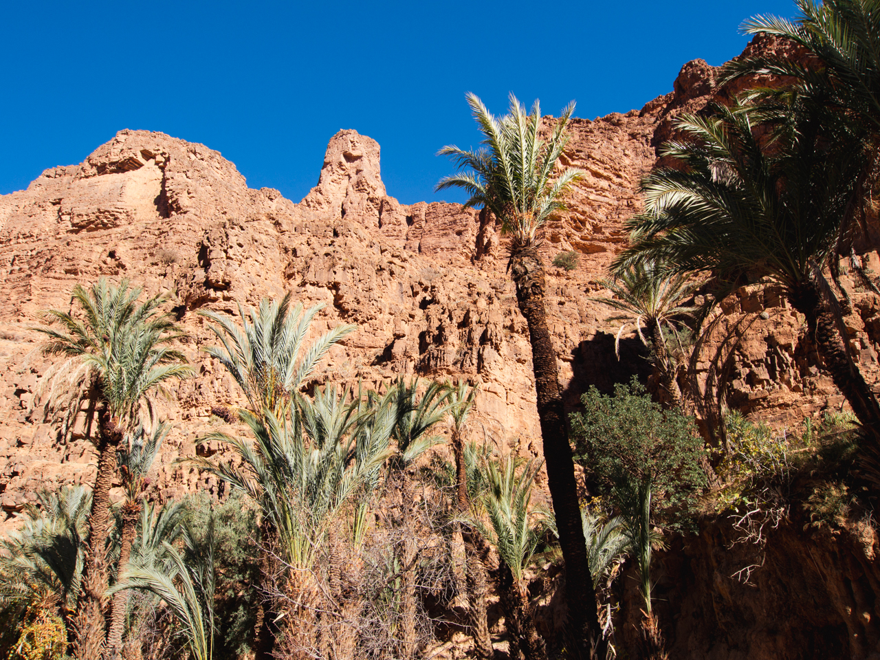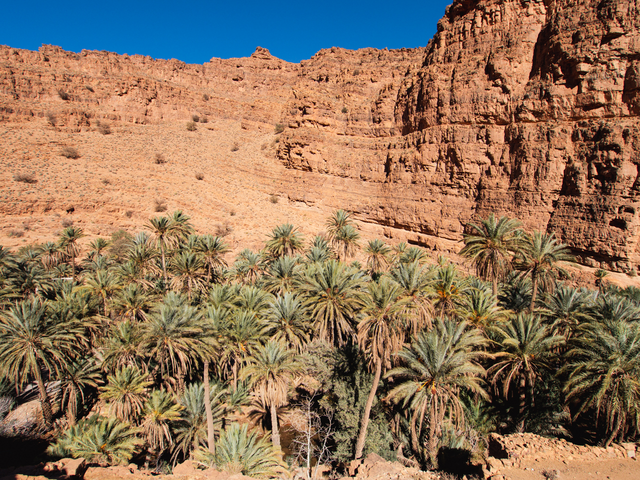 L’environnement autour de la palmeraie est grandiose, c’est comme une grande fracture dans les montagnes ocres de l’Anti Atlas, on est entouré de hautes falaises vertigineuses.