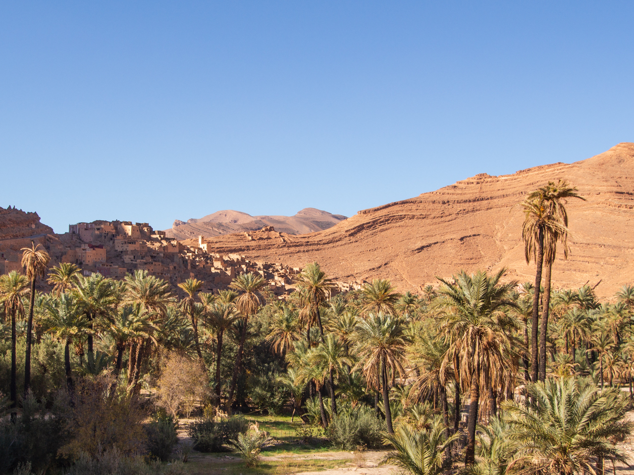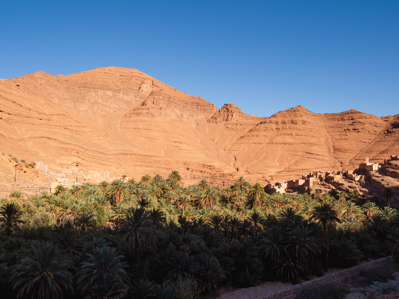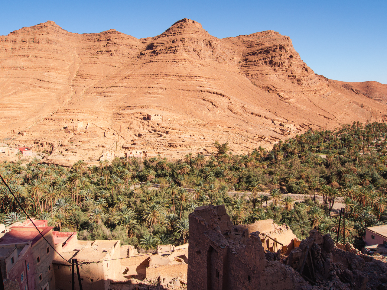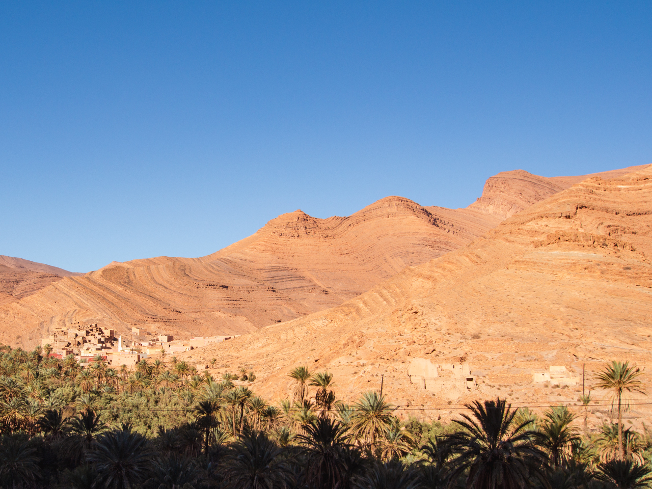 L’environnement autour de la palmeraie est grandiose, c’est comme une grande fracture dans les montagnes ocres de l’Anti Atlas, on est entouré de hautes falaises vertigineuses.