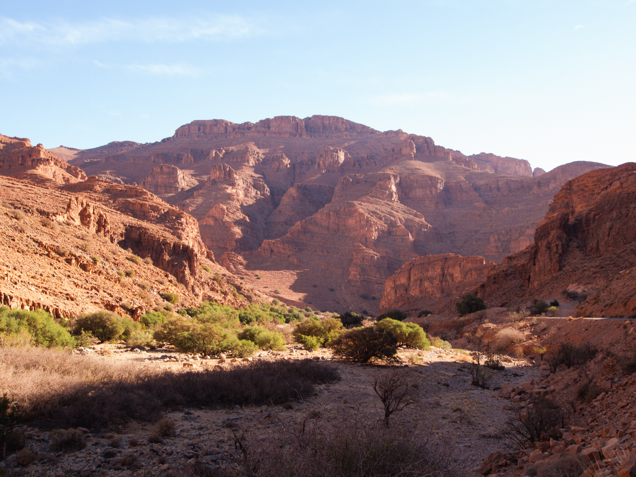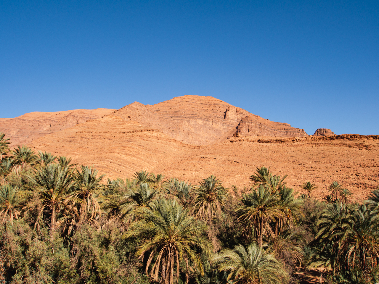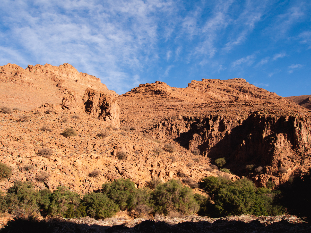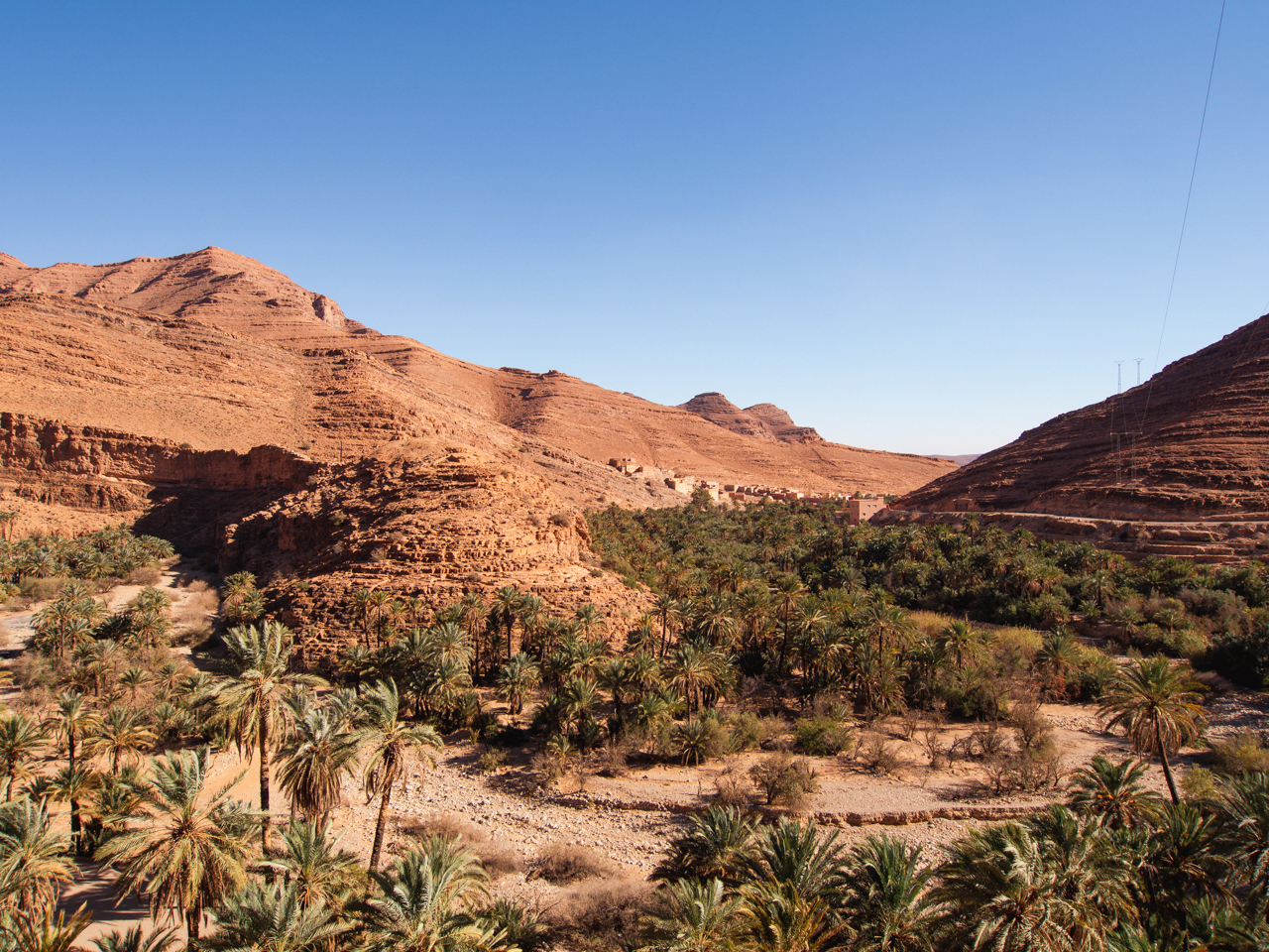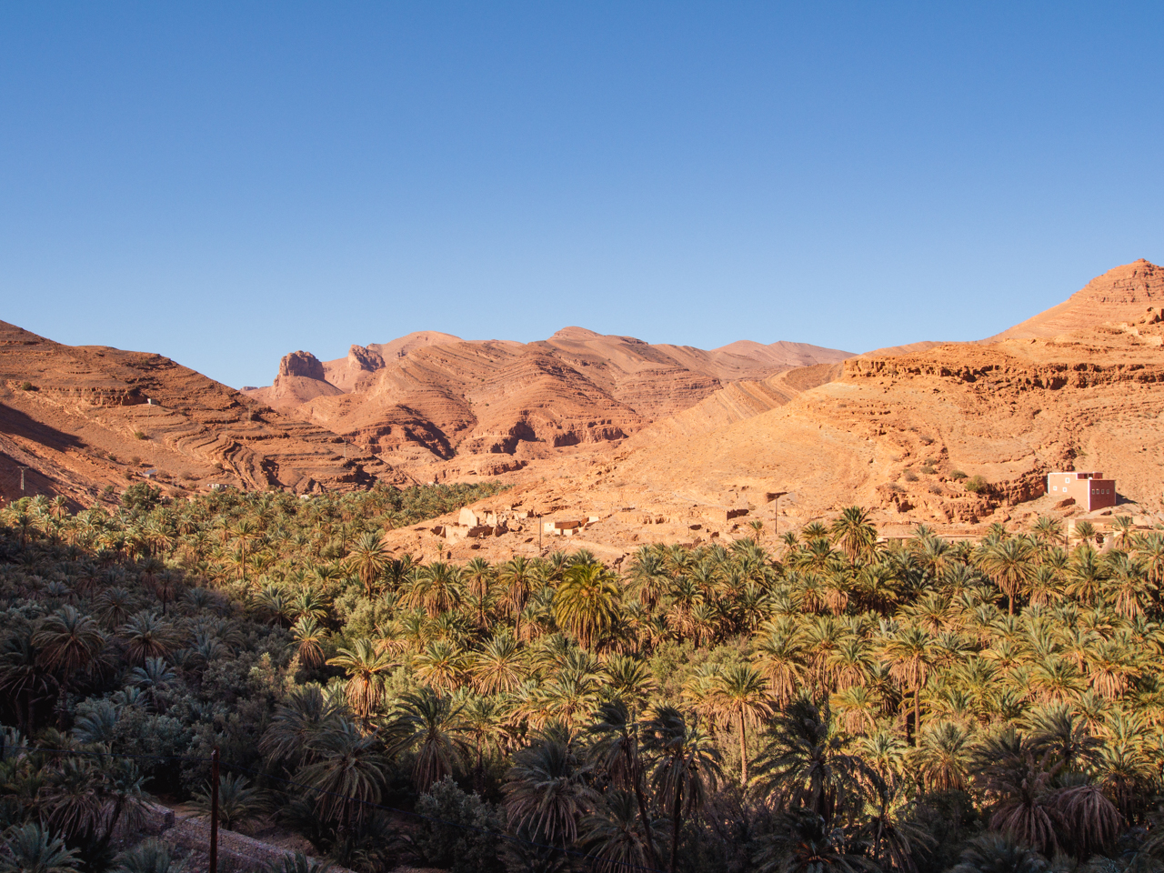 L’environnement autour de la palmeraie est grandiose, c’est comme une grande fracture dans les montagnes ocres de l’Anti Atlas, on est entouré de hautes falaises vertigineuses.