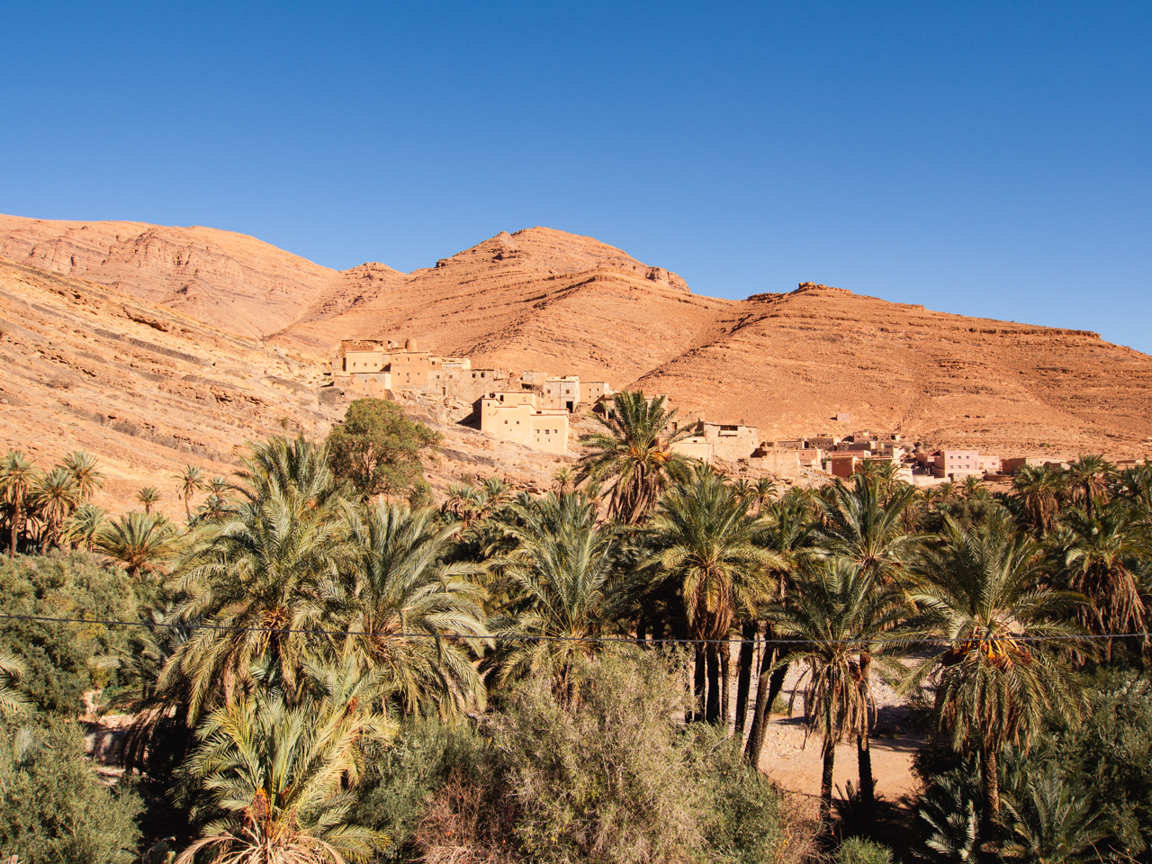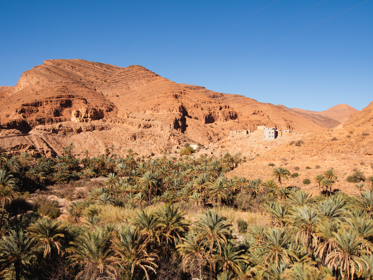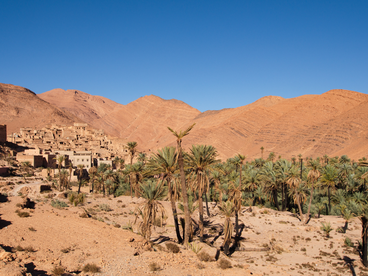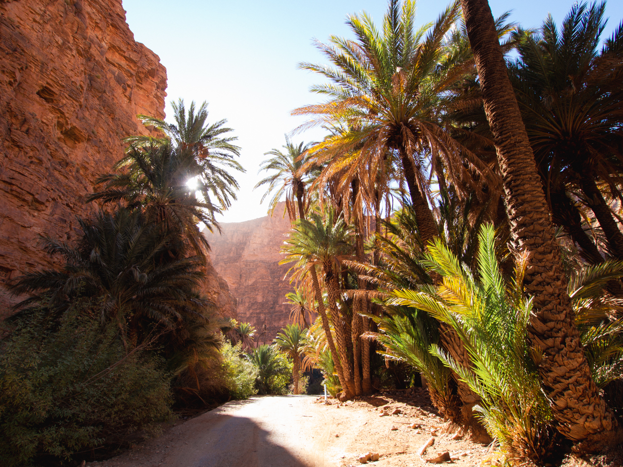 L’environnement autour de la palmeraie est grandiose, c’est comme une grande fracture dans les montagnes ocres de l’Anti Atlas, on est entouré de hautes falaises vertigineuses.