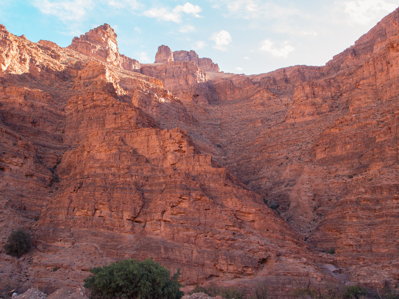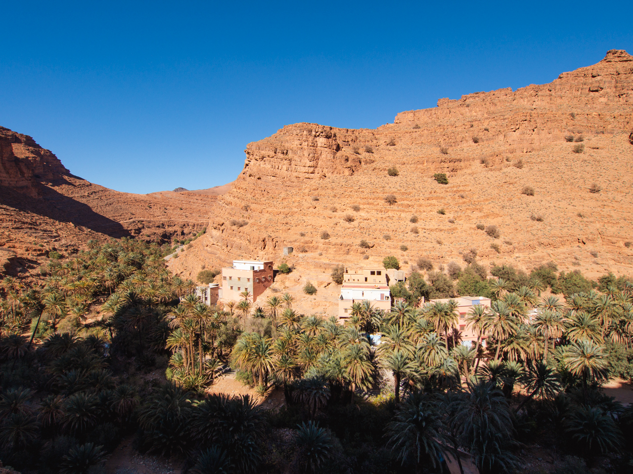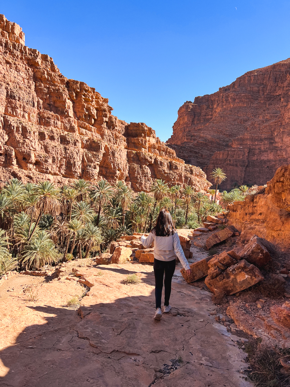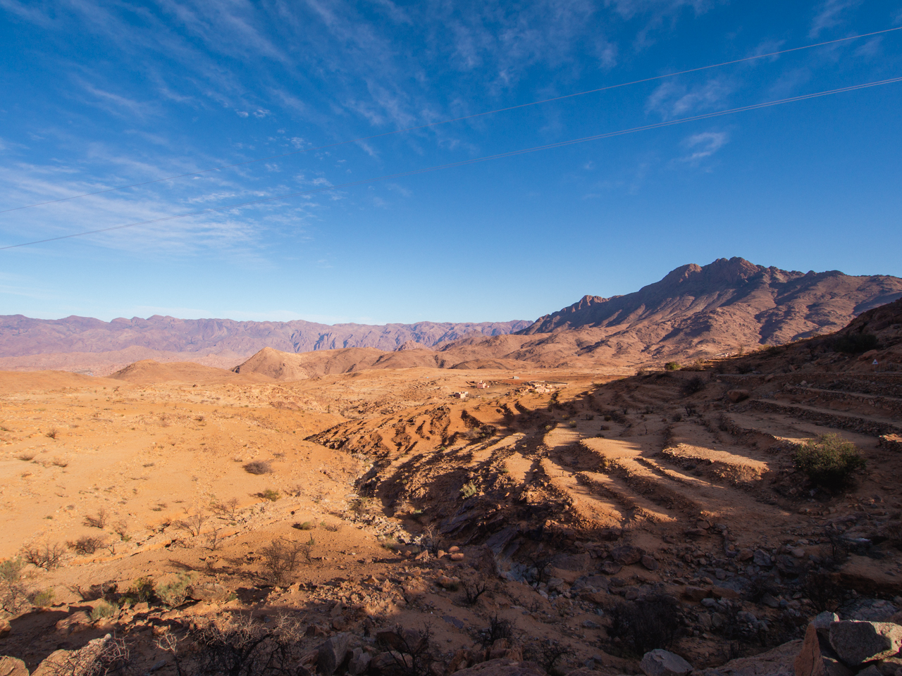 L’environnement autour de la palmeraie est grandiose, c’est comme une grande fracture dans les montagnes ocres de l’Anti Atlas, on est entouré de hautes falaises vertigineuses.