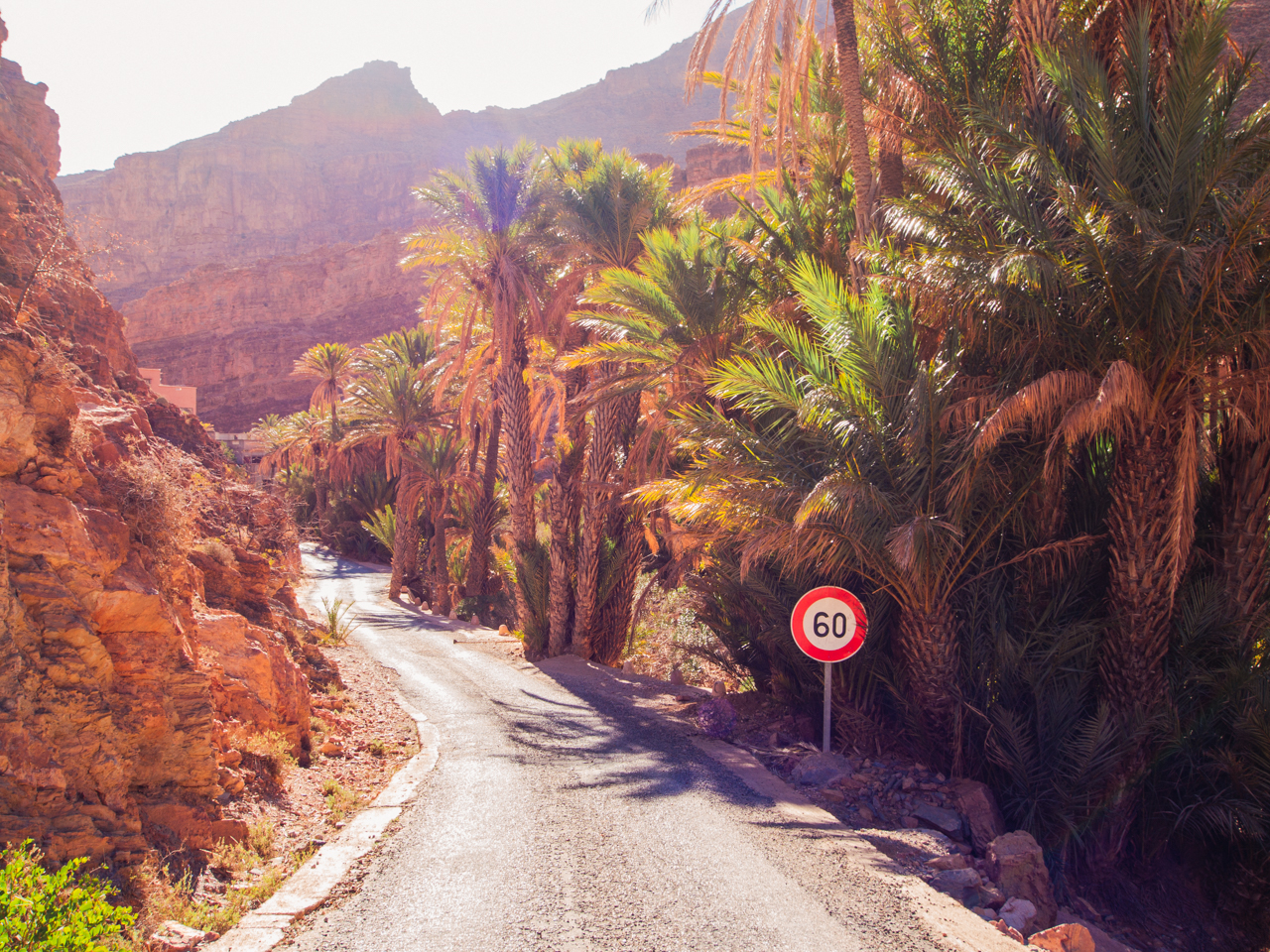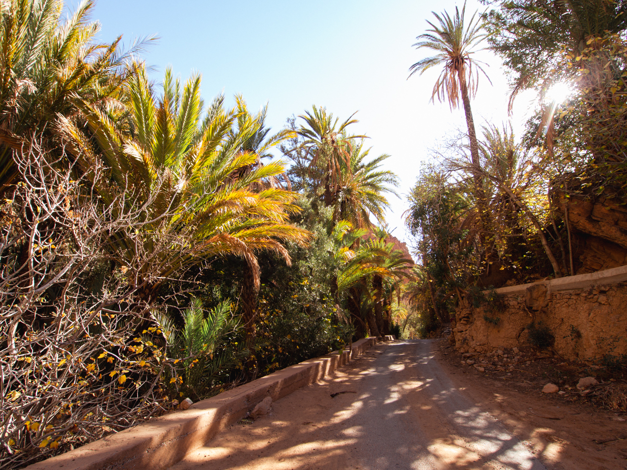 La route pénètre dans la palmeraie et on se retrouve entouré d’une végétation luxuriante magnifique.