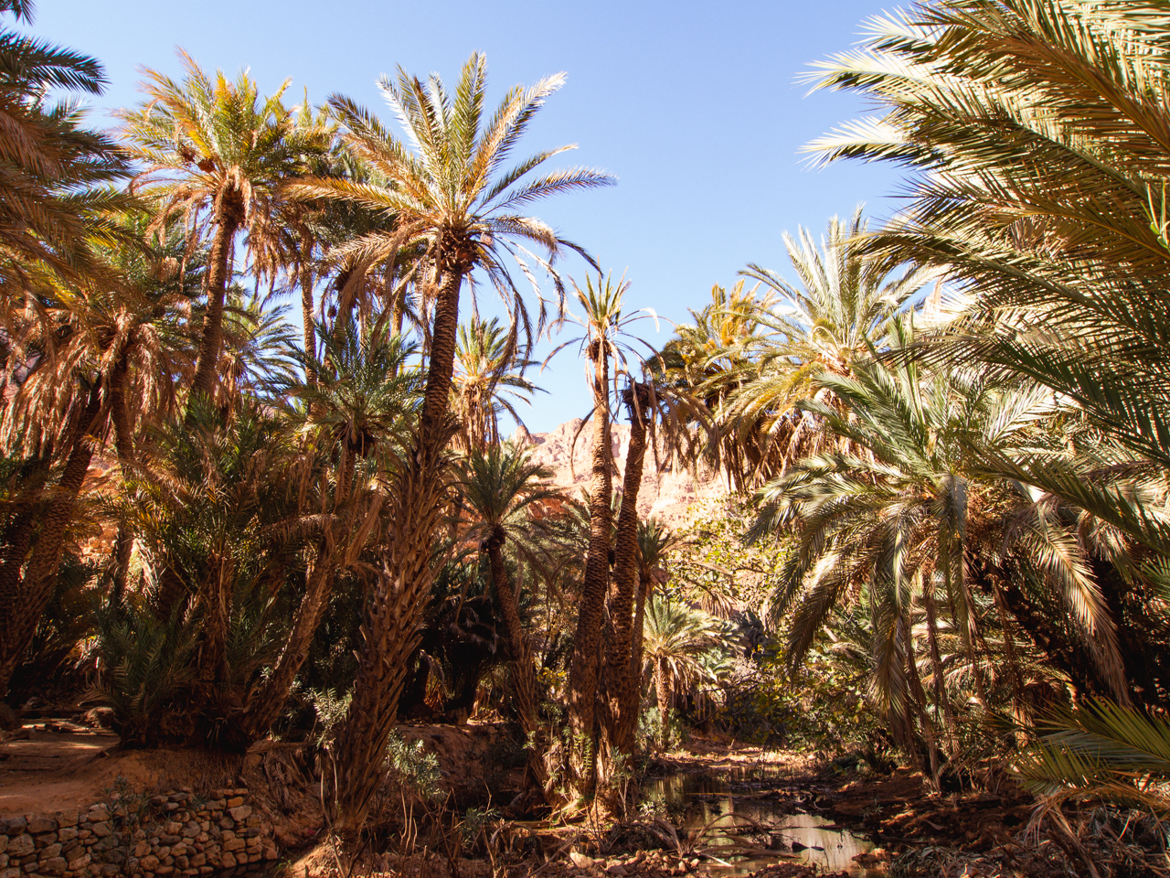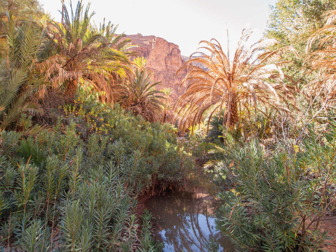 Tout à coup au milieu de ce décor aride, l’eau fait son apparition et apporte la vie avec elle. De grands palmiers poussent sur les berges du petit ruisseau et s’élèvent dans ce désert de pierre.