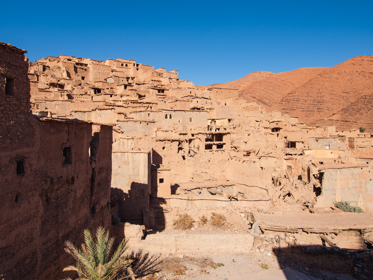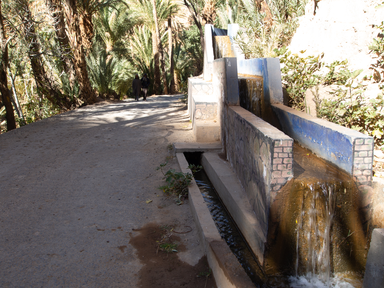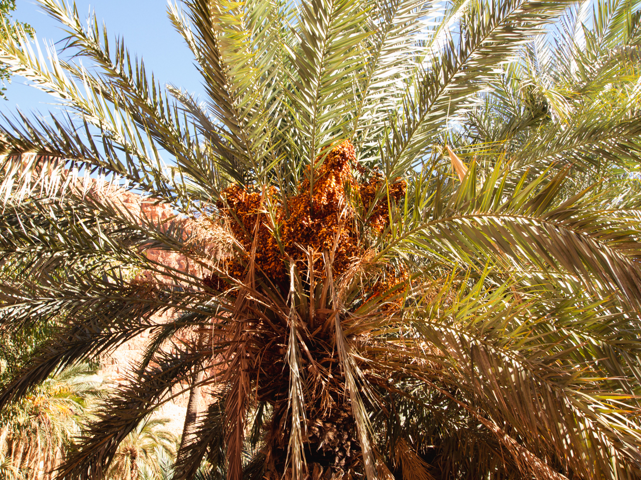 Les palmiers sont en très bon état, mais on remarque que les dattes sont encore sur les arbres ou tombées au sol. Abdou nous dira que les jeunes ne vivent plus dans la palmeraie et qu’il n’y a plus assez de force de travail pour tout récolter. Ils préfère tenter leur chance dans les grandes villes comme Marrakech, comme ses enfants d’ailleurs.