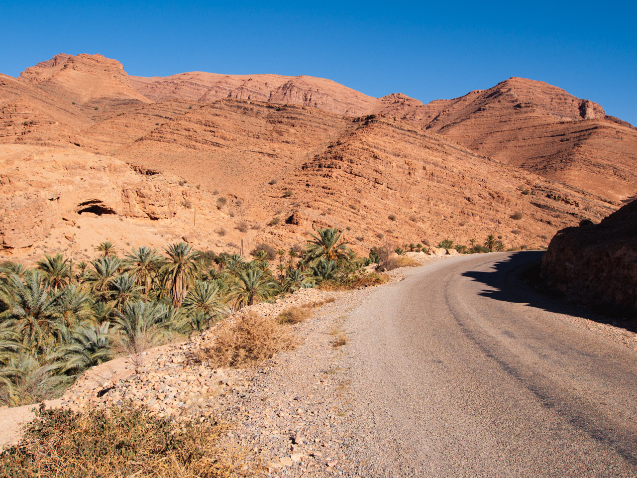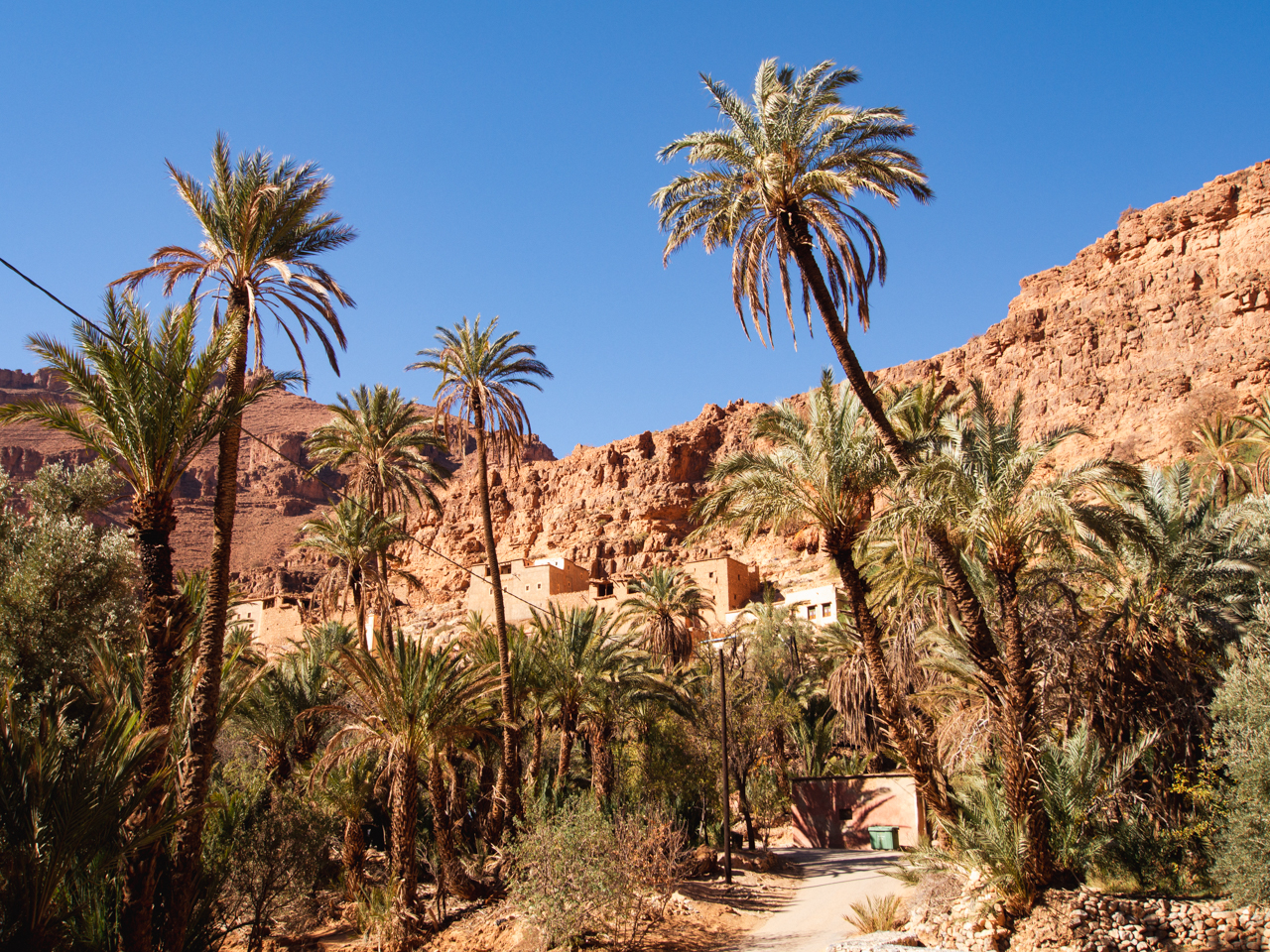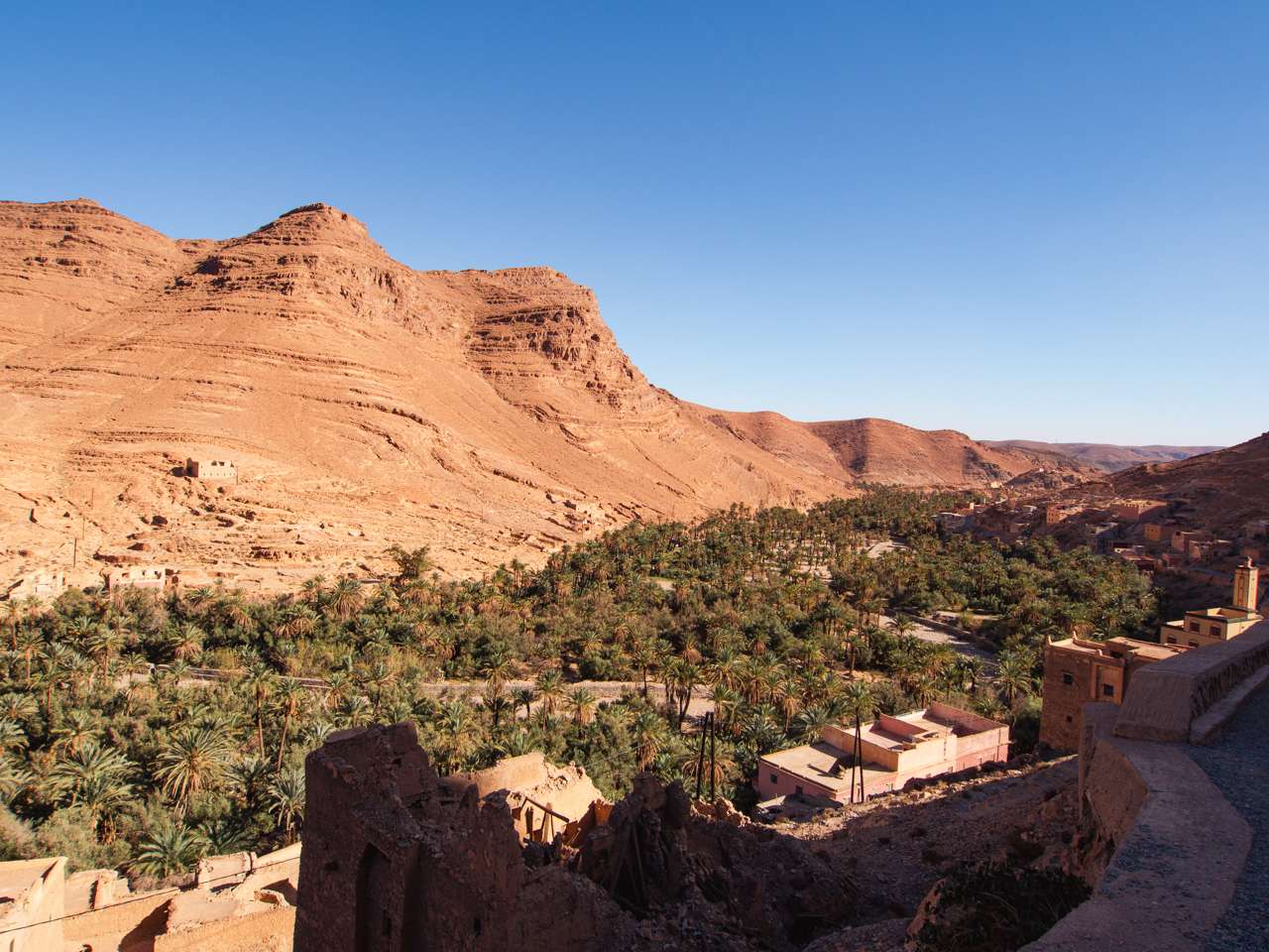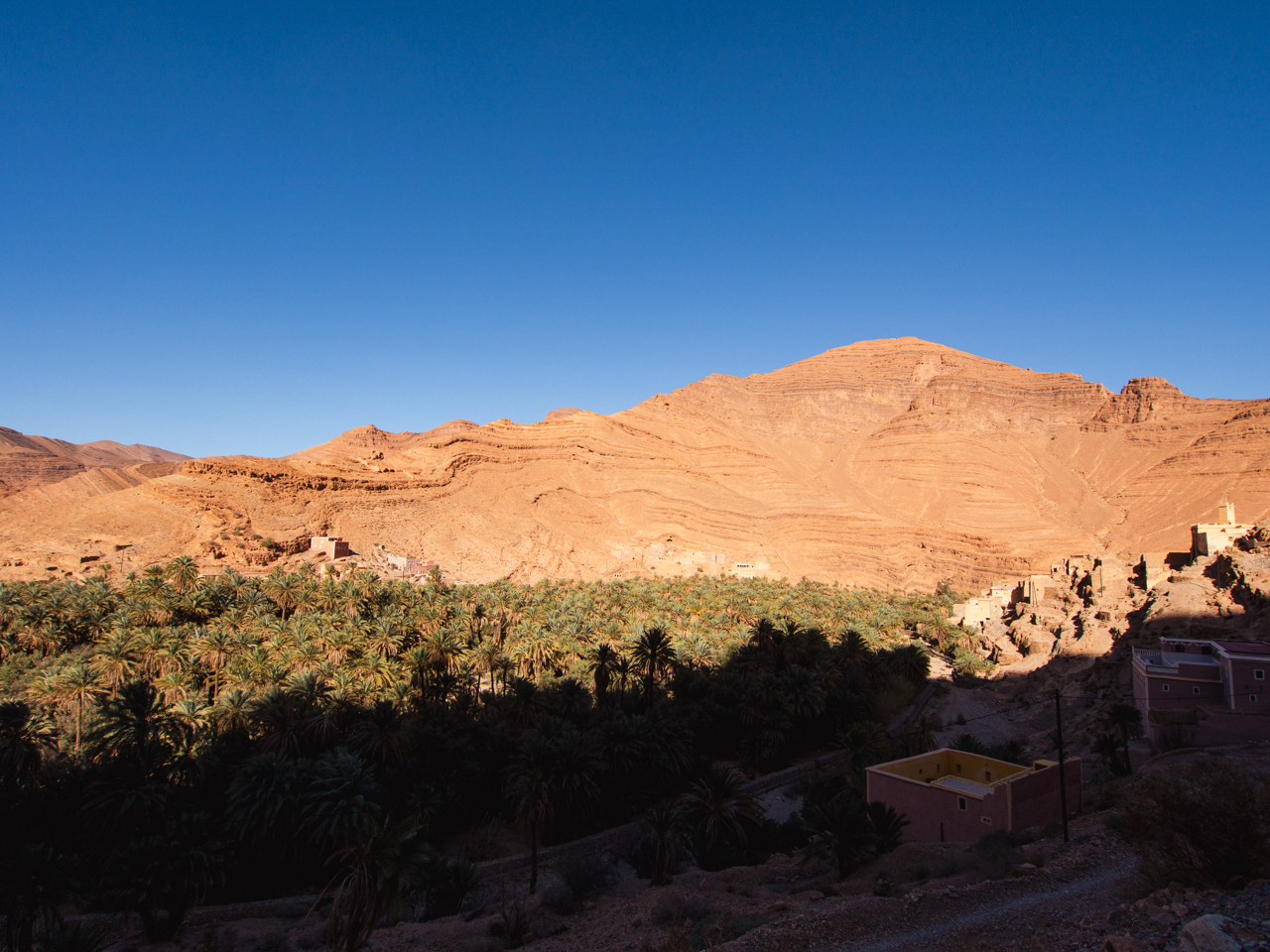 La vue depuis les hauteurs est différente, quel contraste entre l’aridité des roches de la gorge et la vitalité de la palmeraie.