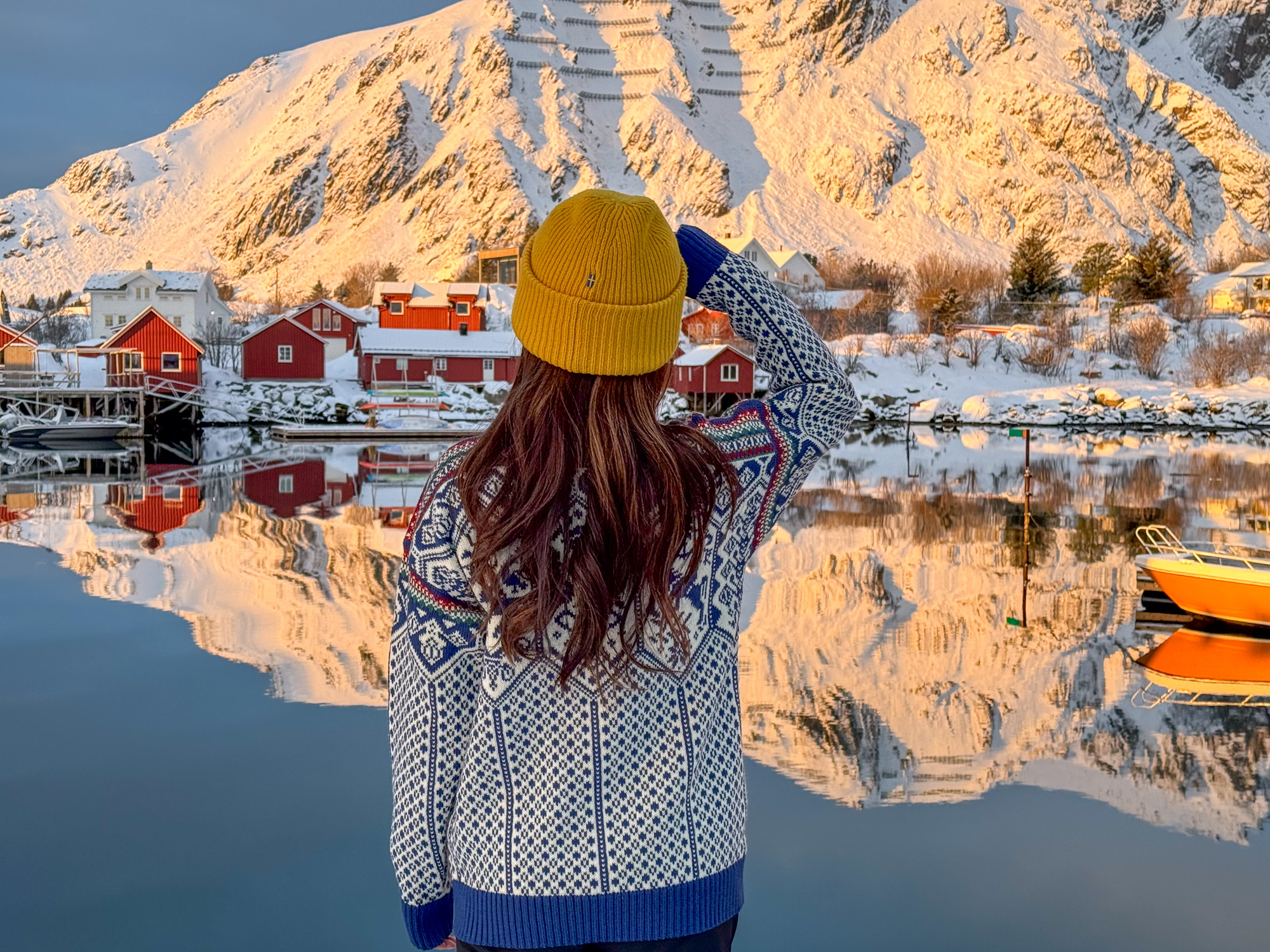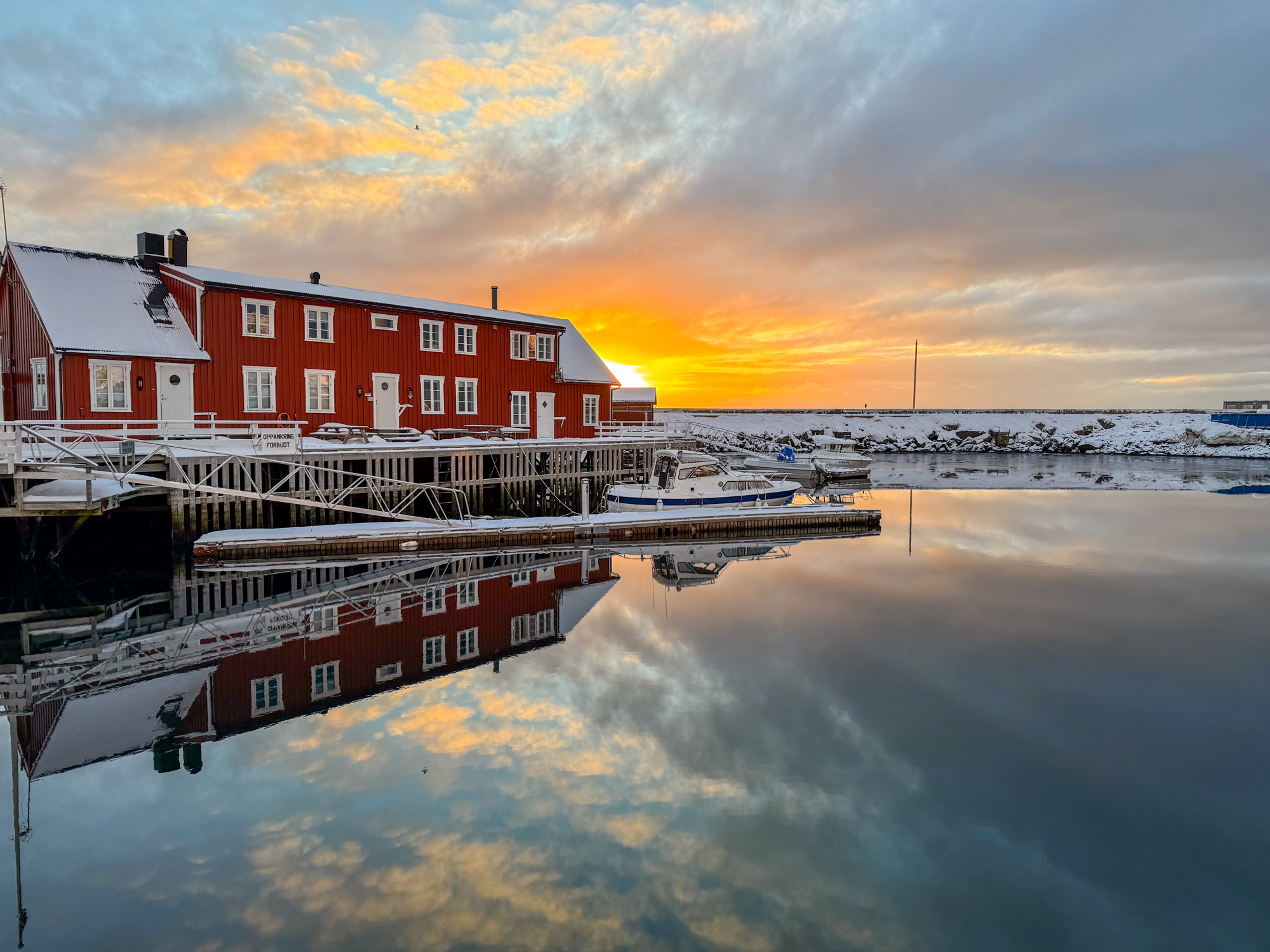 En se réveillant ce matin, le temps est magnifique. La lumière de l’aurore vient colorer les montagnes et l’eau du fond du fjord de Ballstad, cela annonce une belle journée. Alors que l’on prend le petit déjeuner dans la salle du restaurant de l’hôtel, le soleil décide à se lever et la montagne enneigée prend maintenant une couleur dorée. L’eau du fjord est encore calme comme un miroir, tout le monde sort pour profiter de cet instant magique sur le port.