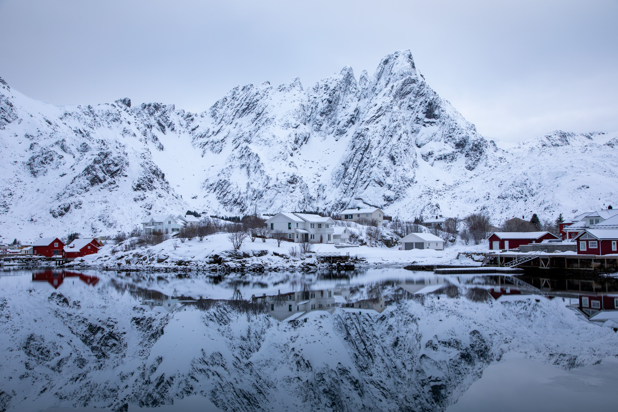Ce matin on a le droit de magnifiques reflets, avec de superbes contrastes entre le blanc de la neige et le rouge des maisons.