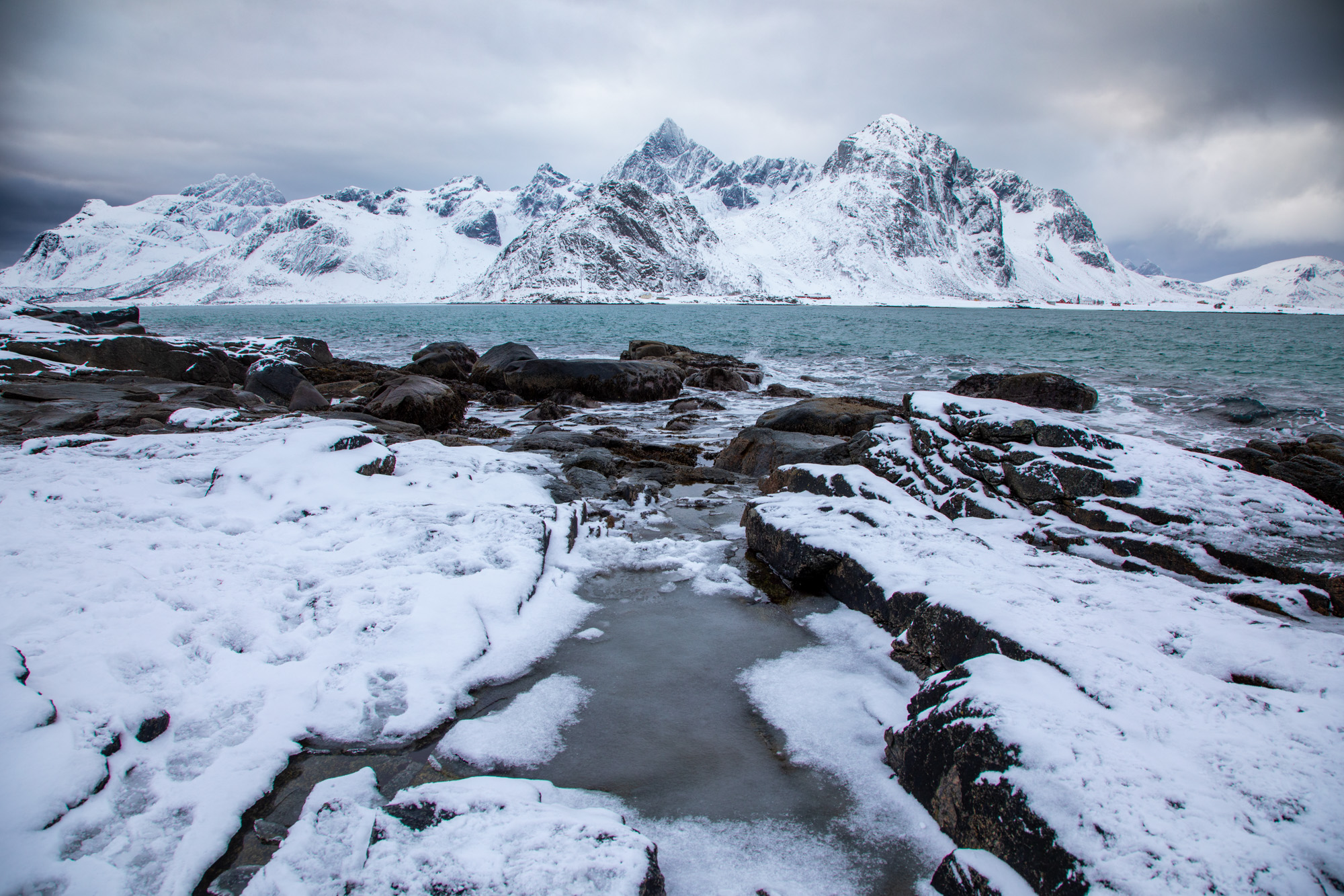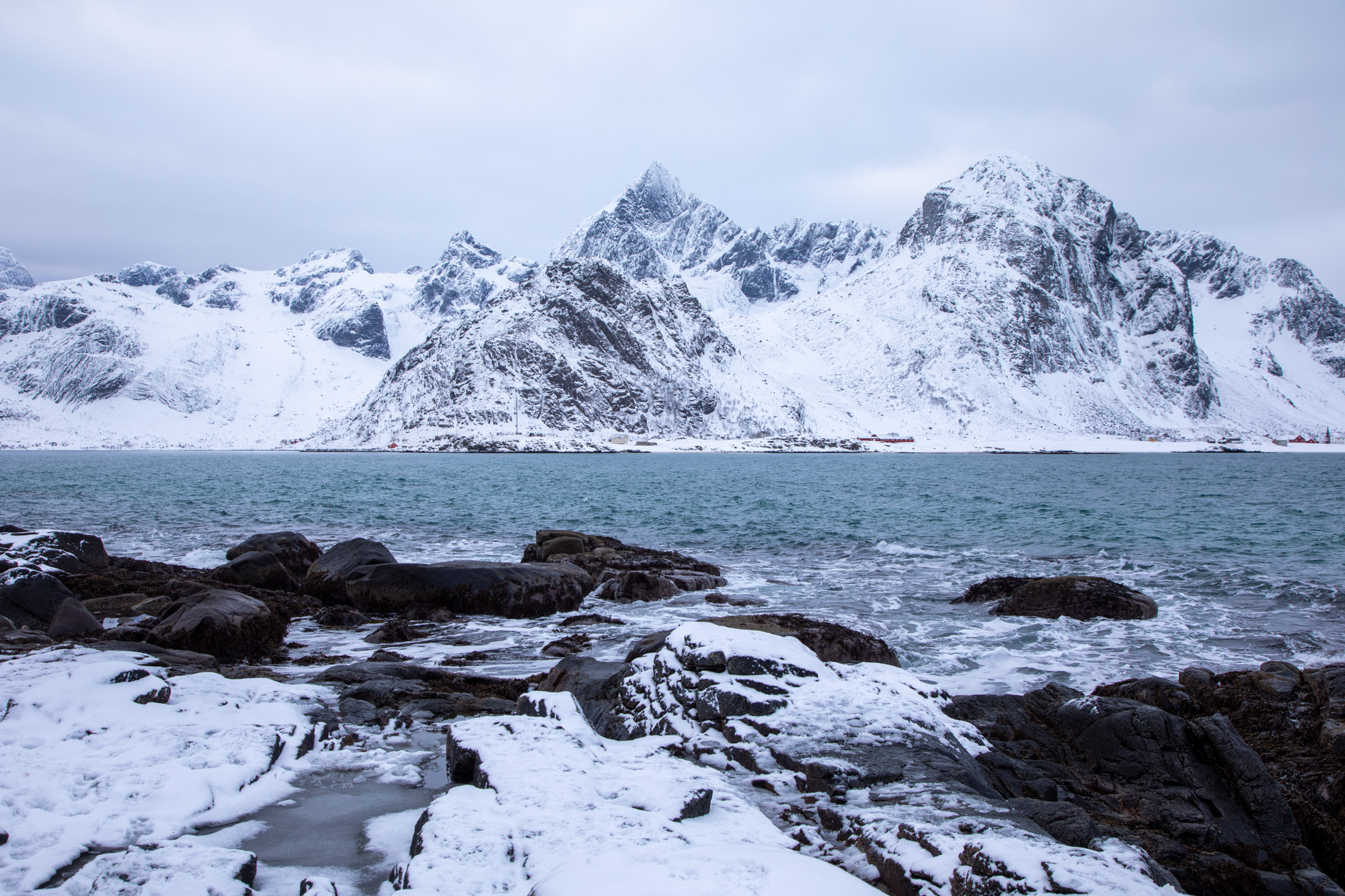 L’eau est d’un bleu froid mais lumineux, les montagnes sont très acérées. On trouve enfin un endroit pour s’arrêter, il y a déjà un groupe de photographes asiatiques très bien équipés qui prennent en photo les vagues. On marche dans la neige pour s’approcher du bord, il faut faire attention à ne pas avoir le pied qui traverse la glace qui n’est pas toujours très épaisse.