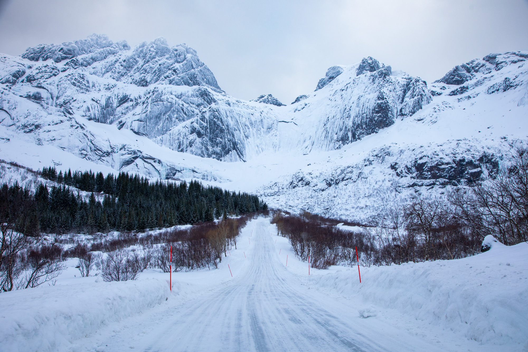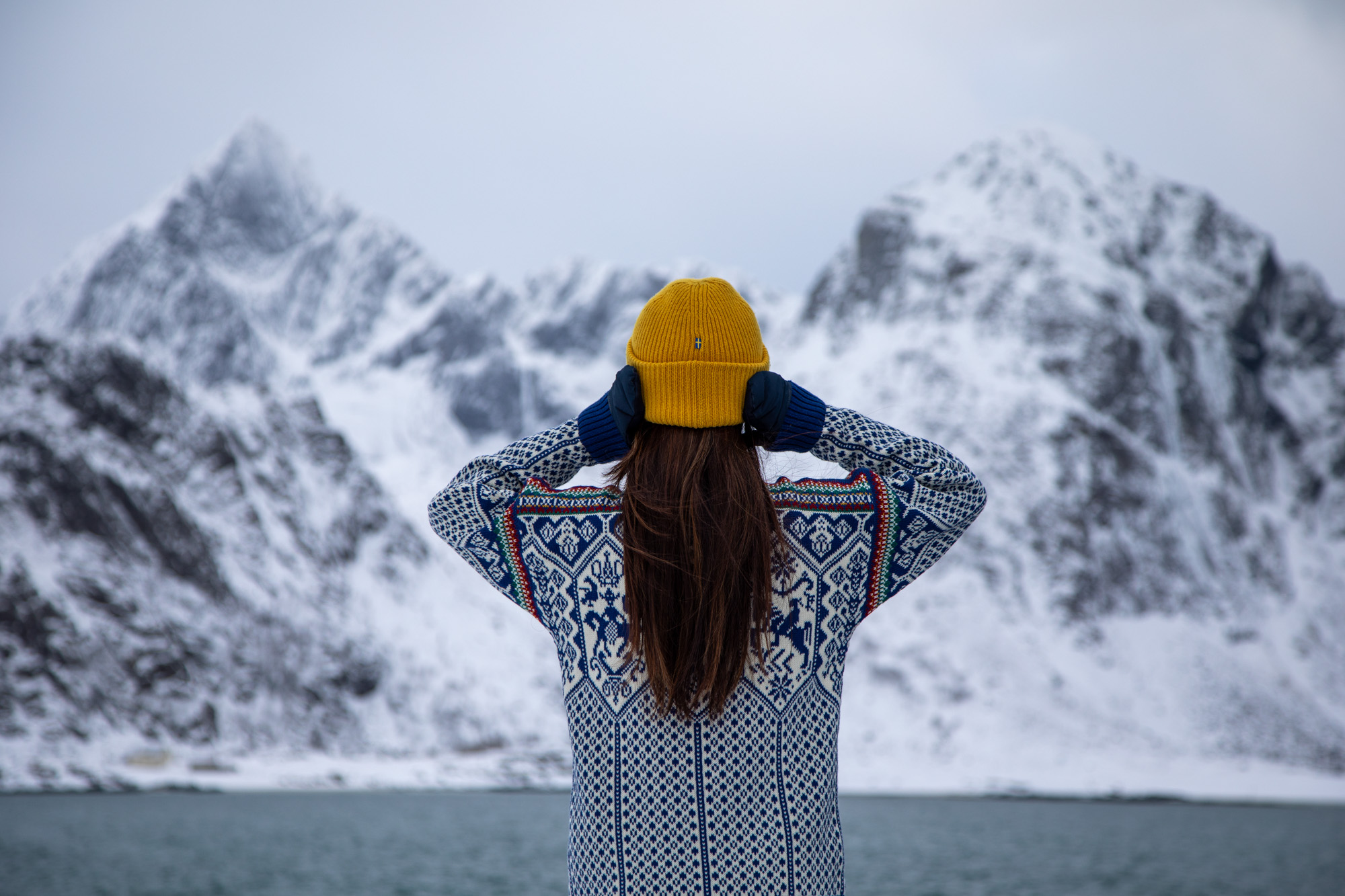Alors que ce matin on avait eu le droit à un grand soleil, il y a maintenant un vent fort qui souffle et on se fait surprendre car on est sorti de la voiture sans notre veste, juste en pull. On rentre se réchauffer et on décide de faire voler le drone au dessus de la zone pour avoir un panorama aérien. Le temps de déplier le drone et de le connecter au téléphone et de le faire prendre de l’altitude qu’il se met déjà à neiger. Je suis obligé de le faire revenir en catastrophe car il n’a pas de capot sur les moteurs et je ne veux pas l’abimer. Dans la précipitation, je le fais redescendre top vite et il heurte le pneu de la voiture et s’écrase au sol. Zut, je voulais le protéger de la neige et au final il a subi un choc. J’inspecte l’appareil et il me semble avoir survécu à l’accident. Le rotor semble un peu abimé quand même, je ferai un état des lieux des dégâts plus tard car la neige commence à tomber de plus en plus fort. On a encore une fois été surpris par la vitesse à laquelle le temps à changer. On se décide de rejoindre tout de suite le Nusfjord et de passer la journée à pied, cela fera du bien de ne plus toucher à la voiture pendant une journée et d’utiliser ses jambes. La petite route qui rejoint le Nusfjord est courte mais magnifique, on a l’impression d’être arrivé dans une zone sauvage, que la route va entrer dans l’immense montagne qui nous fait face.