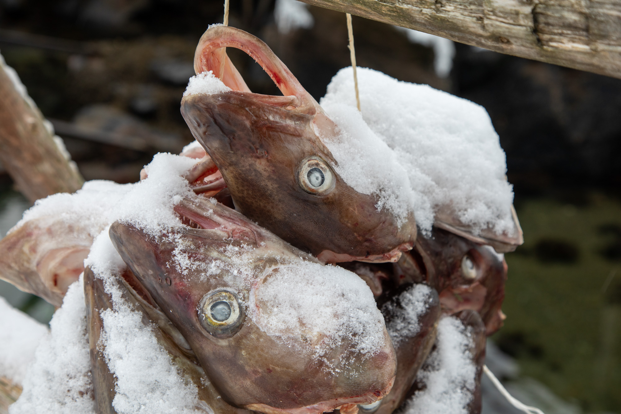 Sur les barrières de bois, on découvre des têtes de poisson attachées qui sèchent dans la neige. C’est assez incongru, d’ailleurs on se demande pourquoi les nombreuses mouettes qui crient au-dessus de nos têtes ne viennent pas manger cette nourriture facilement accessible plutôt que de piailler. Visiblement, cela ne doit pas faire partie de leur régime alimentaire car les têtes sont toutes intactes.
