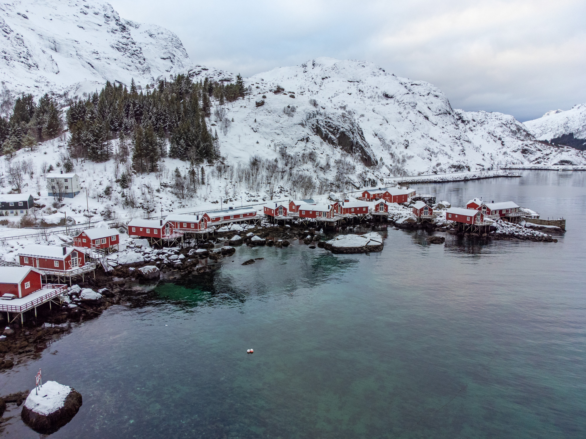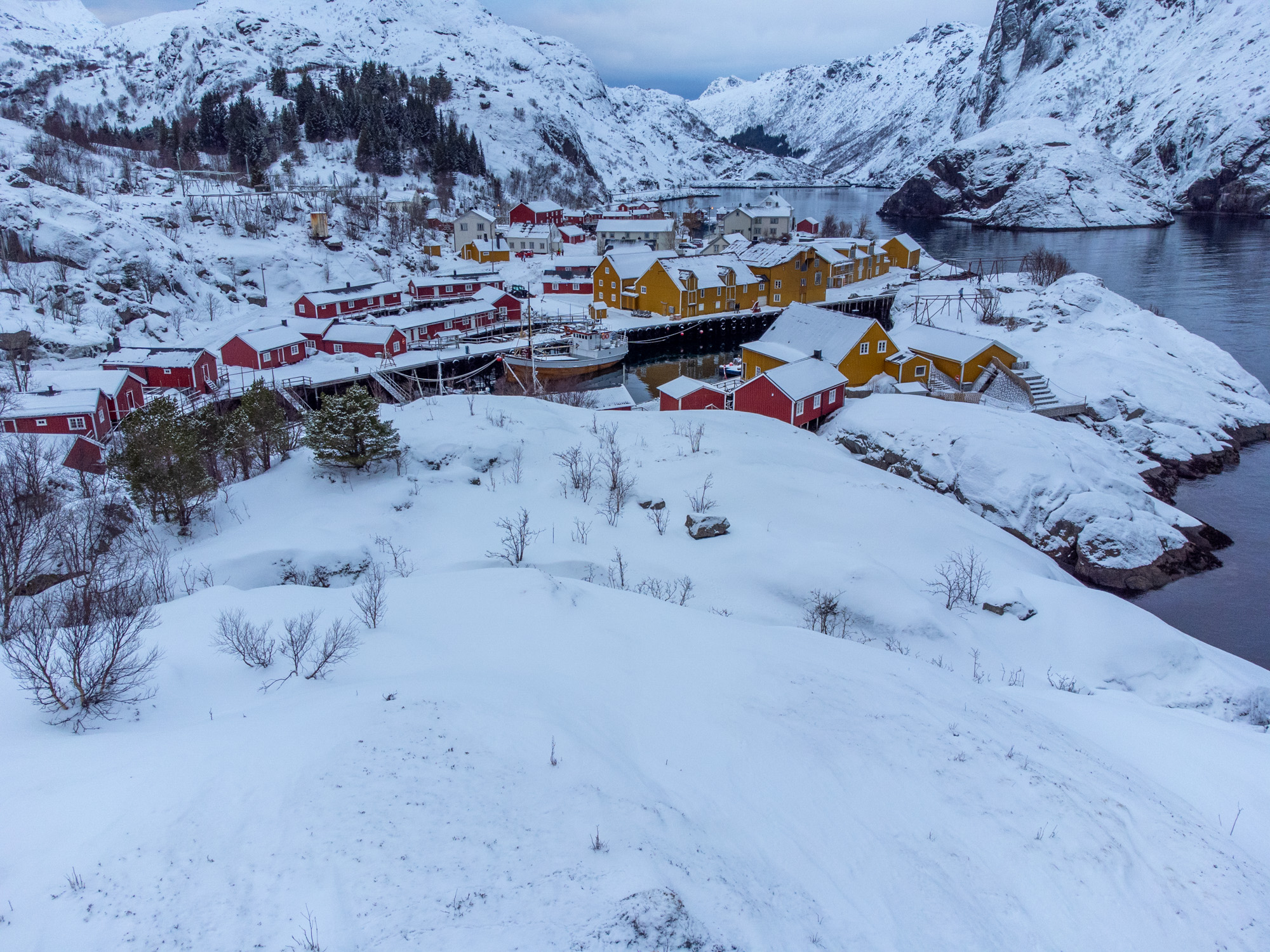 J’en profite pour inspecter le drone et visiblement, il marche encore. Je le teste immédiatement en le faisant voler au dessus du Nusfjord et il n’y a pas de problème à signaler, je peux faire de très belles photos d’ensemble et aussi des points de vue un peu différent de ce que l’on a fait aujourd’hui à pied.