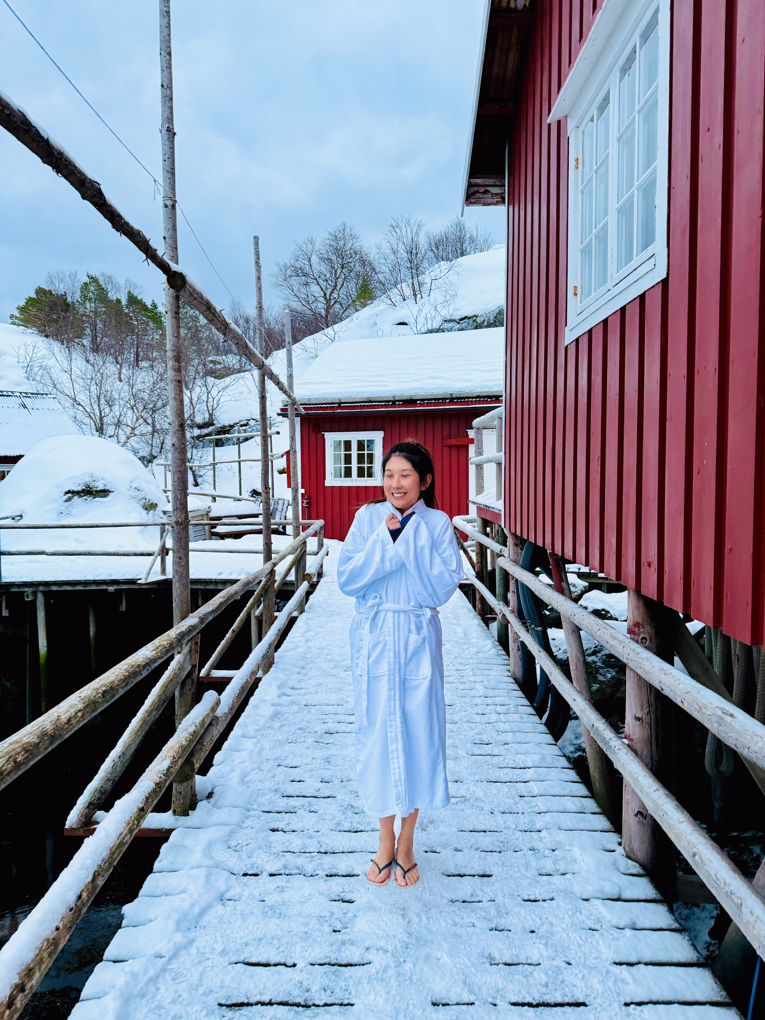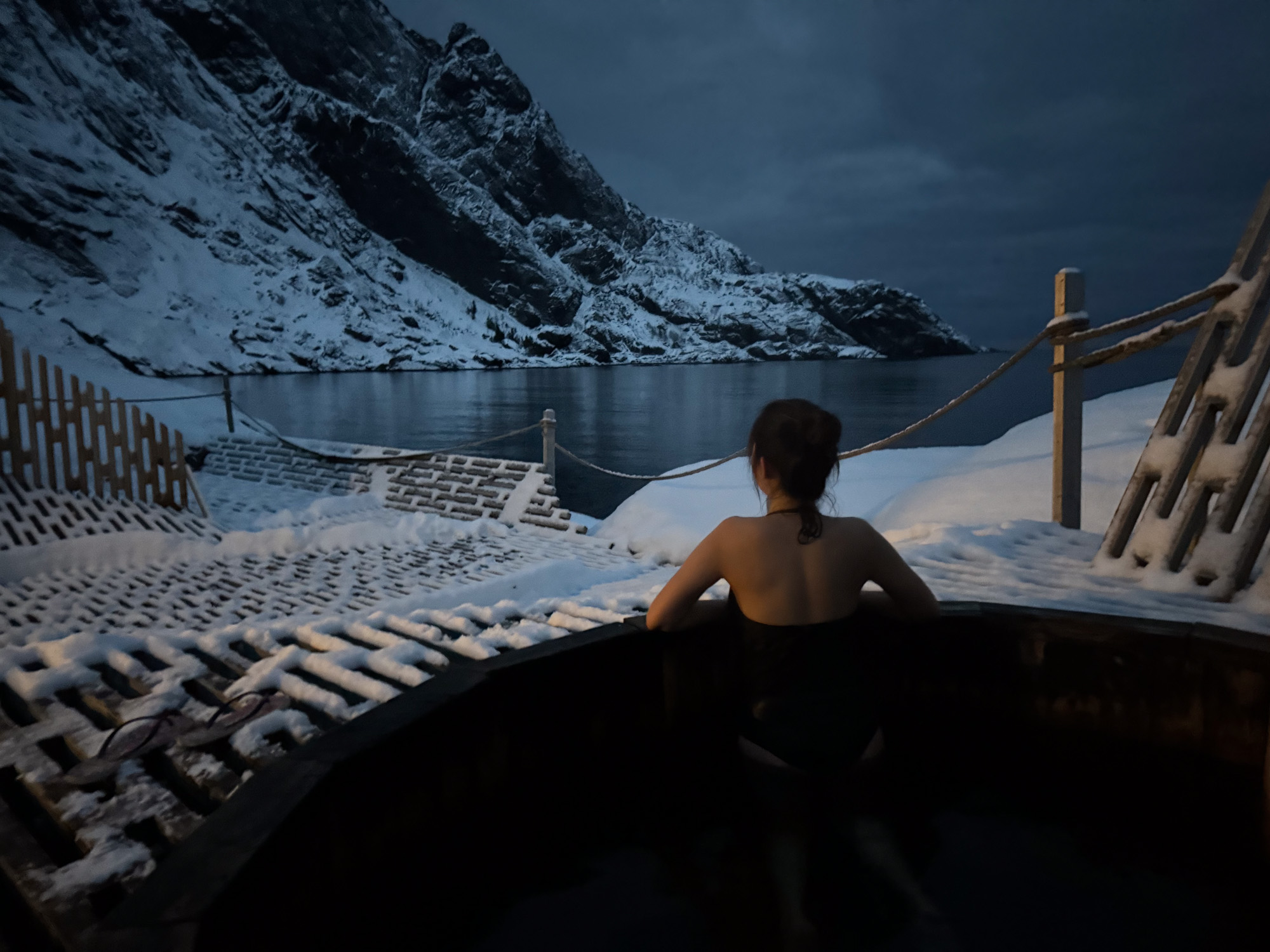Ensuite, on s’essaye à une nouveauté. L’hôtel propose un sauna et bain chaud de l’autre côté du village. On se dit que l’on va faire comme les locaux et on s’habille en maillot de bain seulement couvert d’un peignoir et de claquettes pour le rejoindre. On est obligé de traverser le petit port dans la neige, ça refroidit les pieds mais finalement on y arrive sans se transformer en glaçon.