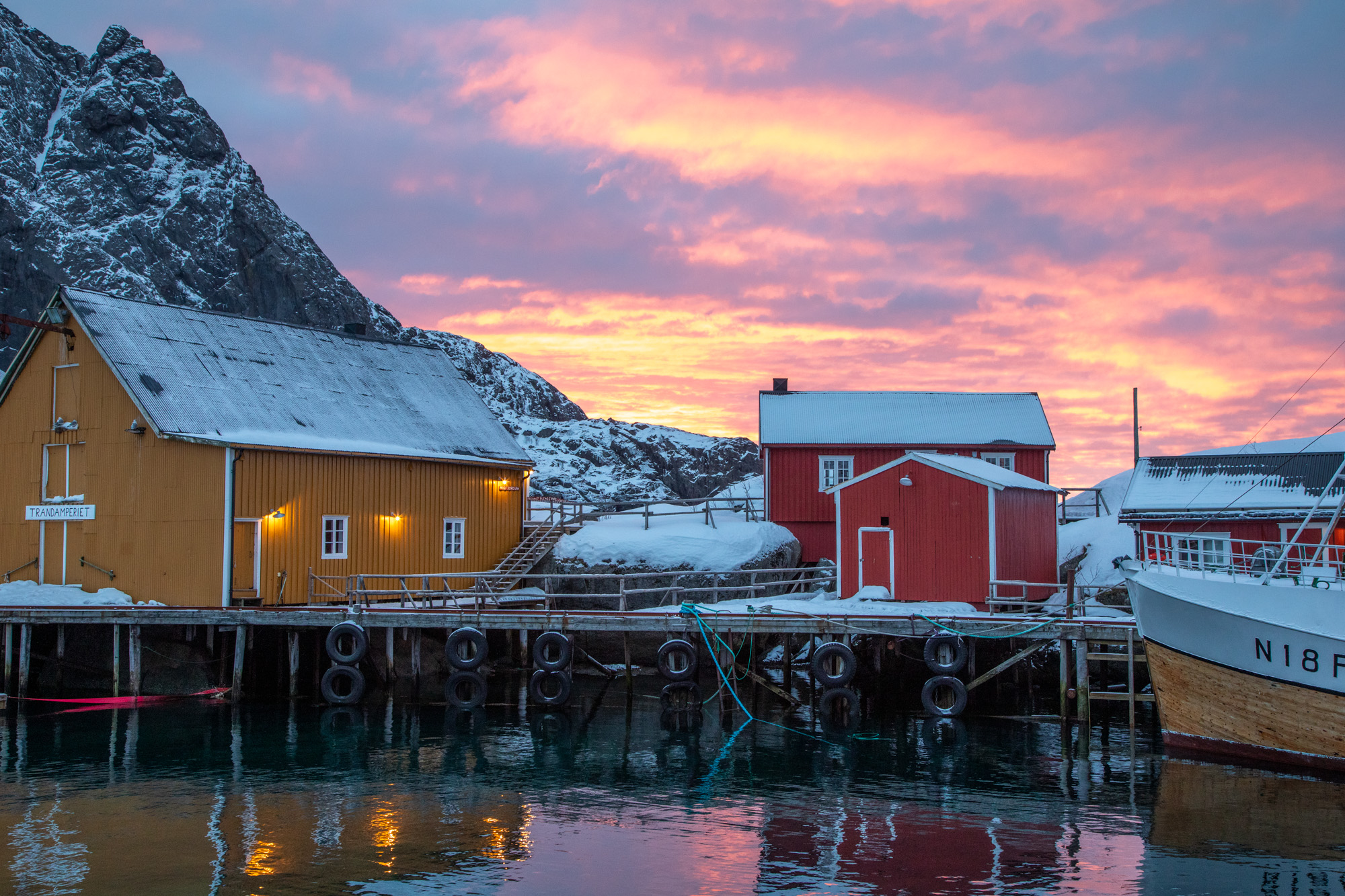 Nous nous réveillons au coeur du Nusfjord et la journée commence avec encore un superbe lever de soleil. Le ciel s’embrase au-dessus des maisonnettes du port.