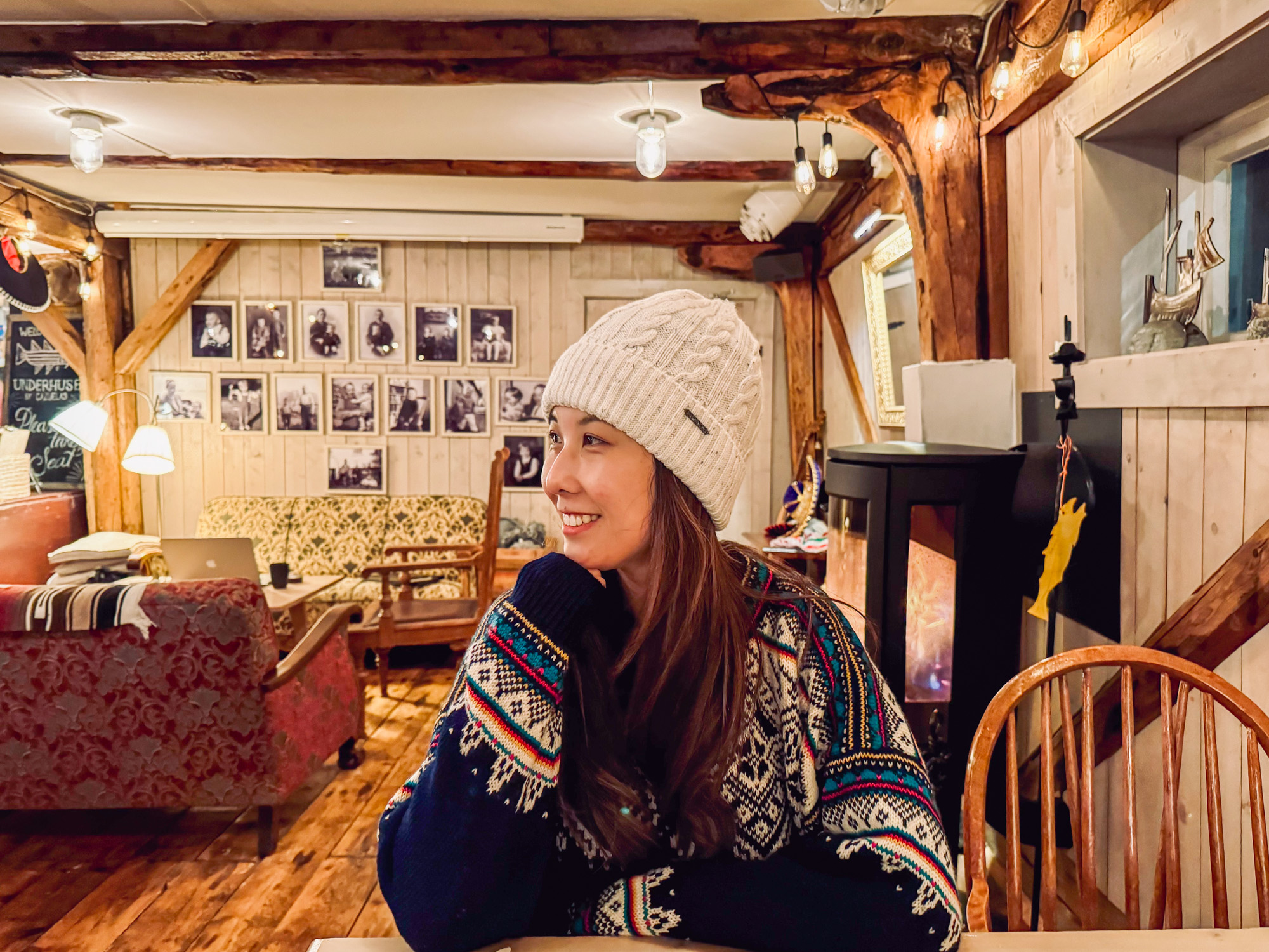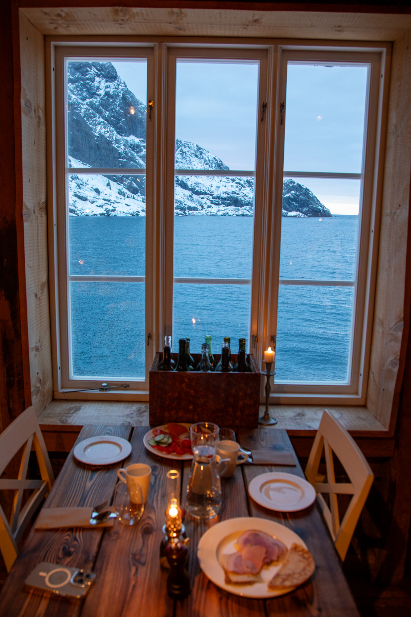 On rejoint le restaurant de l’hôtel qui est installé dans un ancien bâtiment du port. La décoration est très chaleureuse et les fenêtres donnent sur le fjord, il y a vraiment beaucoup de choix. Cet hôtel est notre meilleure expérience du séjour entre le cadre enchanteur, le rorbu au bord de l’eau, le spa dans la neige et le restaurant. On serait bien resté une journée de plus…