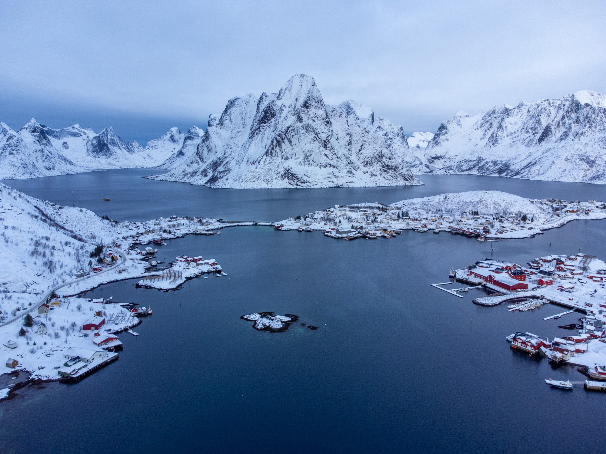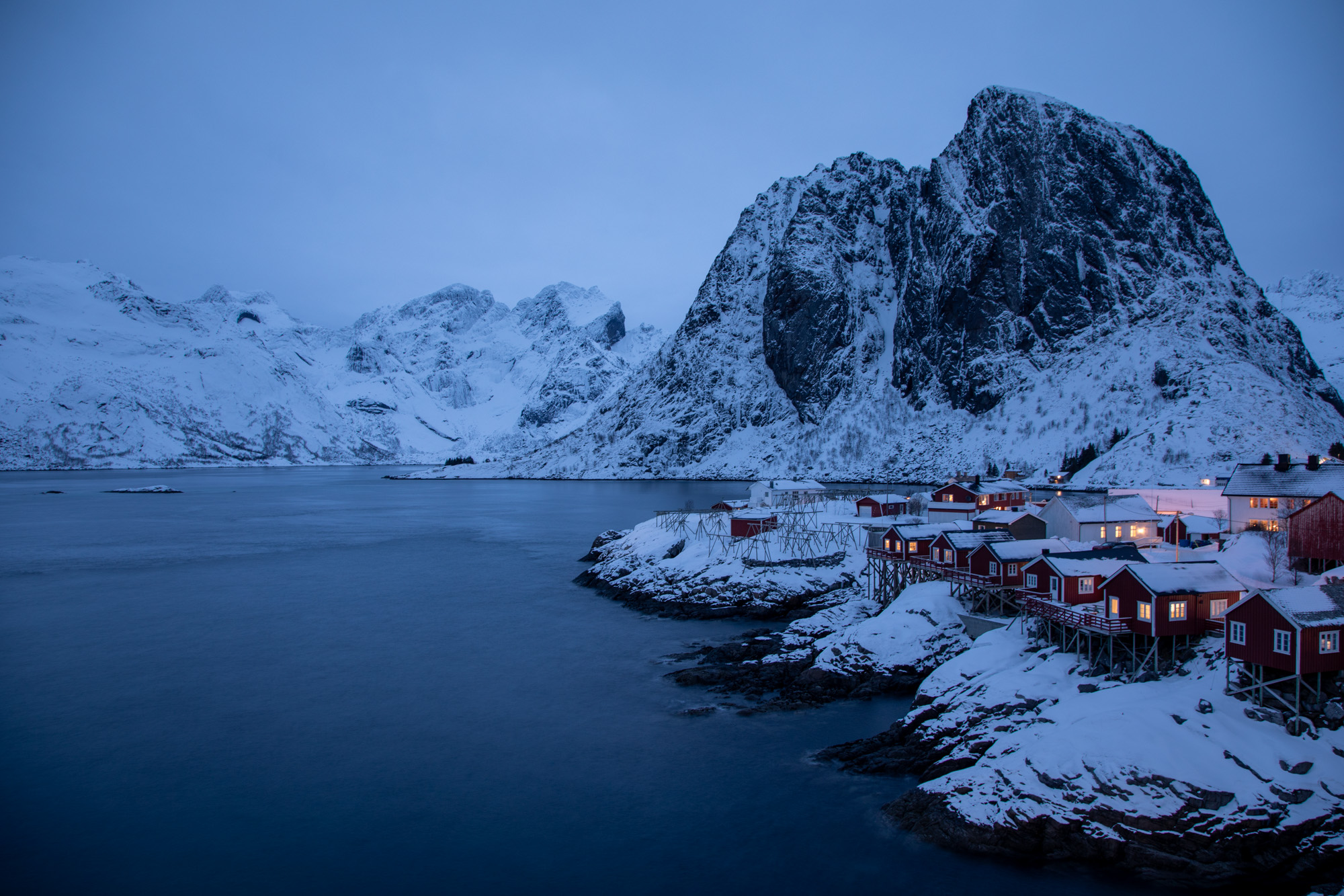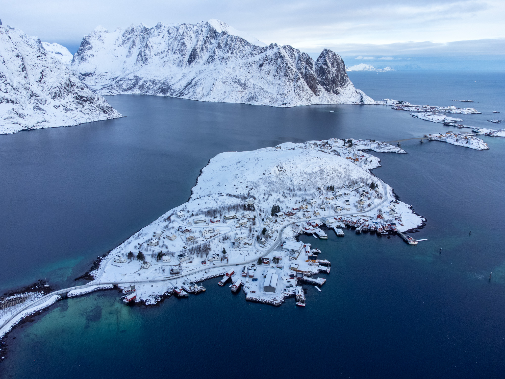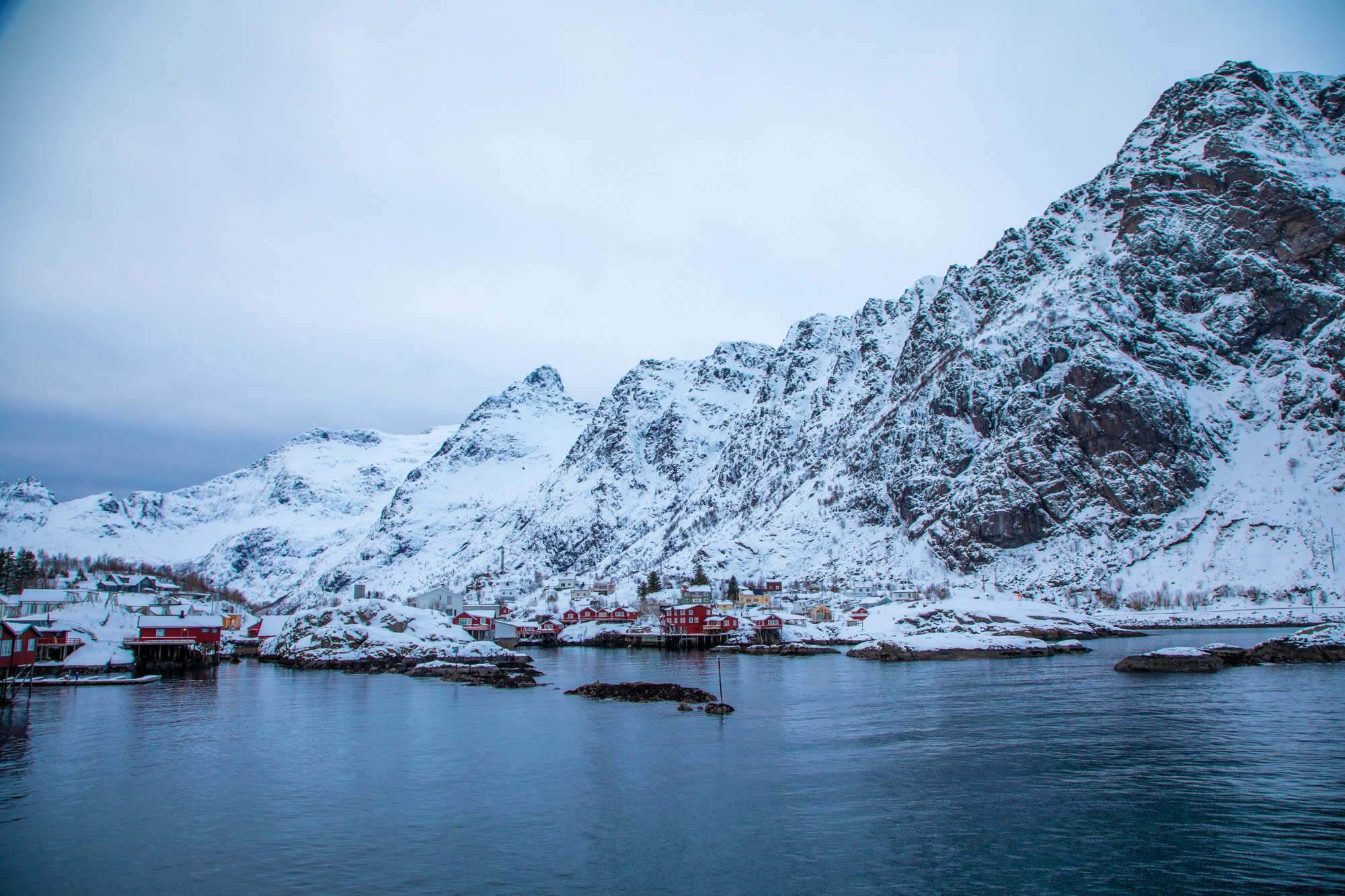 Nous arrivons presque au bout de la route et entrons dans la partie la plus grandiose des îles Lofoten. A Reine, le petit village de pêcheurs s’est construit sur des îlots rocheux au beau milieu d’un immense cirque de montagnes enneigées qui plongent dans l’eau glacée des fjords. Le paysage changeant nous offre une lumière différente tout au long de la journée, c’est un décor fantastique qui mérite à lui seul le long voyage jusqu’ici.