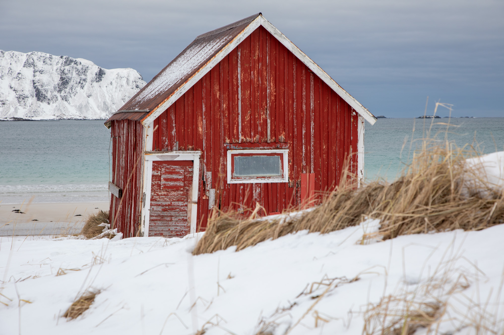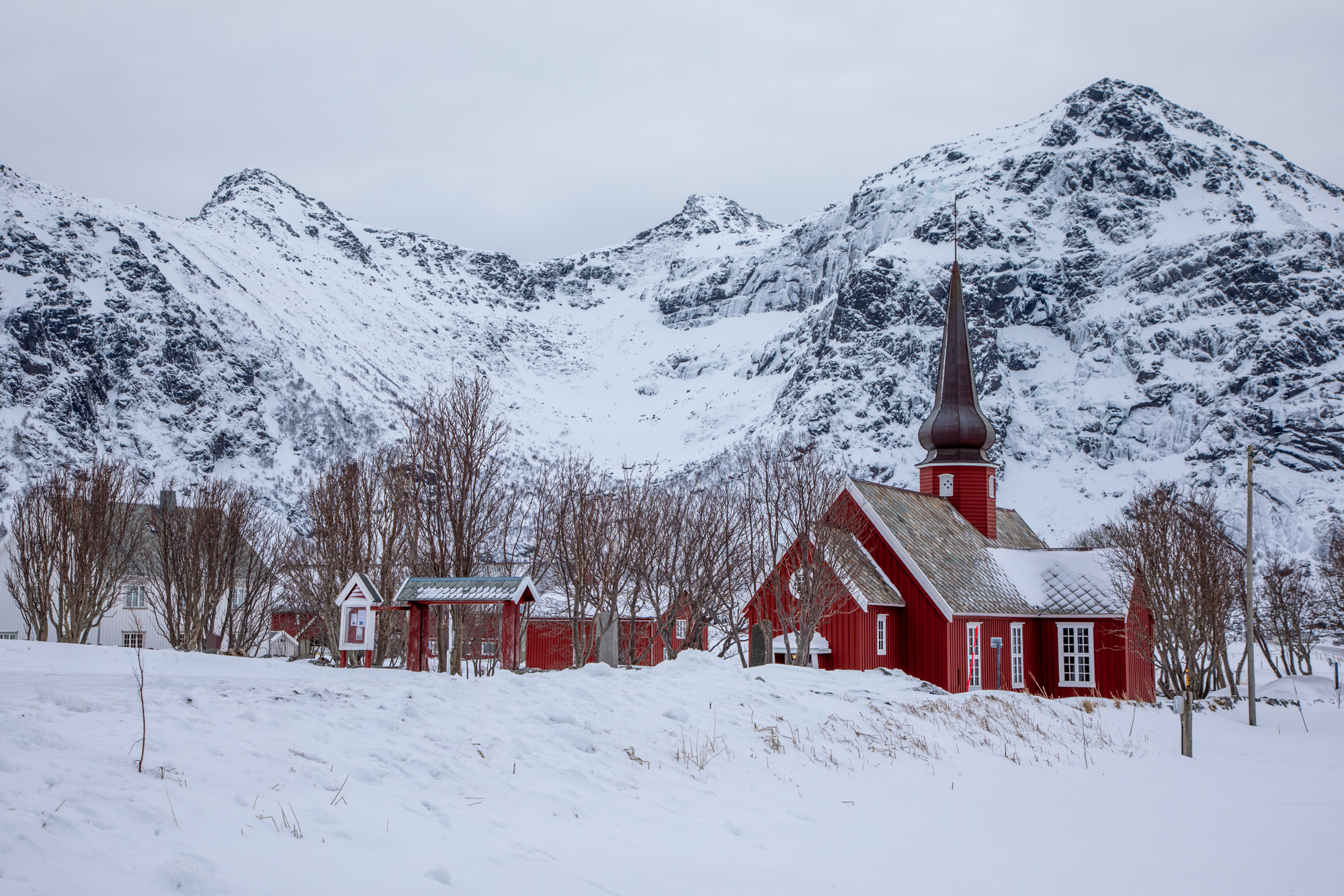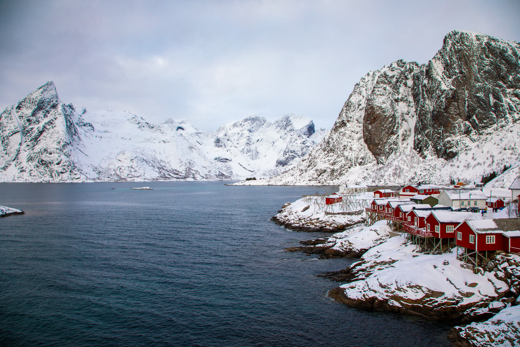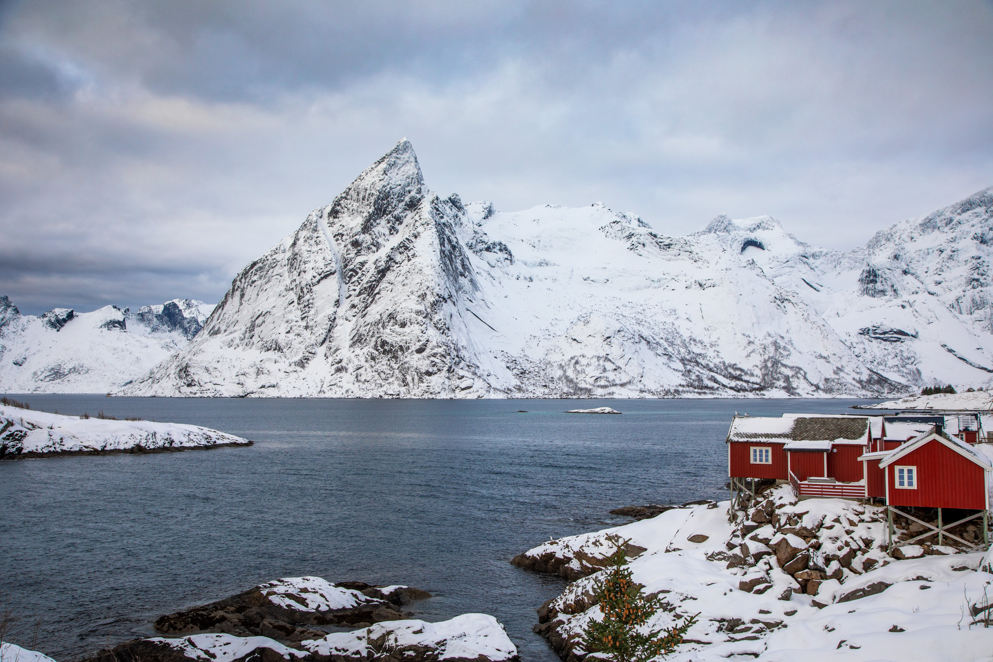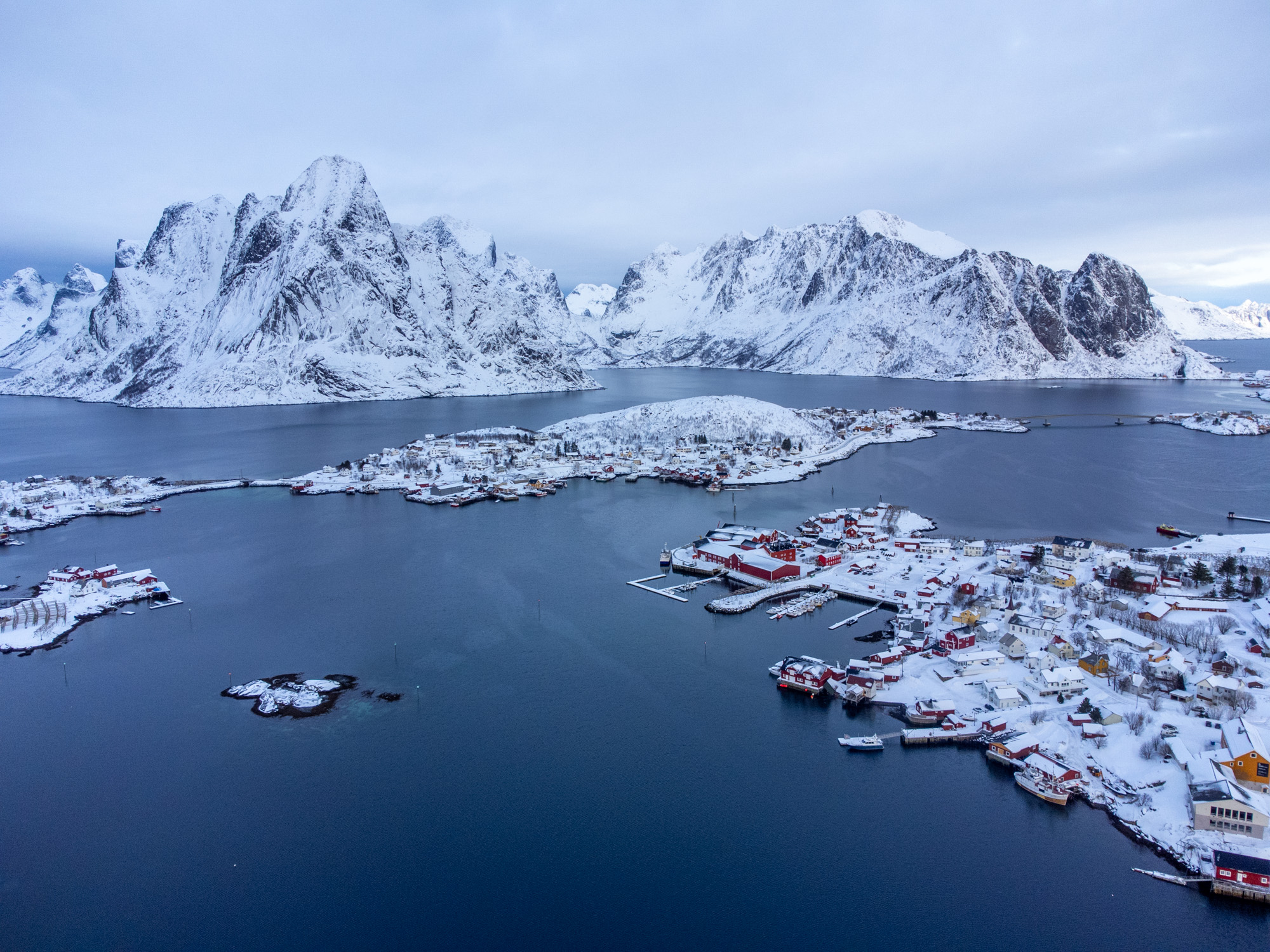 Nous arrivons presque au bout de la route et entrons dans la partie la plus grandiose des îles Lofoten. A Reine, le petit village de pêcheurs s’est construit sur des îlots rocheux au beau milieu d’un immense cirque de montagnes enneigées qui plongent dans l’eau glacée des fjords. Le paysage changeant nous offre une lumière différente tout au long de la journée, c’est un décor fantastique qui mérite à lui seul le long voyage jusqu’ici.