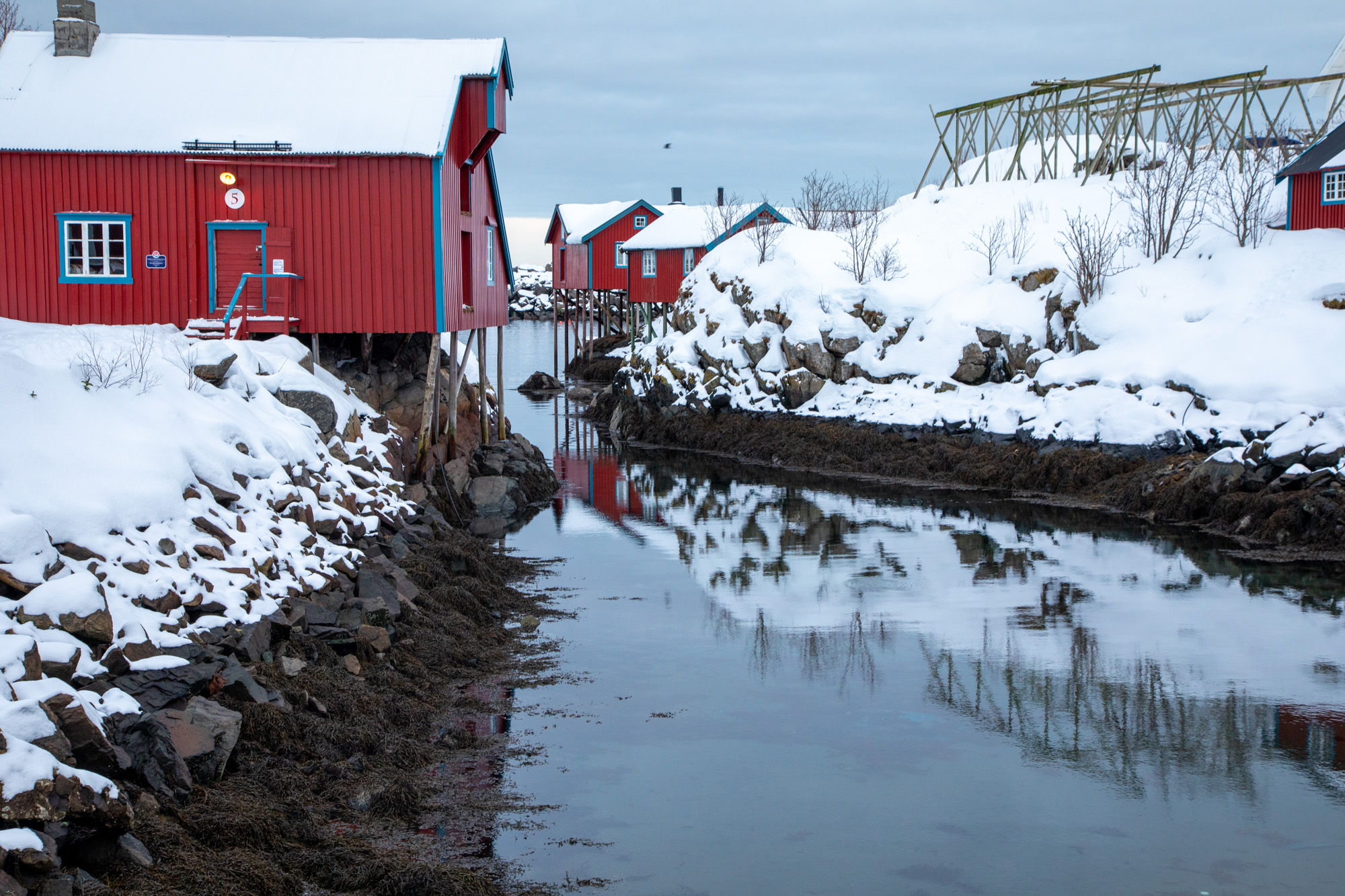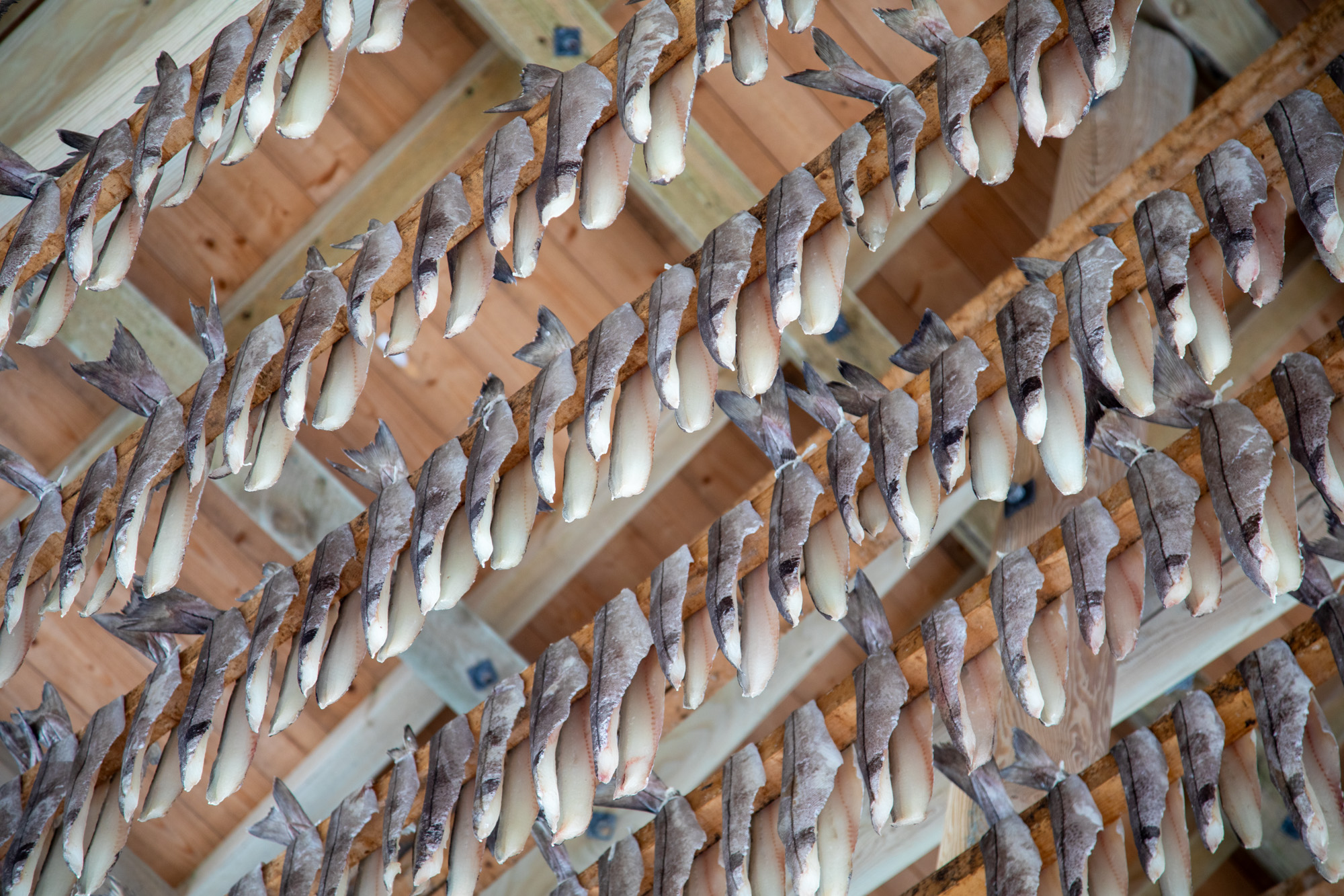 On continue notre découverte de la région de Reine en suivant la route qui traverse plusieurs îlots rocheux où sont installées quelques maisons. Sur Sakrisøy, il y a un hangar à côté du restaurant de Anita's Sjømat, une excellente adresse d’ailleurs, où de nombreux poissons sont en train de sécher.