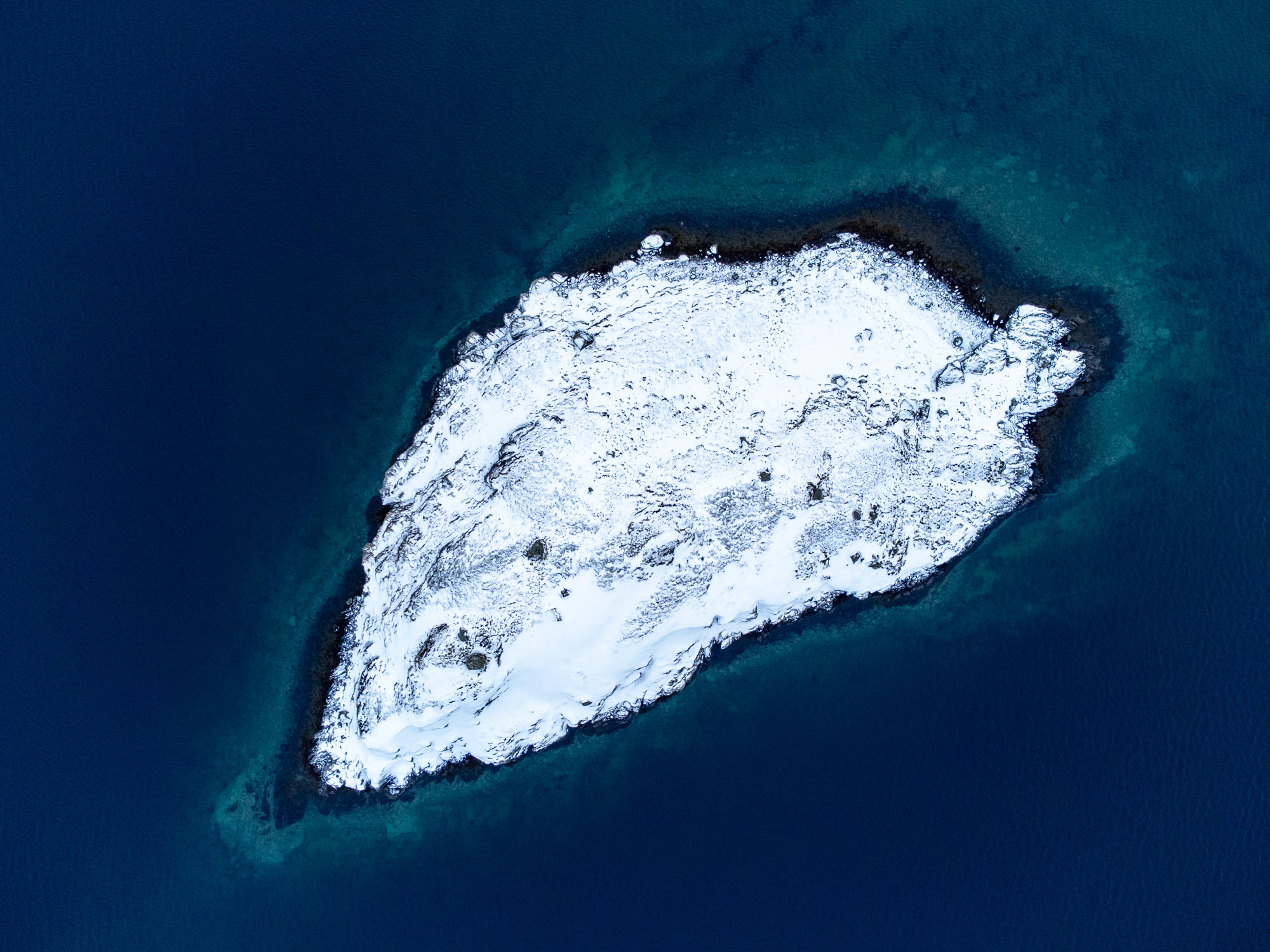 Le paysage devient beaucoup plus large maintenant que l’on arrive sur la face Nord des îles, les vagues sont beaucoup plus fortes de ce côté. Une grande plage de sable couverte de neige borde la mer de couleur bleue claire. Au loin, les montagnes sont très acérées.