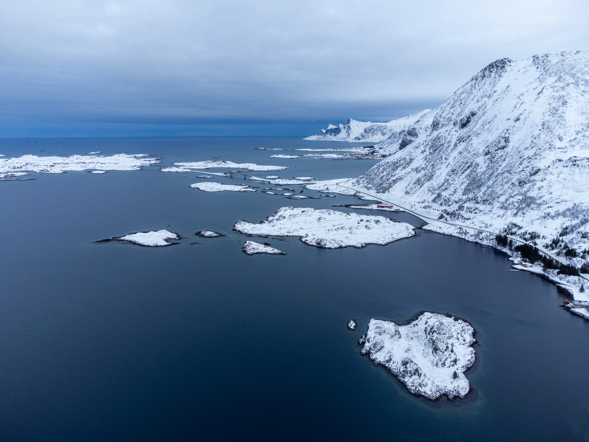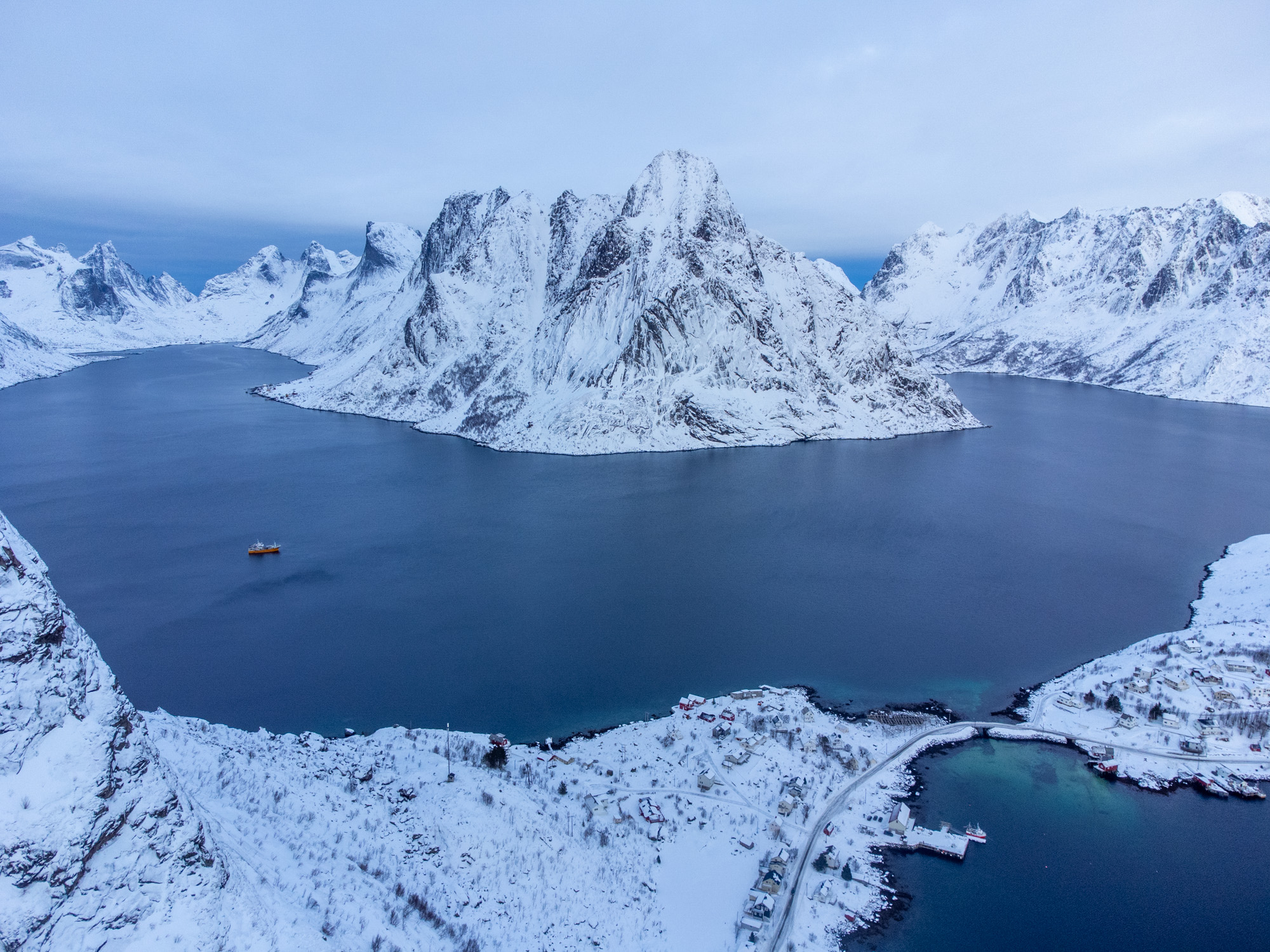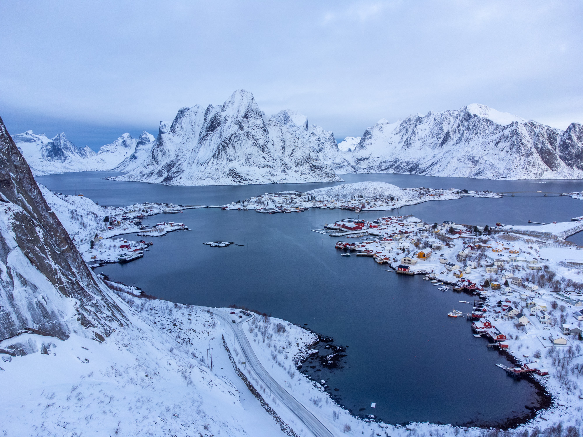 On voulait voir si la randonnée jusqu’au Reinebringen était accessible en hiver mais on voit bien que le chemin est impraticable avec la neige. Cela semble très dangereux et il n’y a d’ailleurs de trace de pas; Dommage c’est probablement un des plus beaux points de vue toute la Norvège. On reste raisonnable et on retourne à la voiture. A la place de monter à pied, on sort une fois de plus le drone et on le fait voler proche de la montagne pour avoir une vue similaire, c’est vraiment impressionnant depuis tout là haut avec la route qui passe d’une île à l’autre et le village de Reine qui semble si petit.