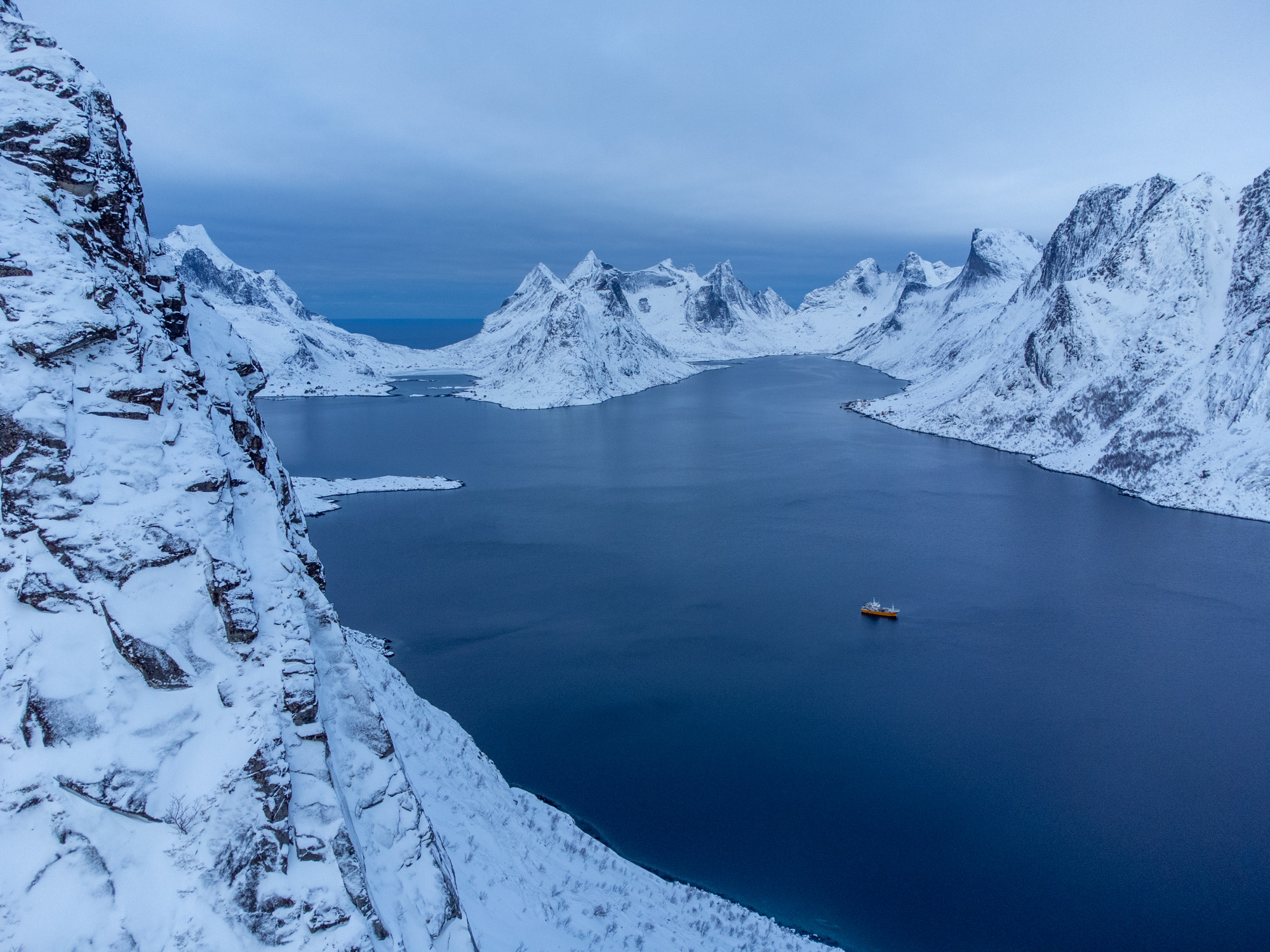 On survole jusqu’à l’arrière de la montagne et on a une vue sur un fjord avec un bateau de pêcheurs bien seul.