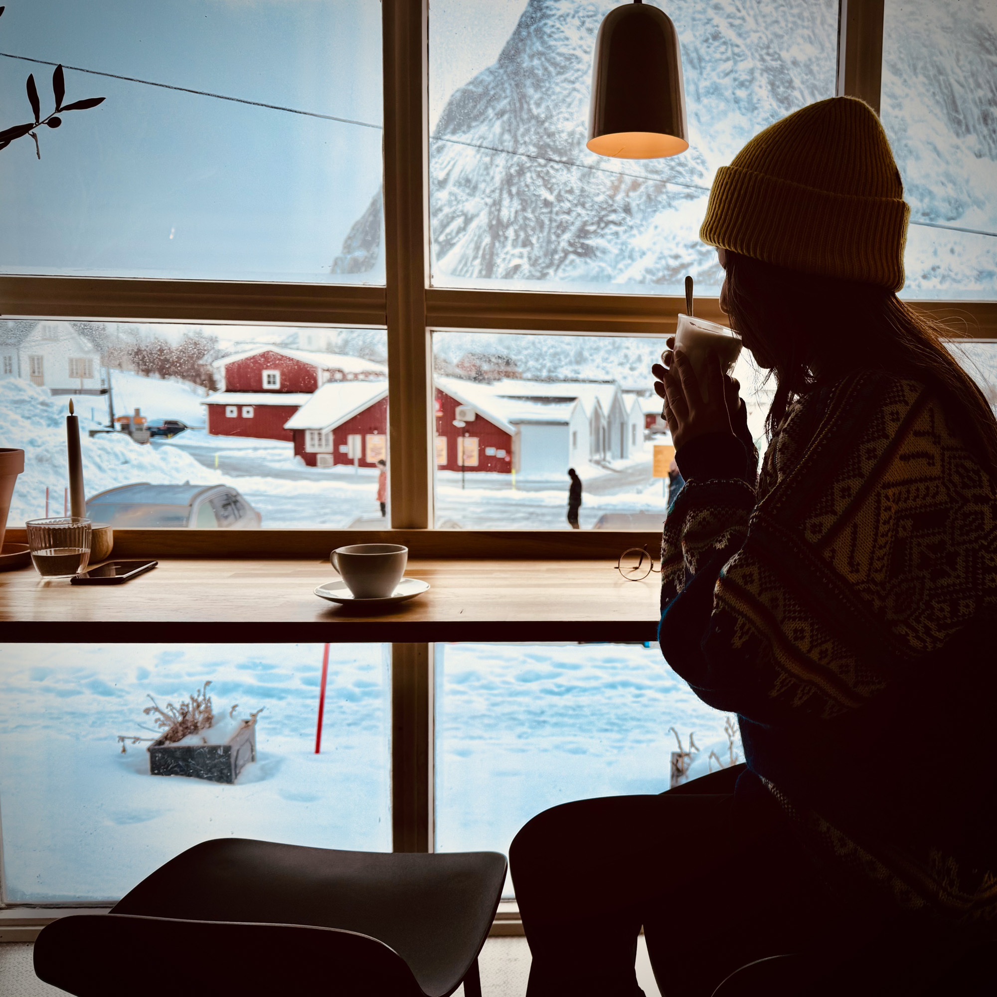 Il a plu toute la nuit, comme à notre habitude on a quand même espéré que la tempête laisse la place à un ciel plus clément pour chercher les aurores boréales mais cette soirée là on n’avait peu d’espoir. Le matin il neige encore et on décide de prendre notre temps, on retourne à Reine pour prendre un petit déjeuner dans un petit café.