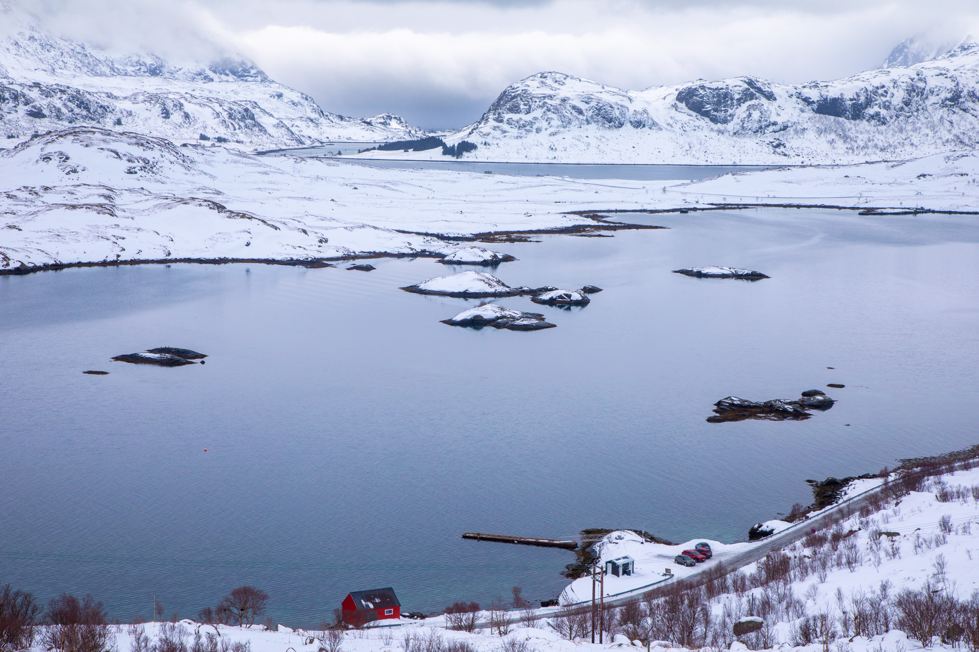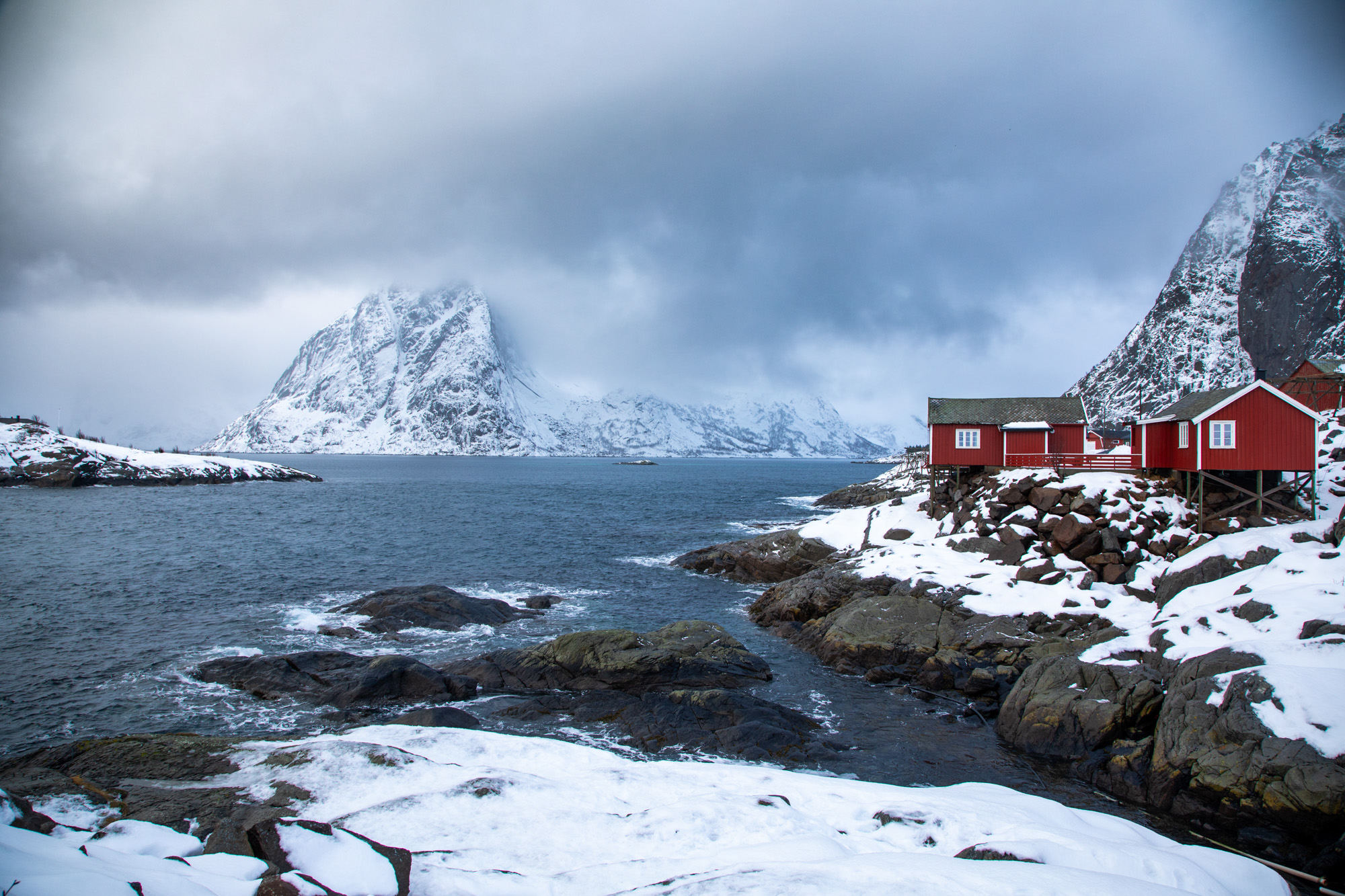 Le temps est noir, mais cela a de l’allure et colle bien avec le paysage des îles Lofoten. On sent toute la brutalité des éléments et les maisons peintes en rouge viennent contraster l’ambiance noir et blanc du paysage.