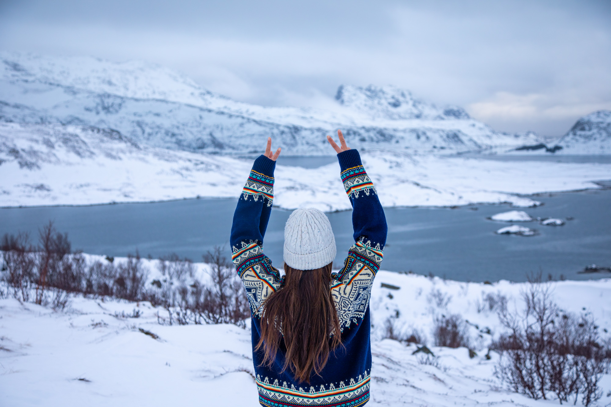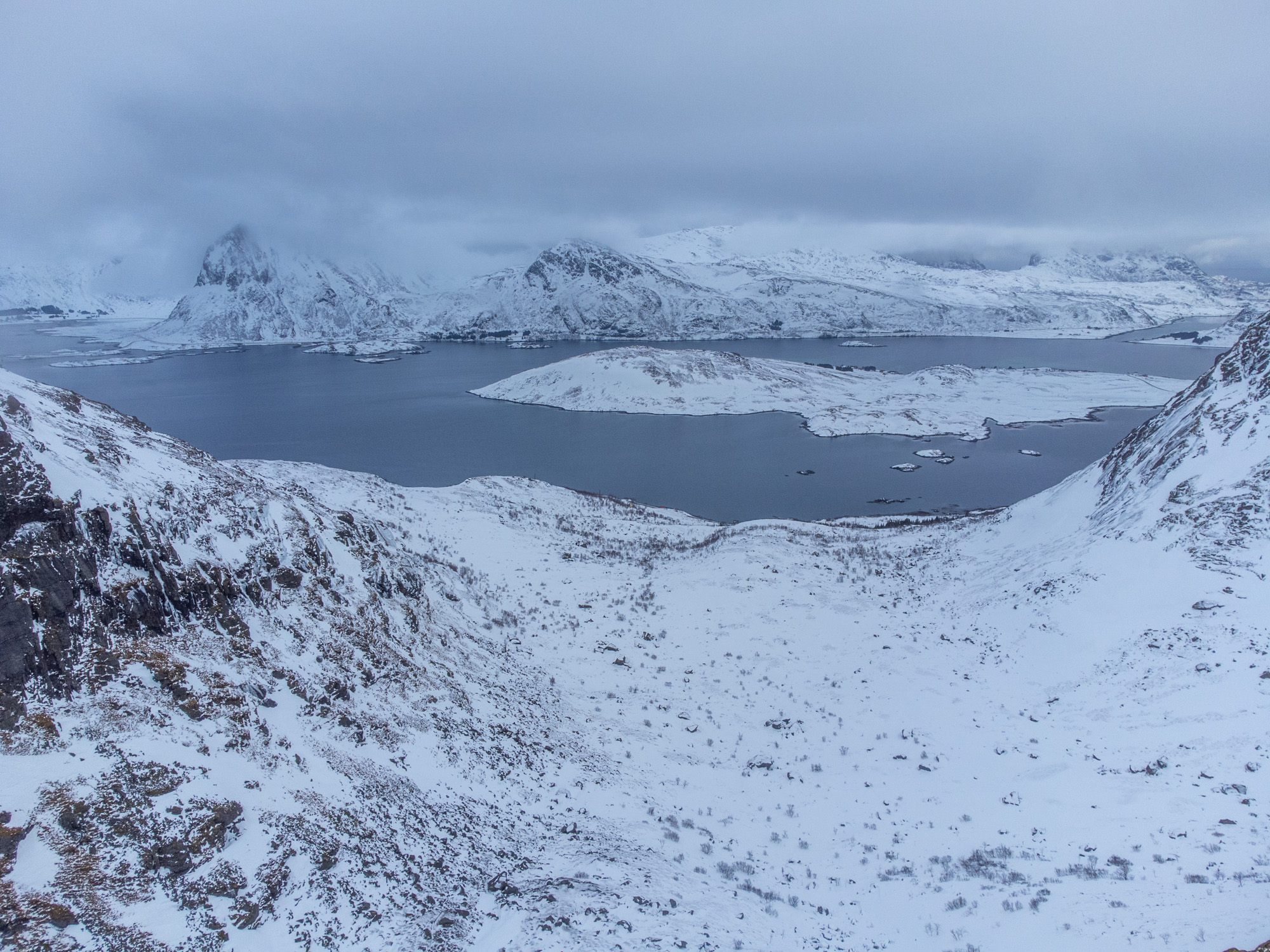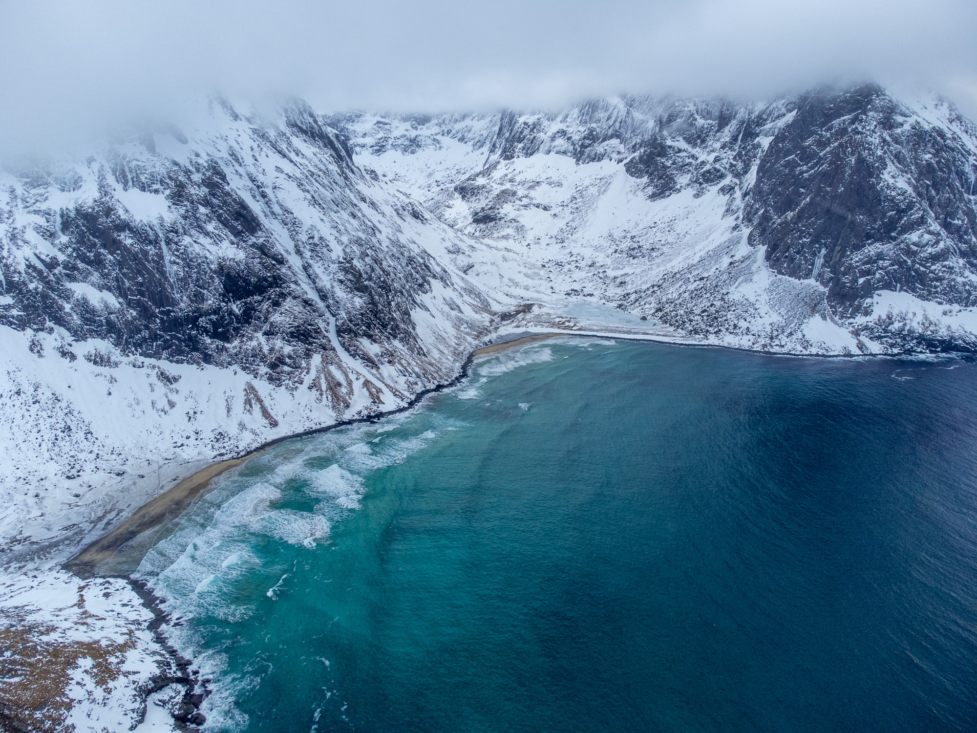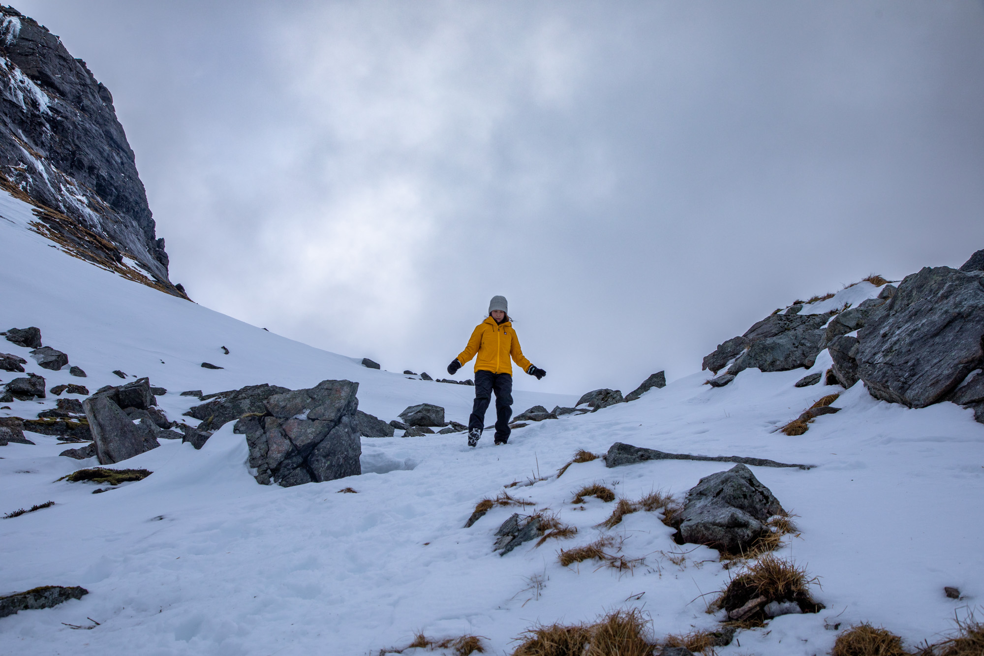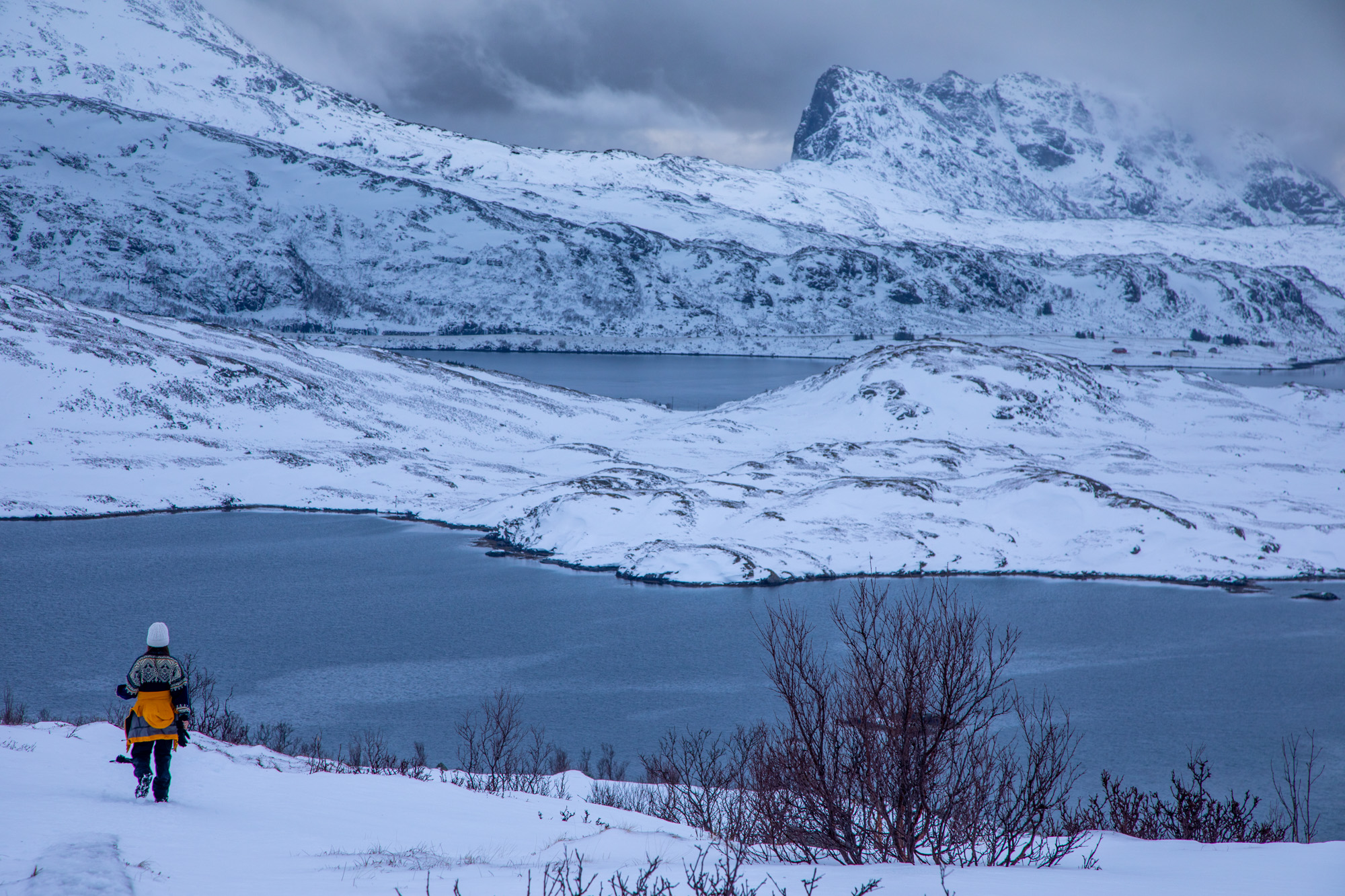 Nous sortons les crampons pour une randonnée dans la nature norvégienne, malgré le temps qui s’annonce maussade, on décide de quand même se lancer sans quelques appréhensions. On marche une demi journée en suivant un chemin recouvert de neige fraiche qui nous amène d’un fjors jusqu’à une superbe plage sauvage lovée au milieu de montagnes abruptes.