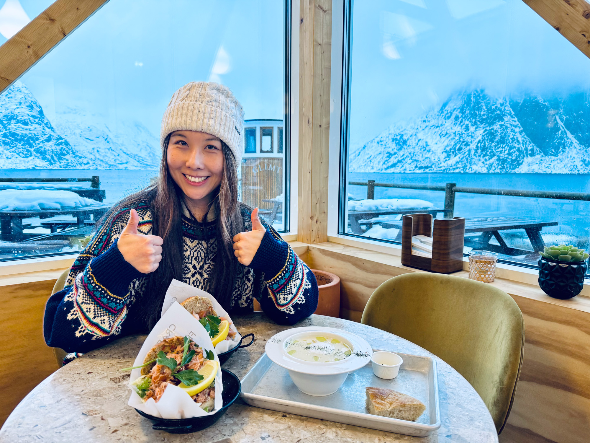 Pour se remettre de notre effort, on part manger un pique nique au restaurant de Sakrisoy. L’endroit est notre coup de coeur du voyage, c’est une usine de poisson qui fait aussi office de restaurant, il y a beaucoup de choix et on peut manger des sandwichs de poisson, et une soupe qui nous requinque. La vue est en plus au milieu du paysage grandiose de Reine au bord de l’eau.