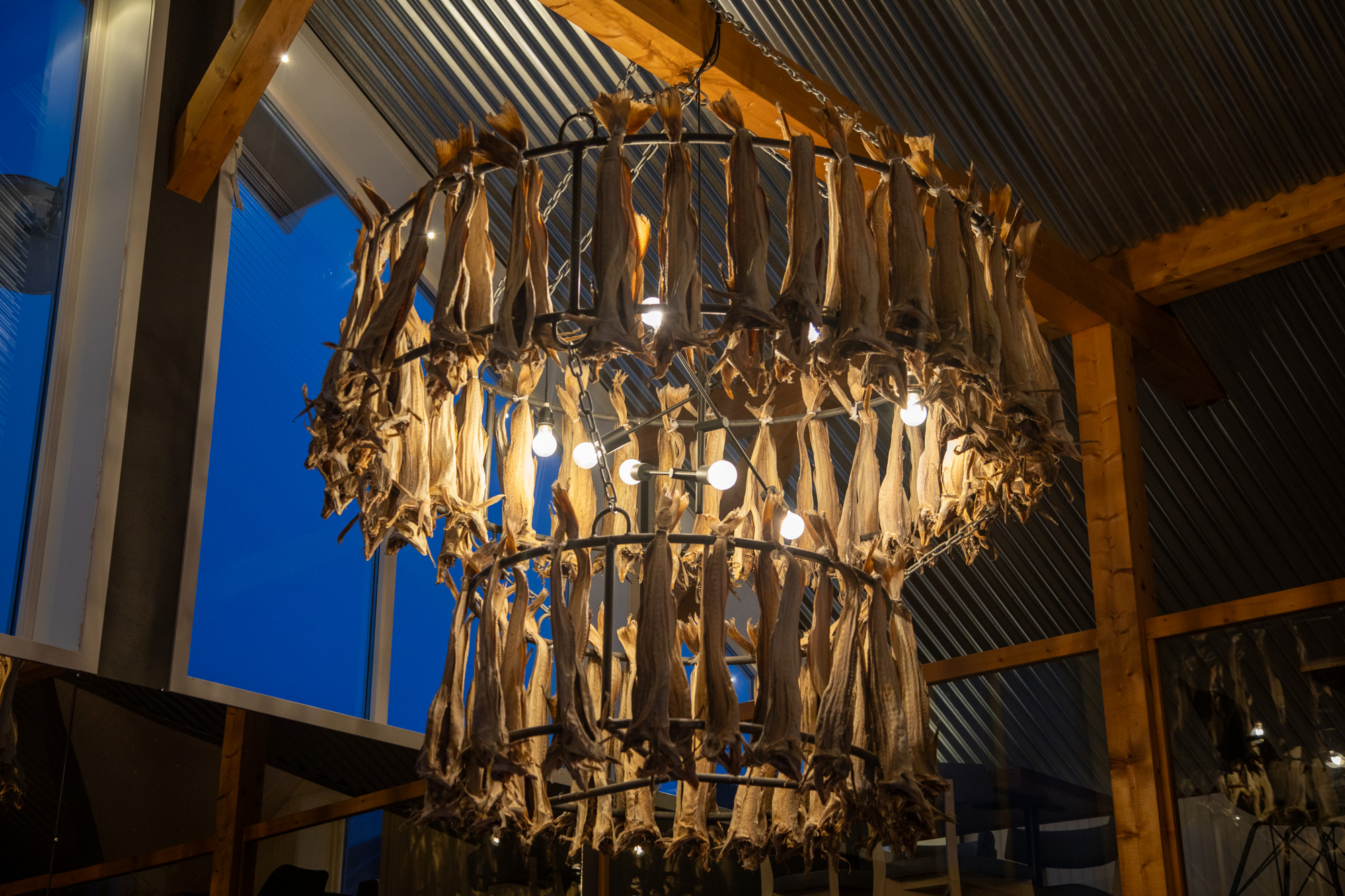 La décoration du restaurant est très bien élaborée, avec des poissons séchés partout…