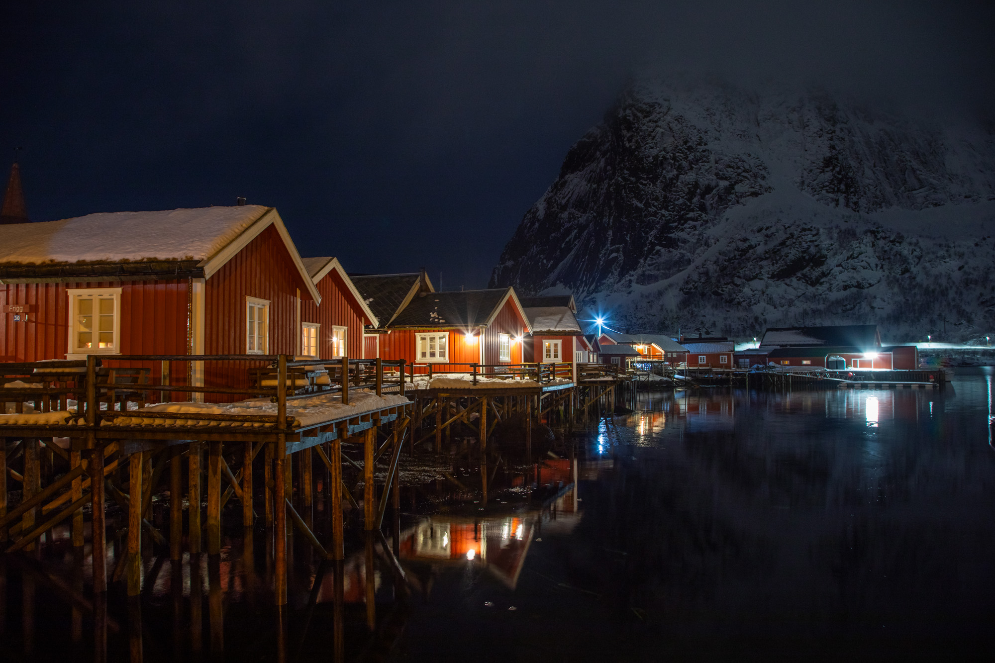 La nuit tombe toujours très tôt en ce mois de Février. On vient de manger notre déjeuner ou diner on ne sait plus trop, en tout cas après tout ça il nous faut faire de l’exercice pour digérer. On retourne découvrir Reine de nuit et de marcher dans le village pour en ressentir l’ambiance nocturne. Il n’y a pas beaucoup de monde dans les rues et il n’y a pas de restaurants ou cafés ouverts. On n’entend rien mis à part le bruit de nos crampons qui s’enfoncent dans la glace à chacun de nos pas, le port de Reine est tout calme.