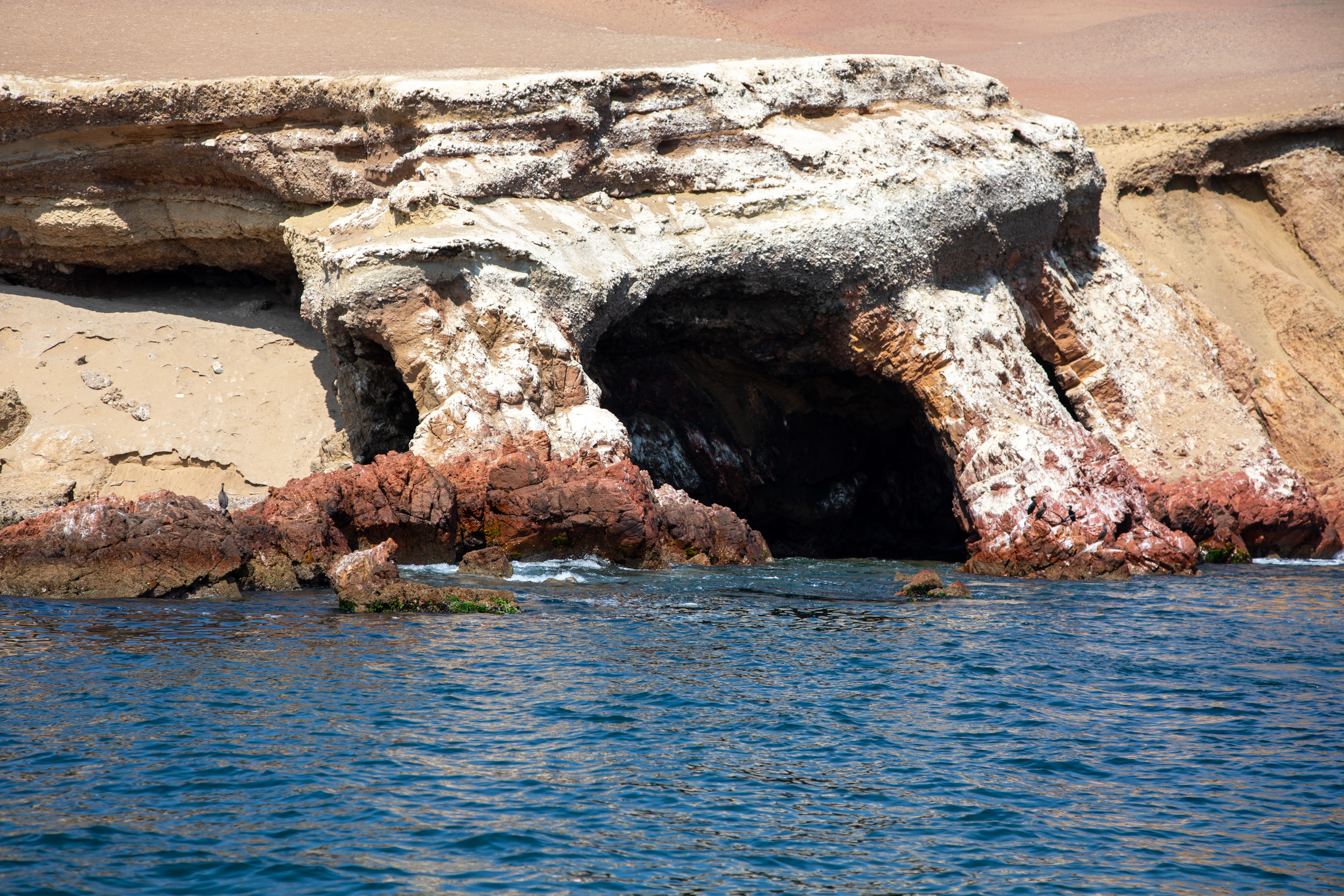 Il y a de nombreuses arches, les roches de l’île sont naturellement blanches, mais on devine que la couleur blanche qui les recouvre doit probablement venir des oiseaux…