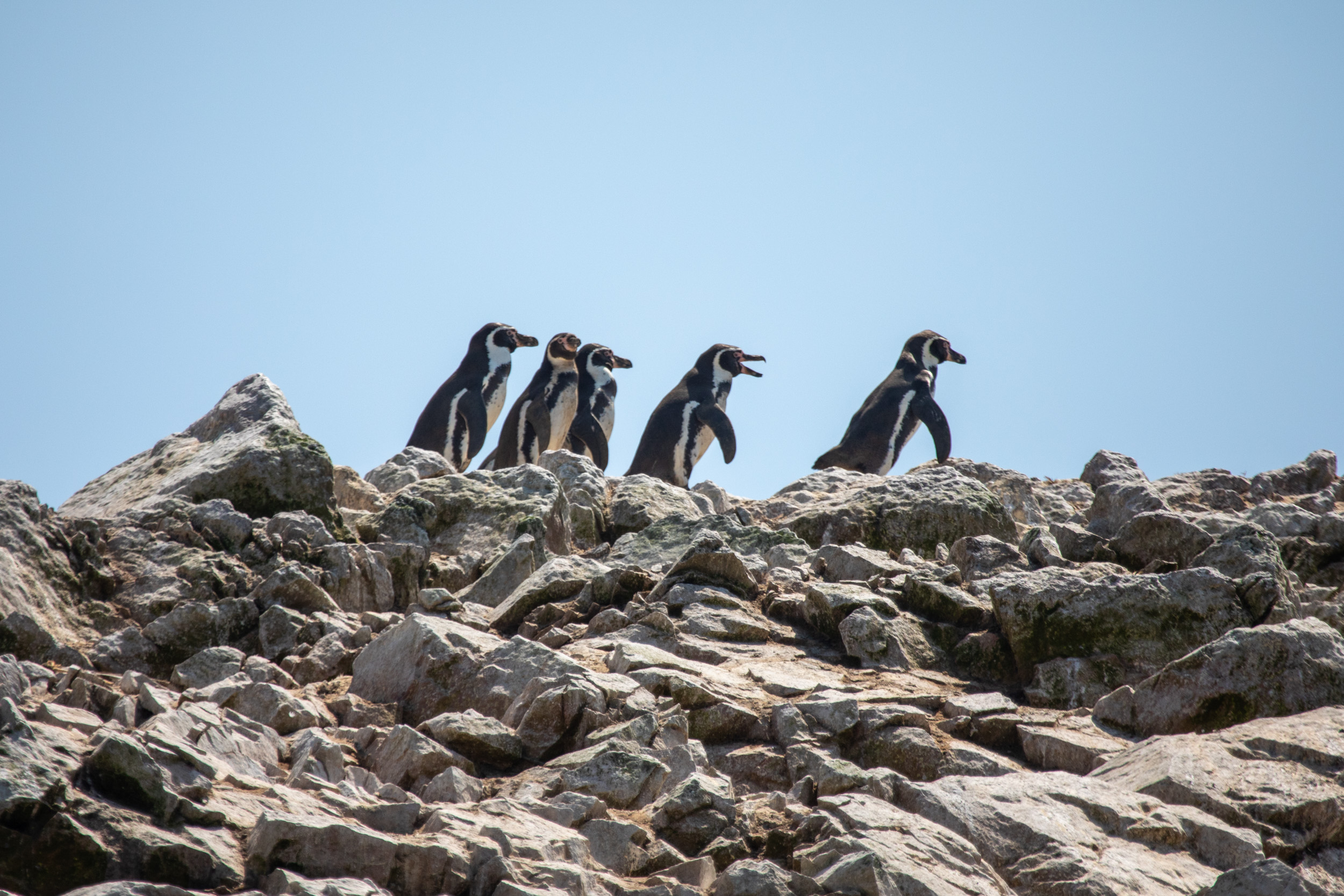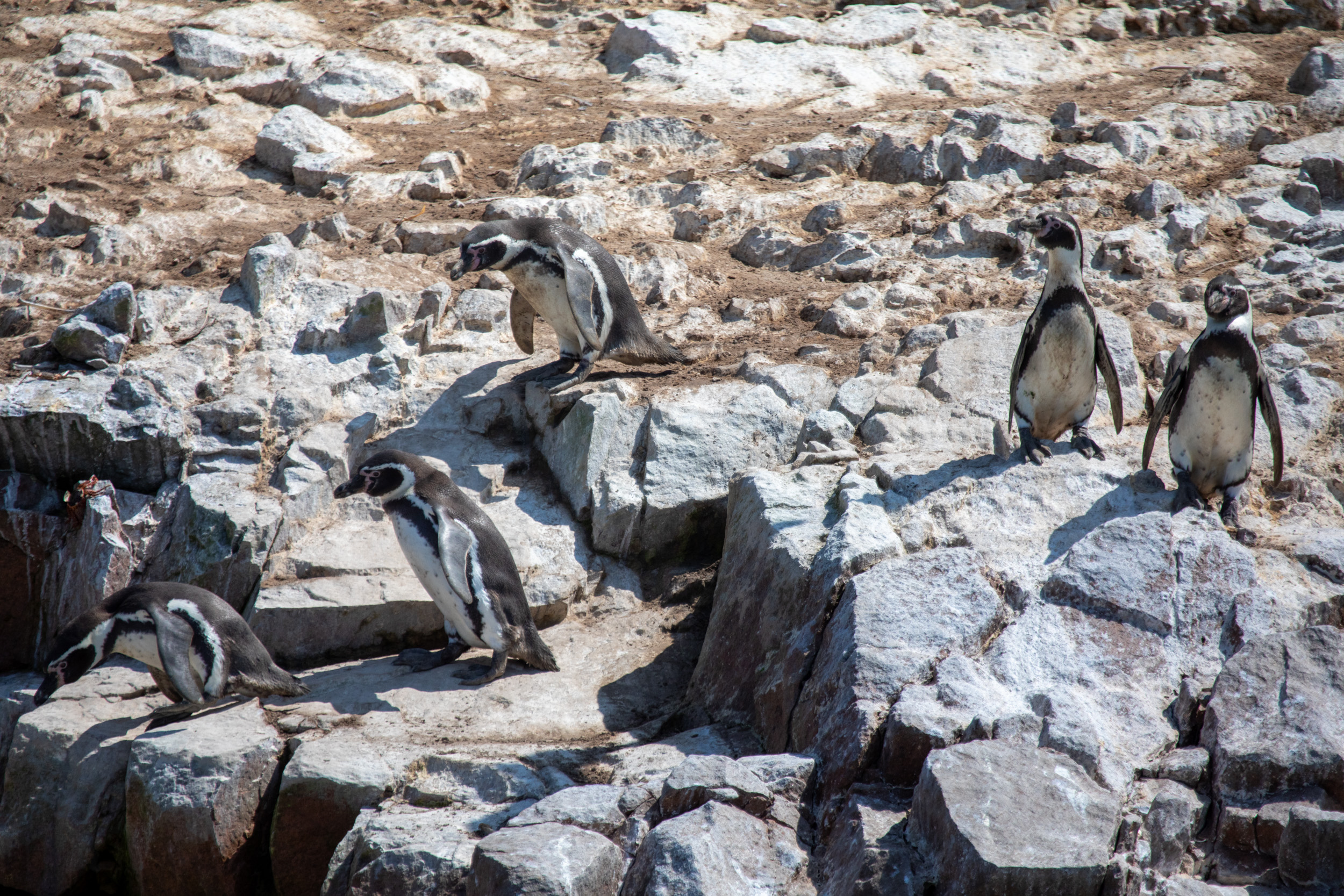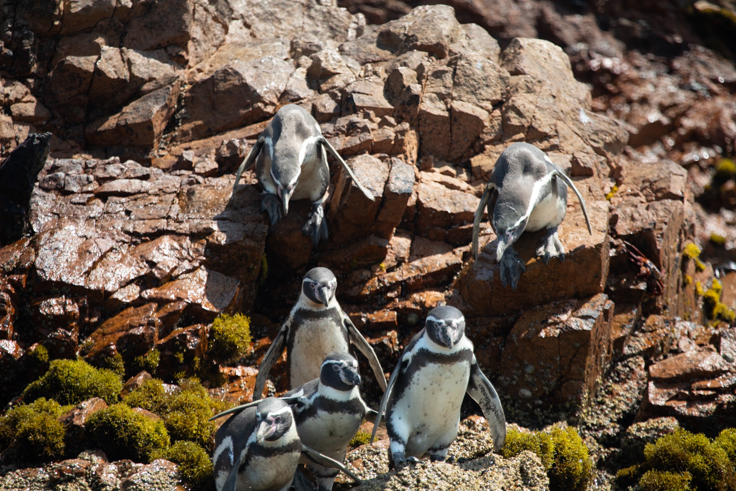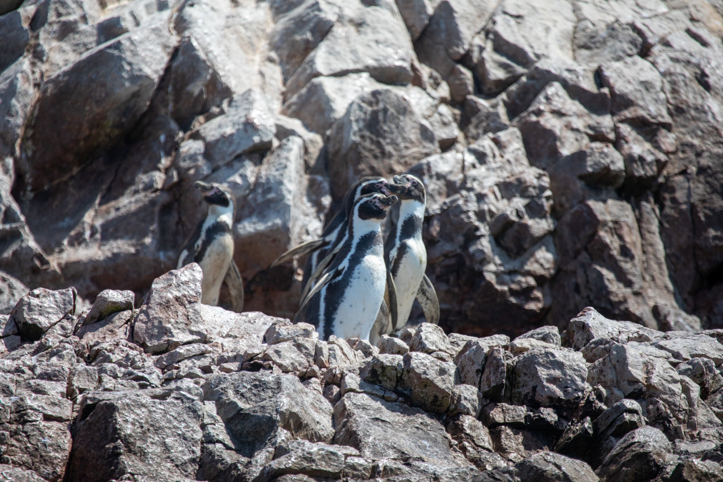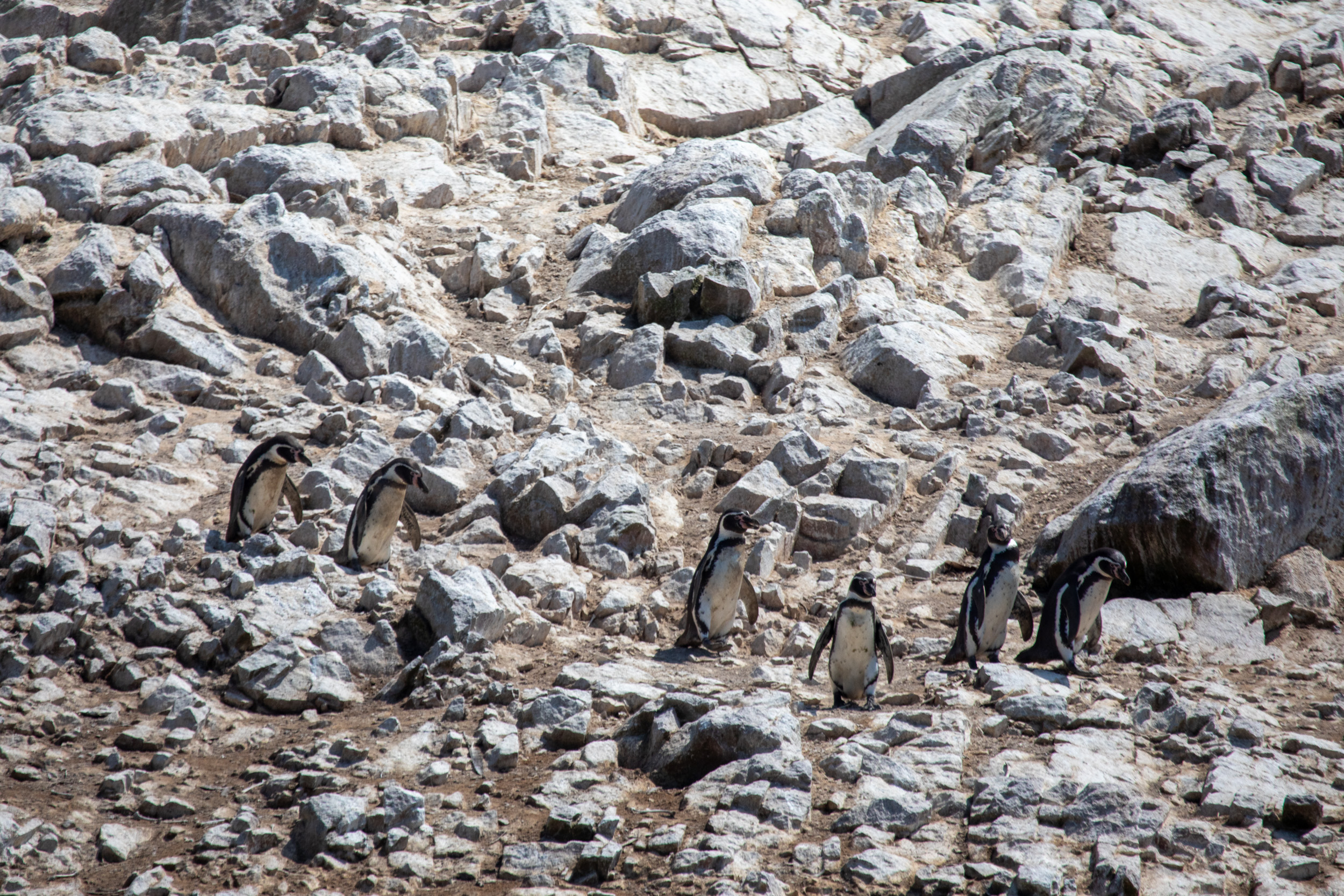 Mais le clou du spectacle, ce sont les manchots de Humboldt, ils sont tellement mignons. Leur démarche sur les pierres est vraiment adorable, ils marchent avec une certaine maladresse en file et s’approchent de la mer. Le bateau nous laisse profiter du spectacle de leur marche jusqu'à la mer où ils sont tout à coup bien plus habiles.