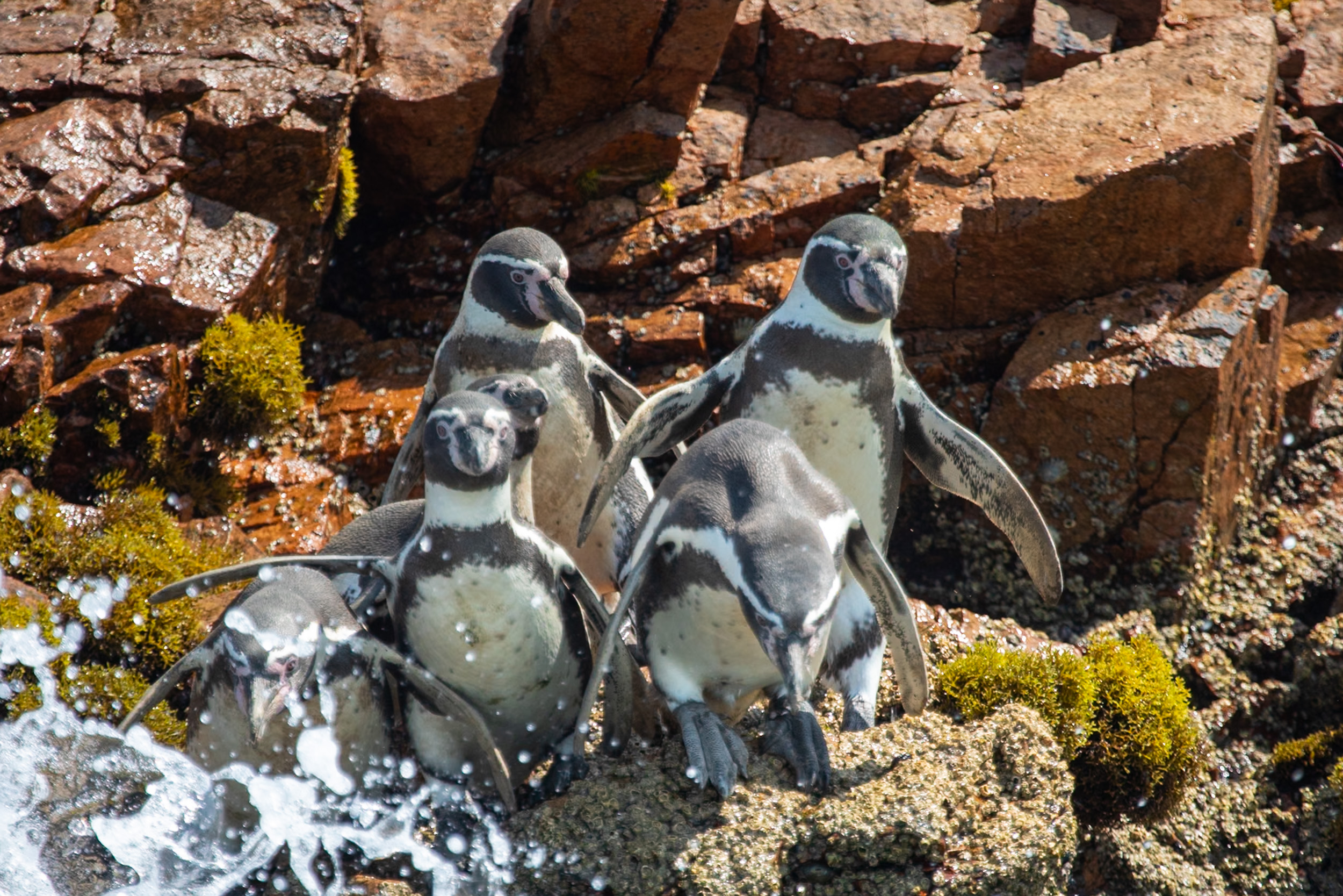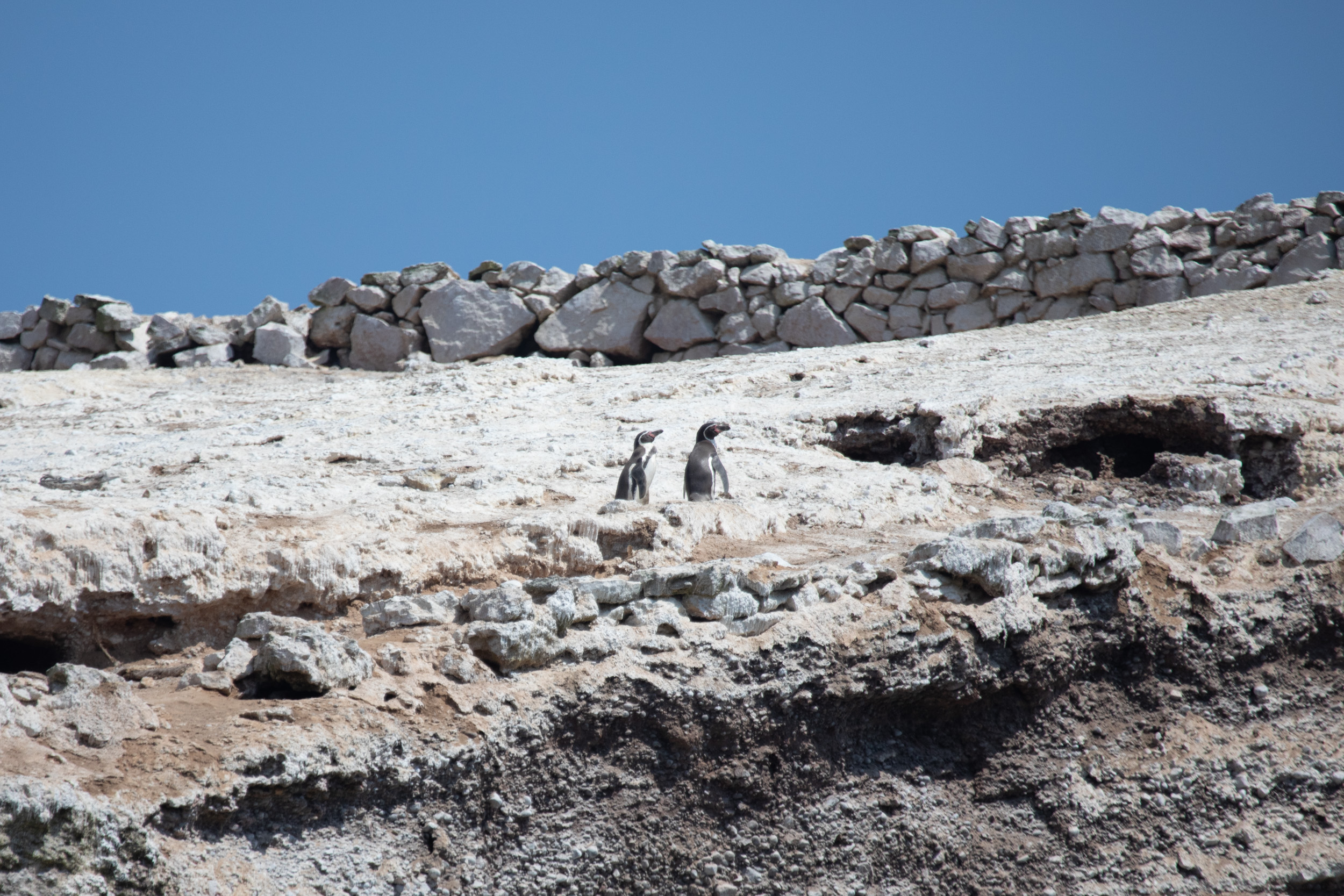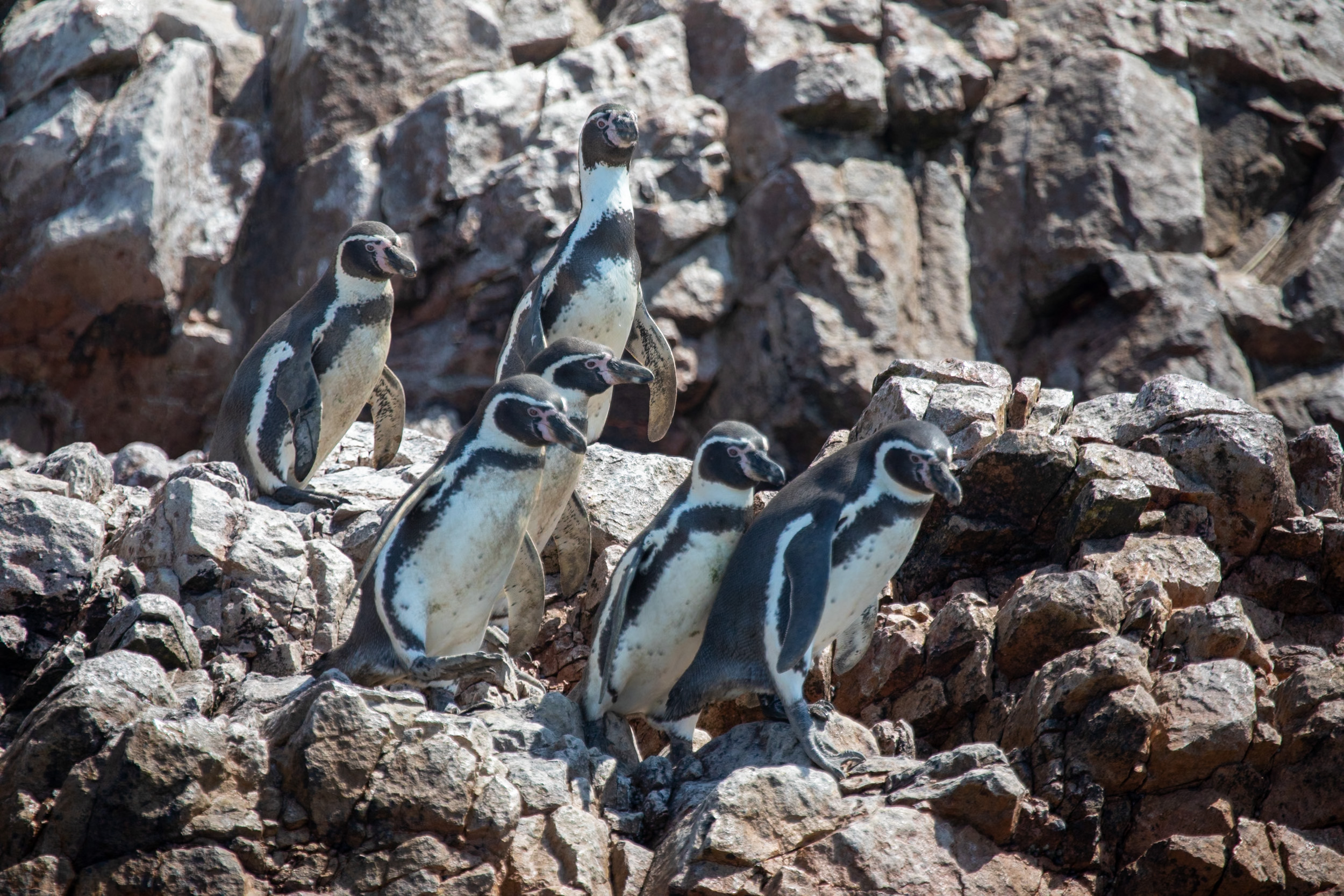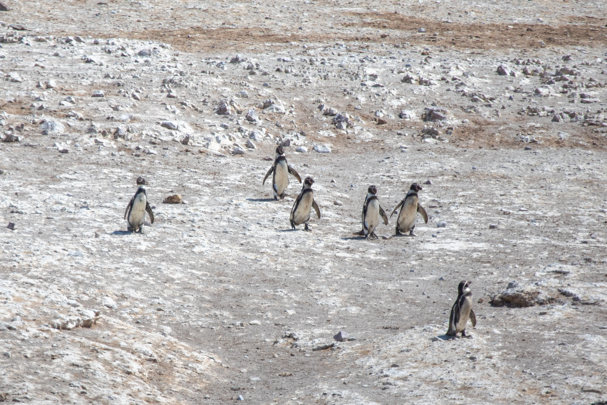 Mais le clou du spectacle, ce sont les manchots de Humboldt, ils sont tellement mignons. Leur démarche sur les pierres est vraiment adorable, ils marchent avec une certaine maladresse en file et s’approchent de la mer. Le bateau nous laisse profiter du spectacle de leur marche jusqu'à la mer où ils sont tout à coup bien plus habiles.