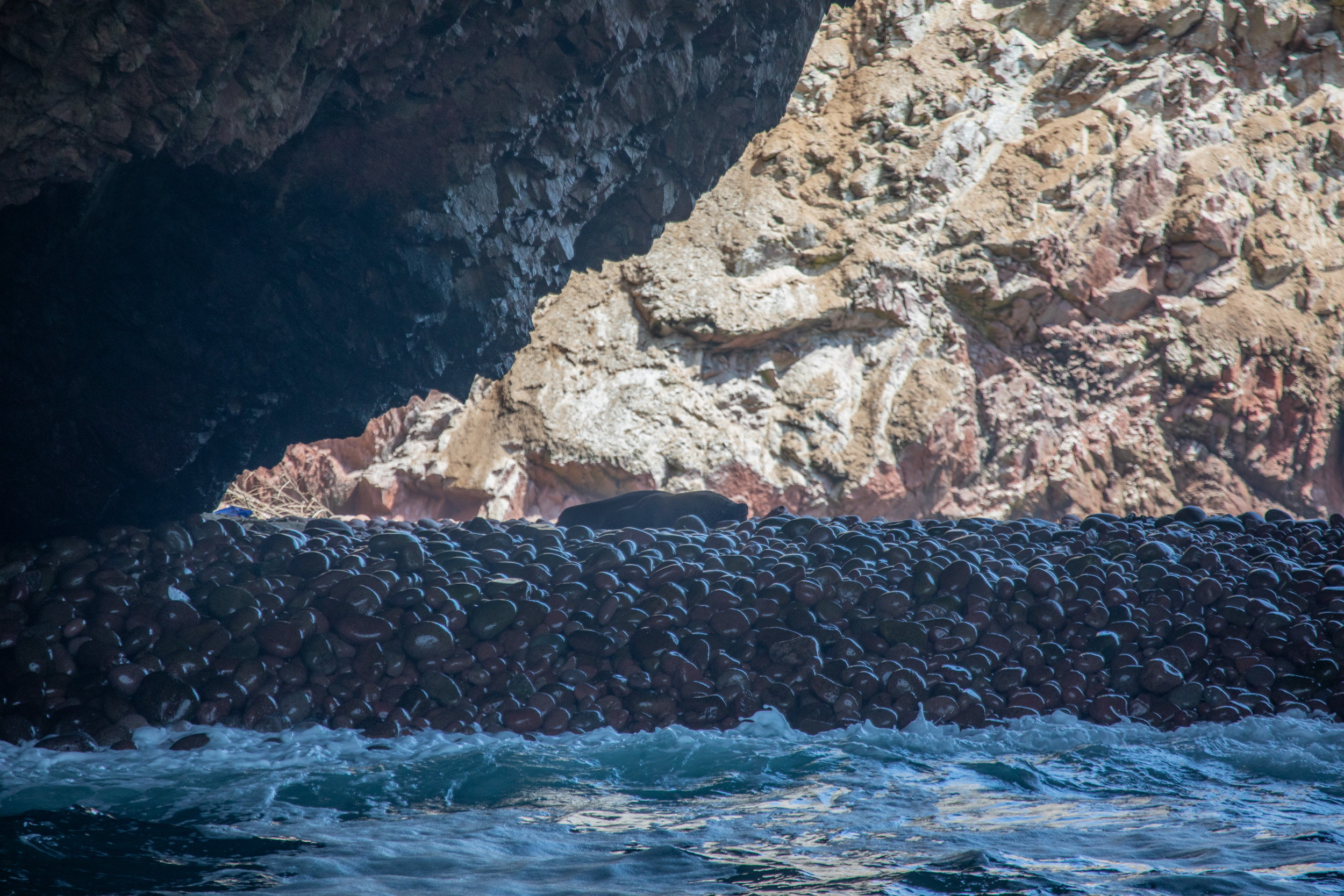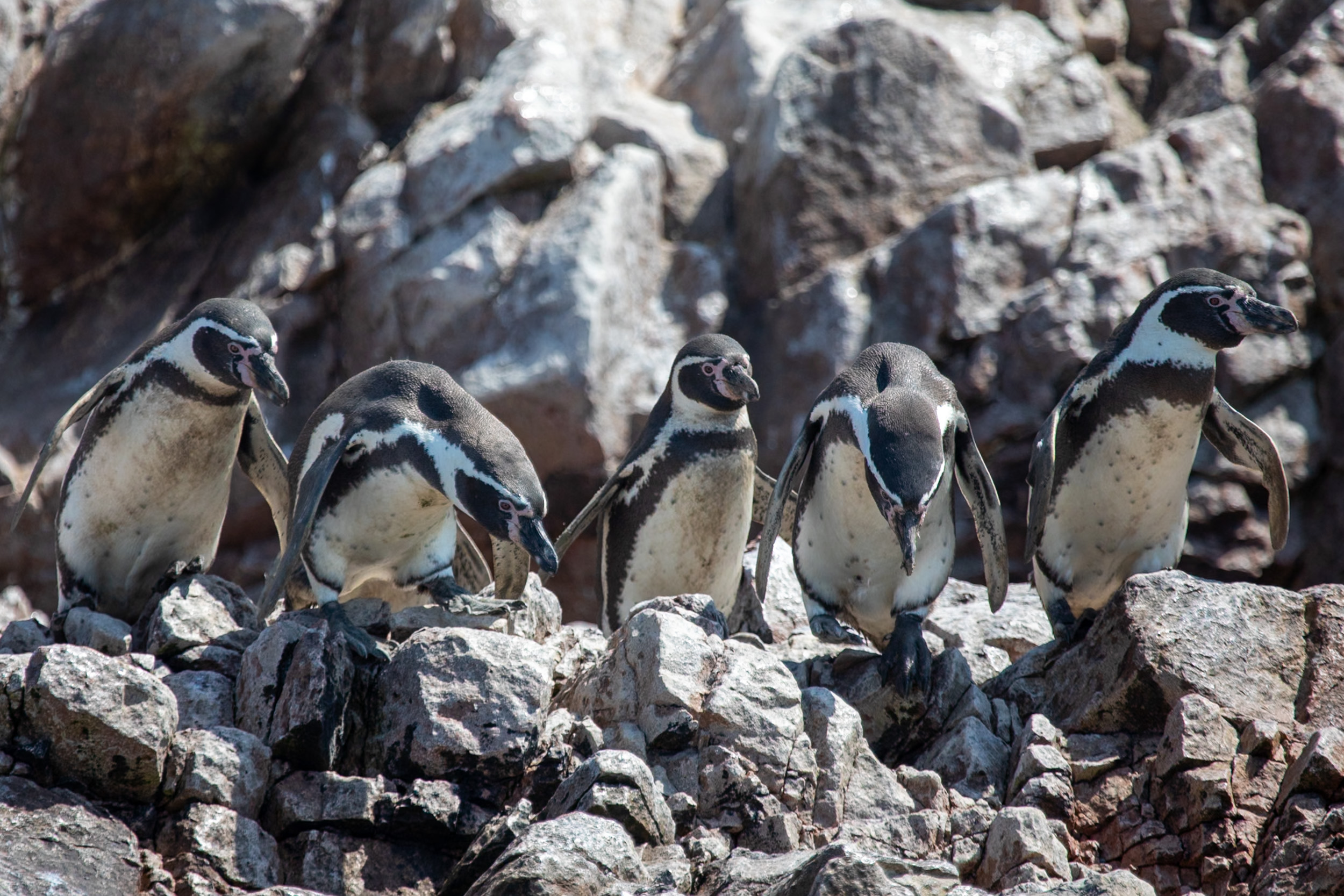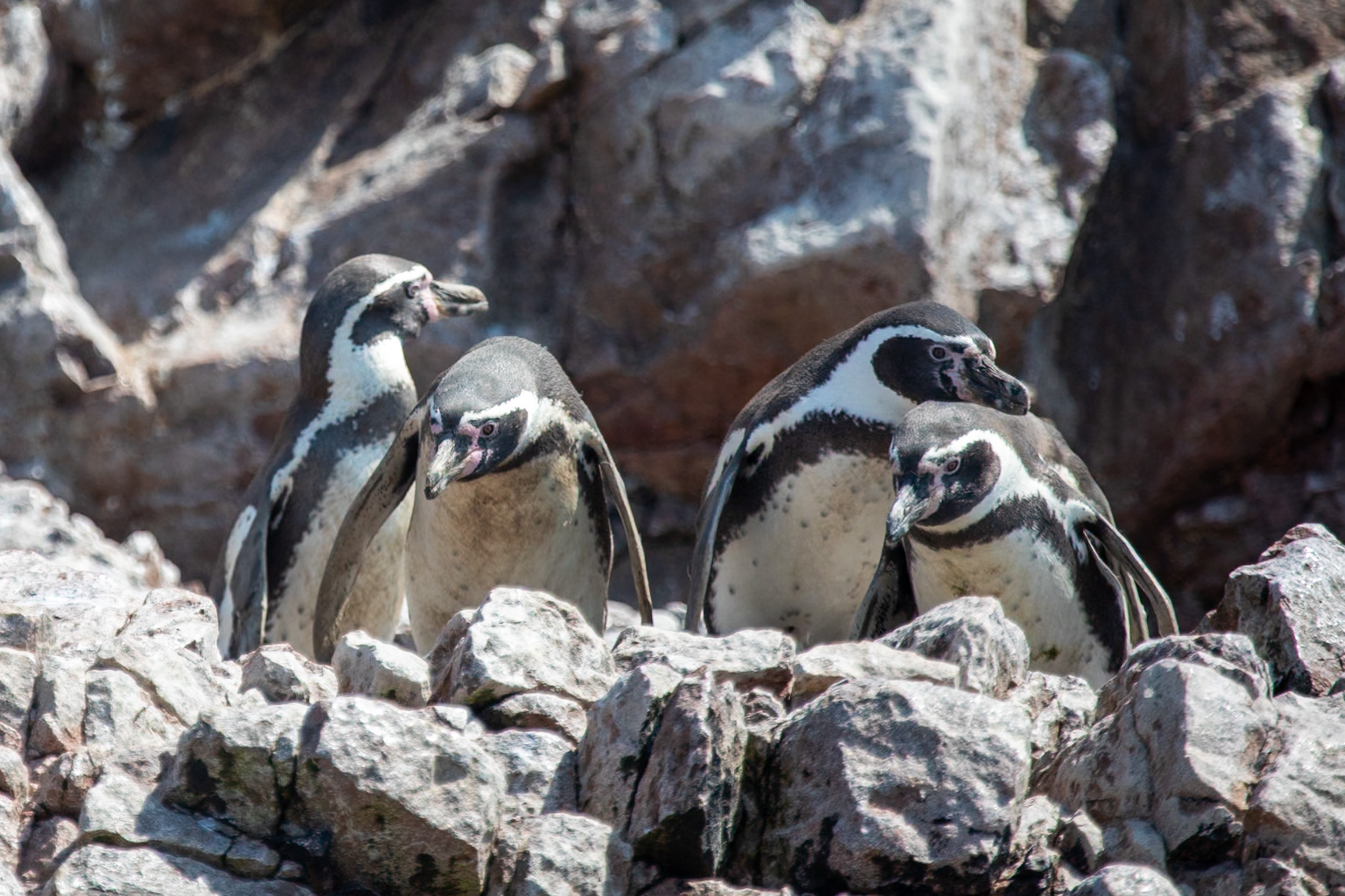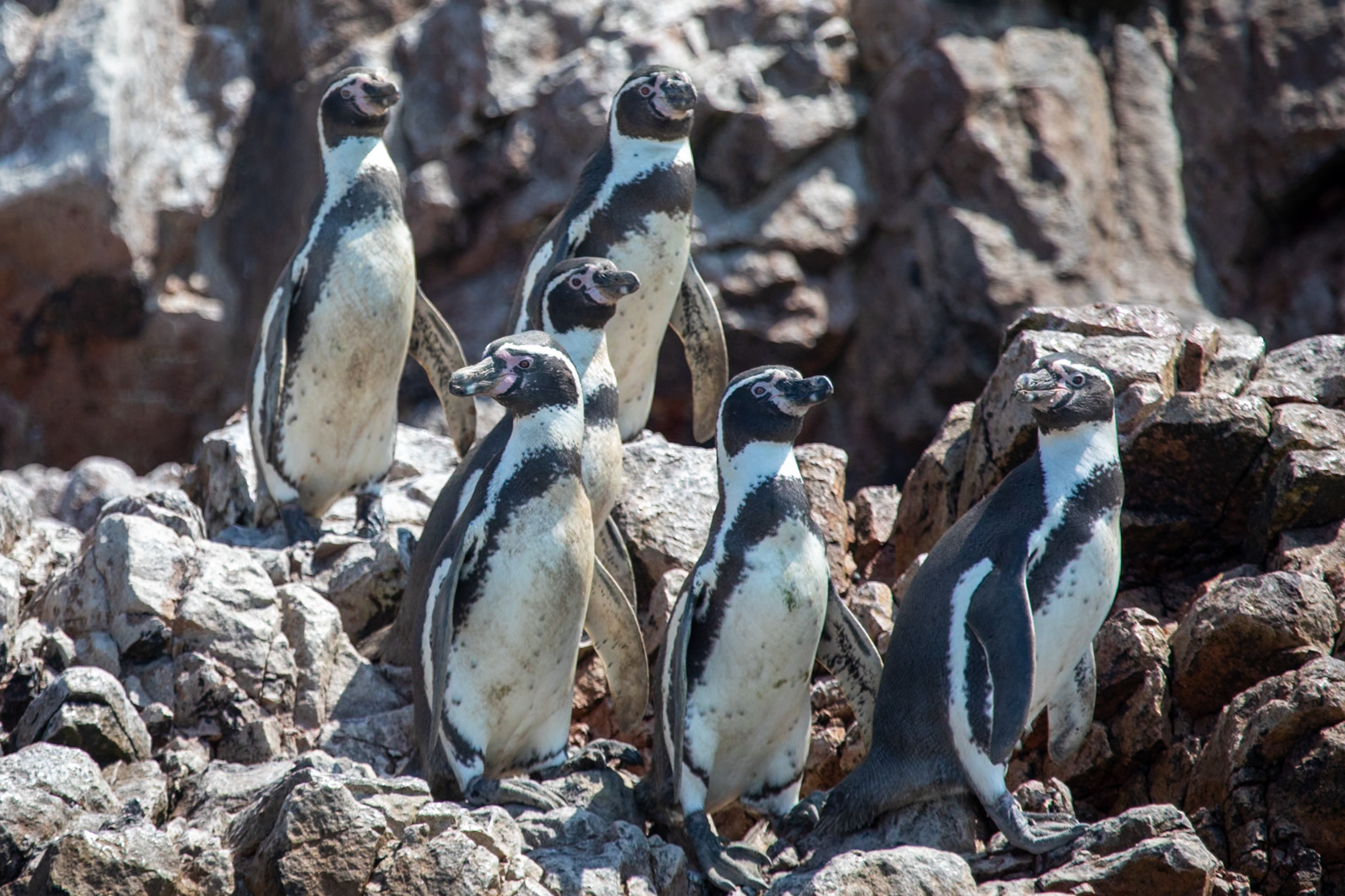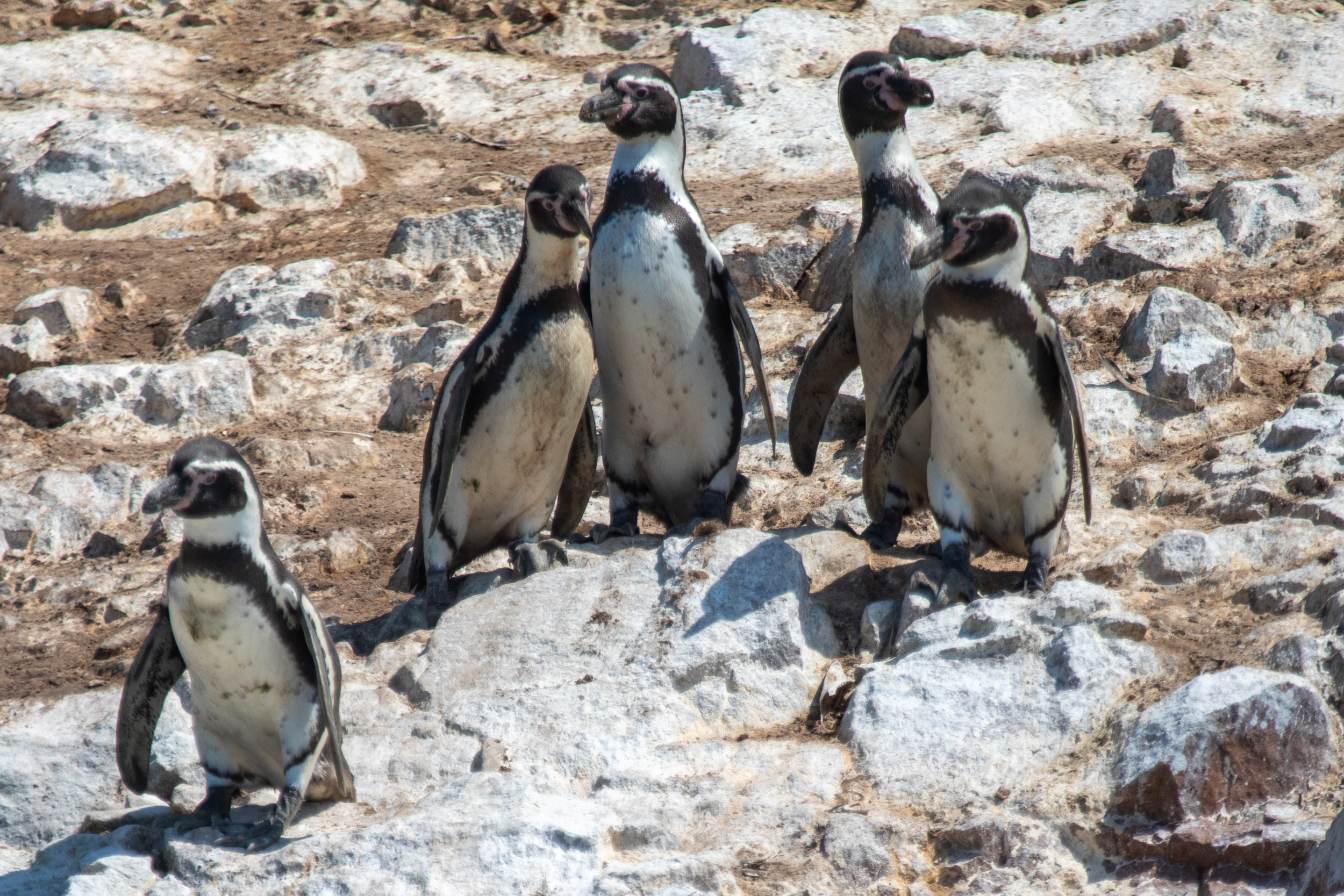 Mais le clou du spectacle, ce sont les manchots de Humboldt, ils sont tellement mignons. Leur démarche sur les pierres est vraiment adorable, ils marchent avec une certaine maladresse en file et s’approchent de la mer. Le bateau nous laisse profiter du spectacle de leur marche jusqu'à la mer où ils sont tout à coup bien plus habiles.