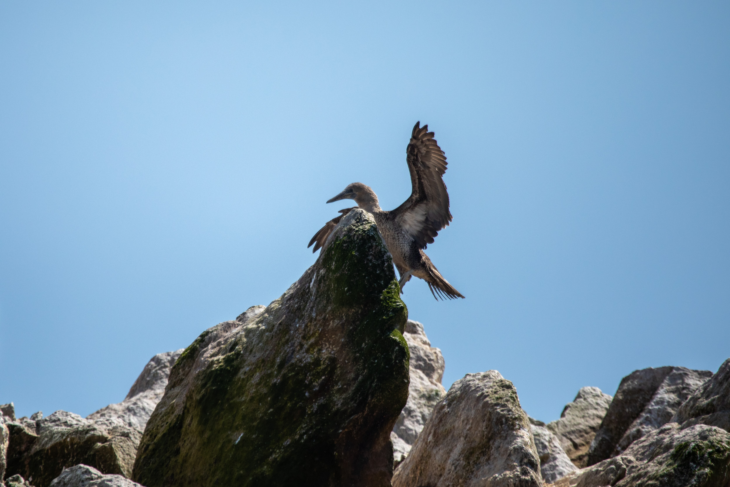 Sur un rocher, un fou aux pieds gris se fait sécher les ailes au vent.