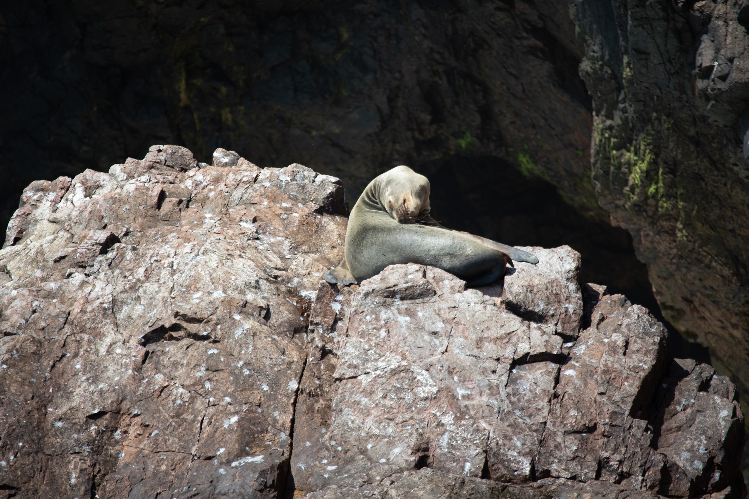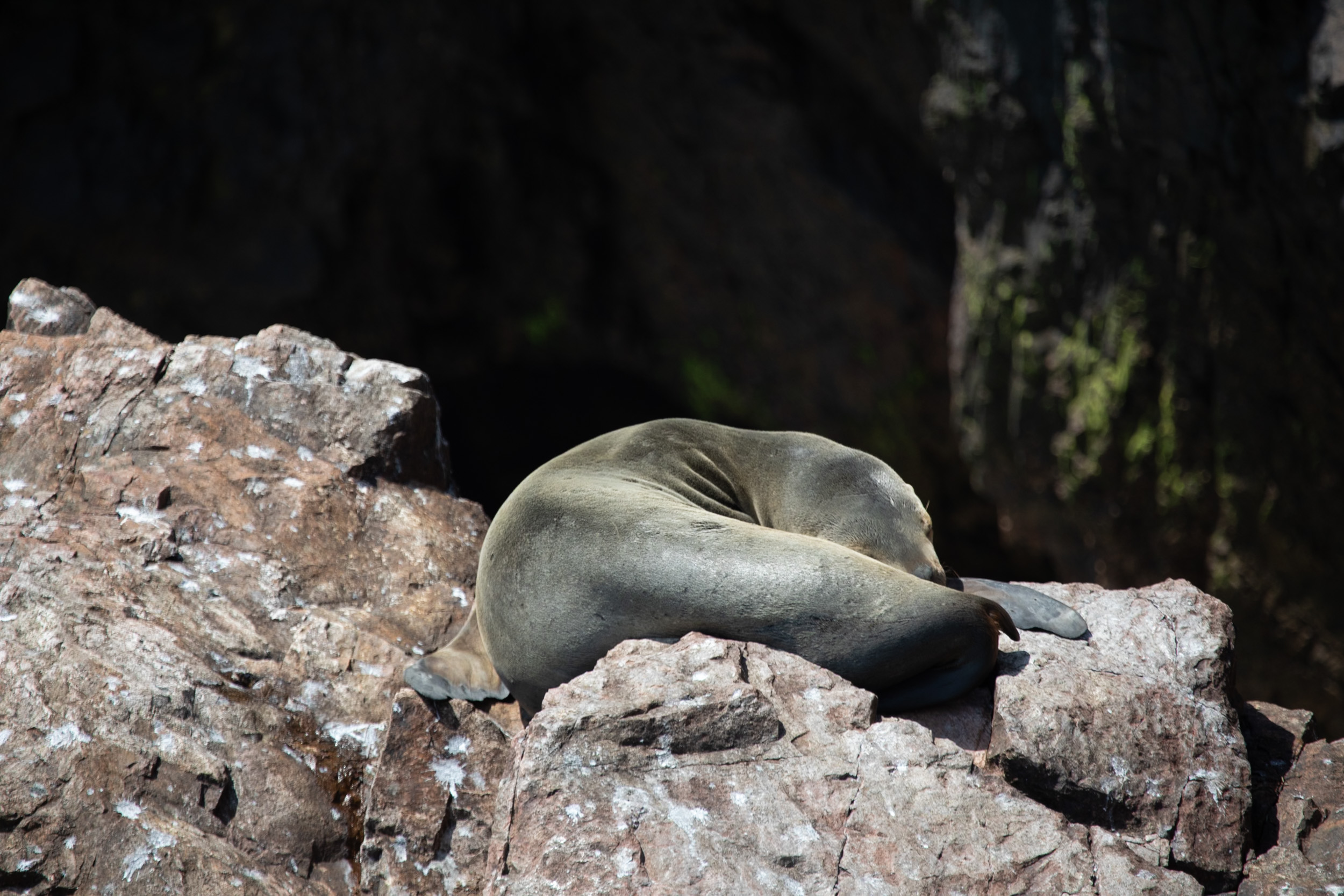 Une otarie est en train de dormir sur les rochers, elle est tranquillement installée et on ne la dérange pas.