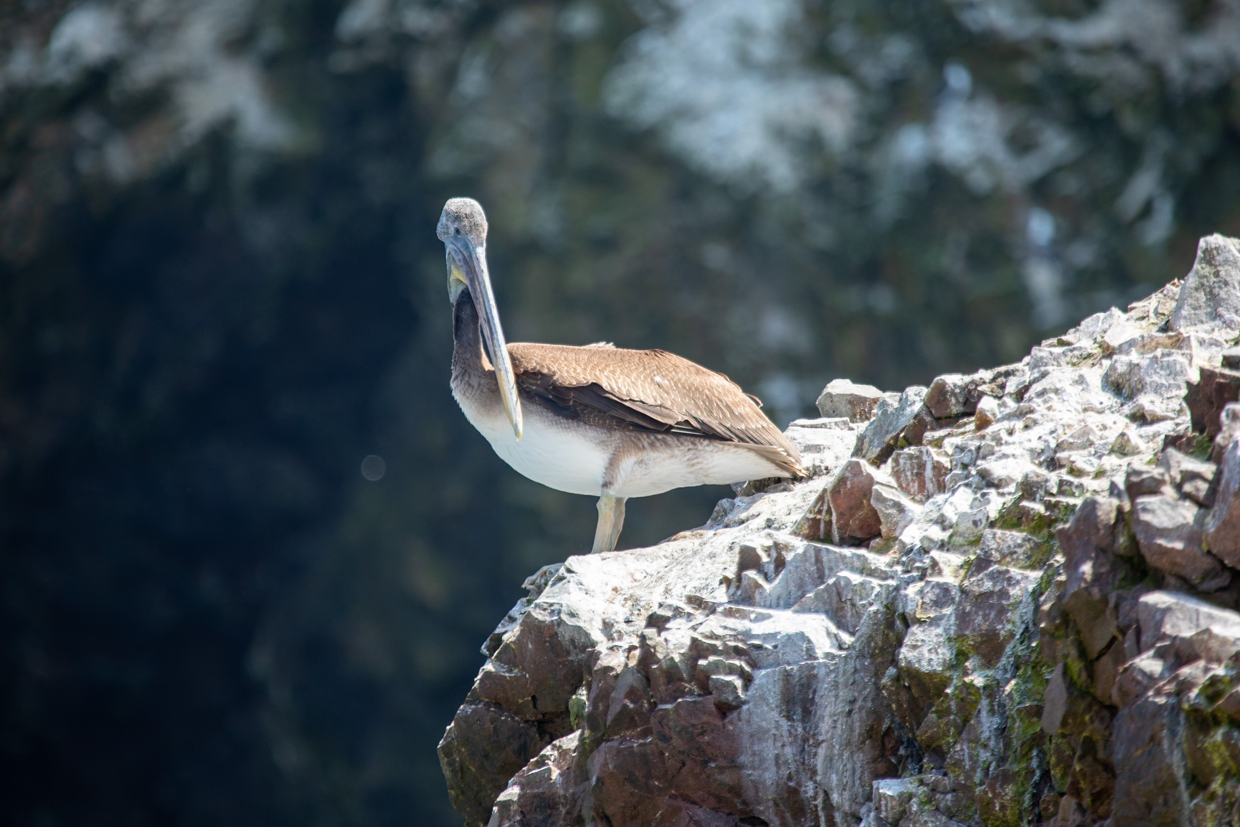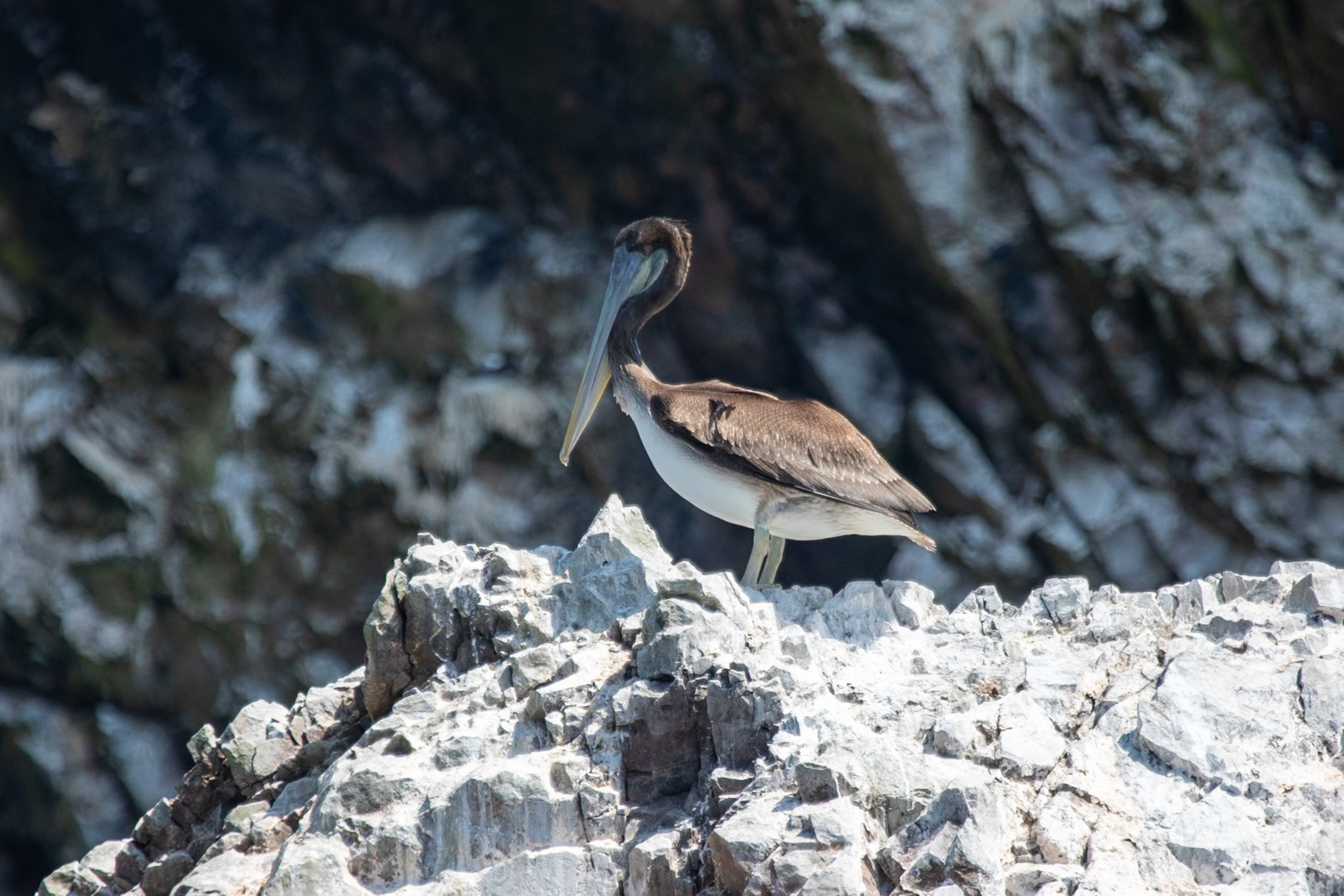 Un pelican du Pérou passe juste devant le bateau avant de se poser sur un rocher à proximité. C’est la première fois que je vois cet oiseau, je le trouve très majestueux.