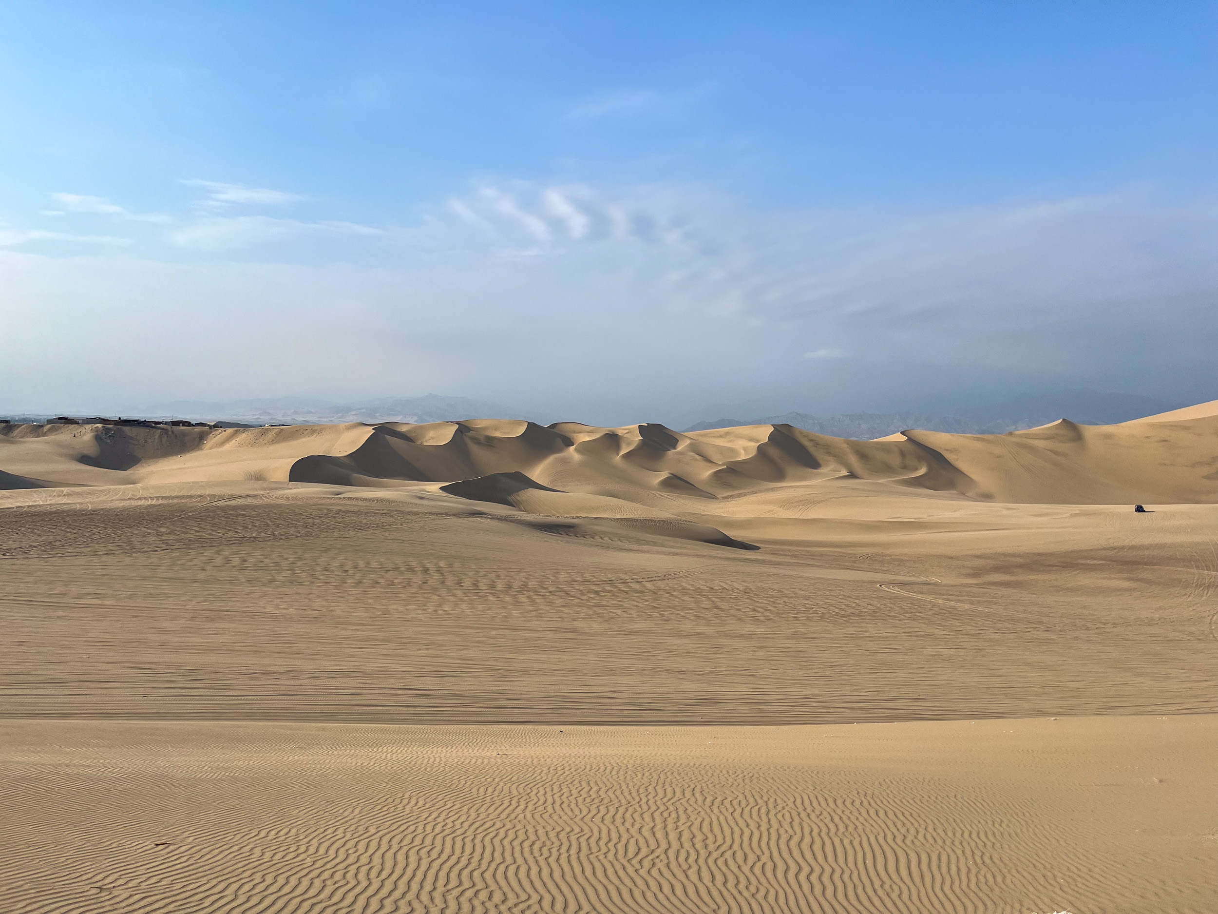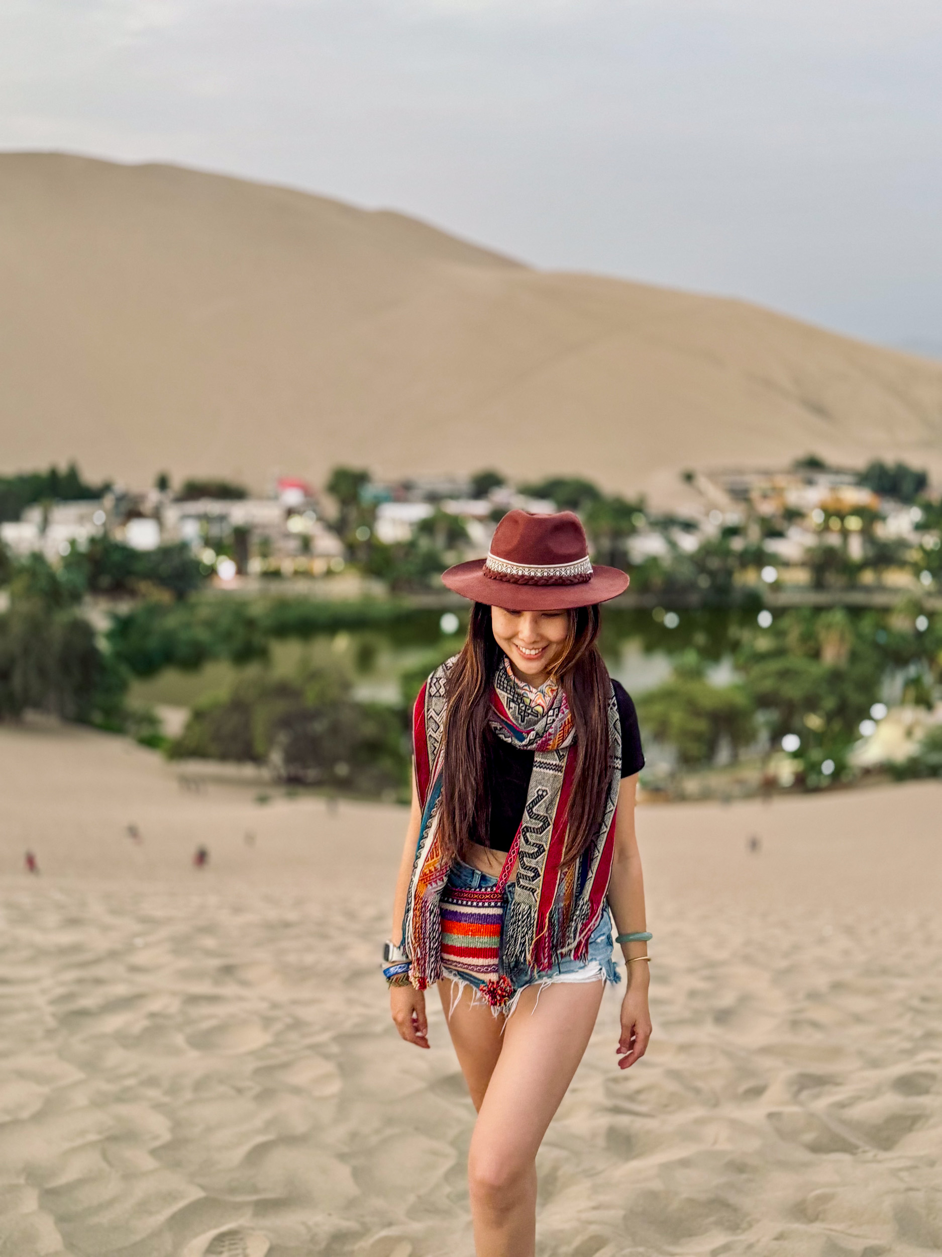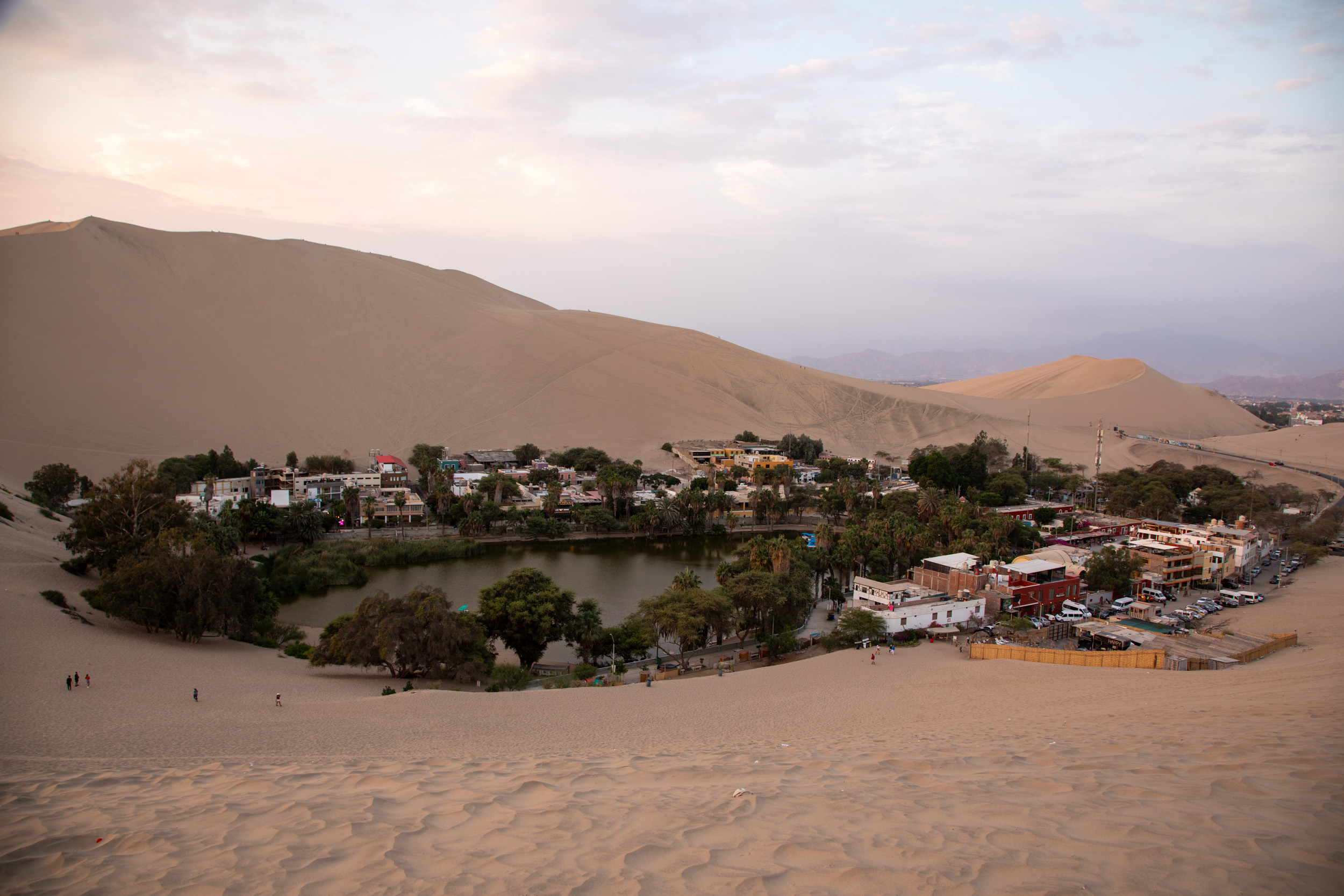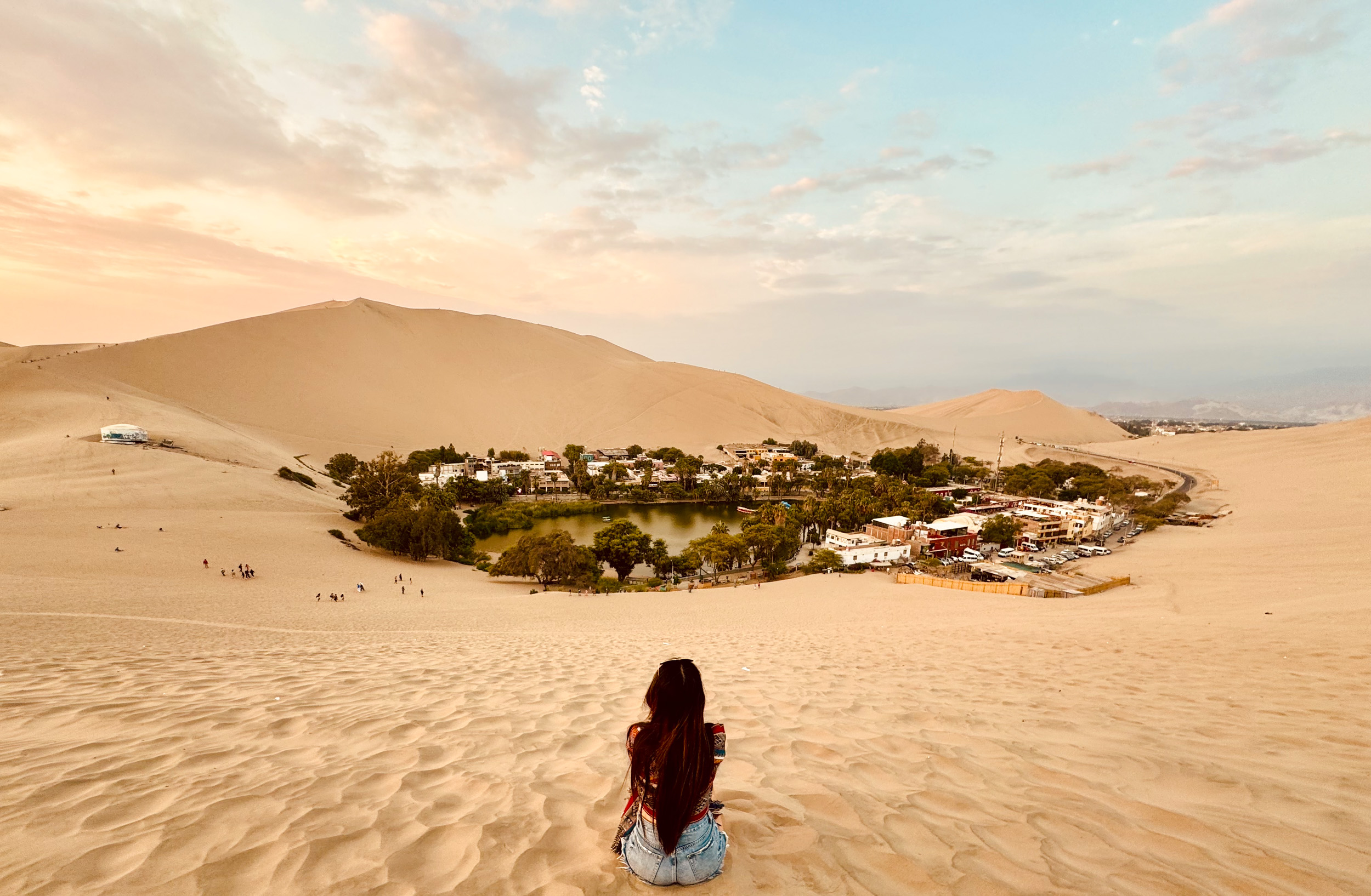 On demande à notre chauffeur de nous déposer à un endroit où l’on peut voir le coucher de soleil avec une vue complète sur toute l’oasis. On s’installe dans le sable et on admire Huacachina à l’heure dorée jusqu’à ce que le soleil disparaisse.