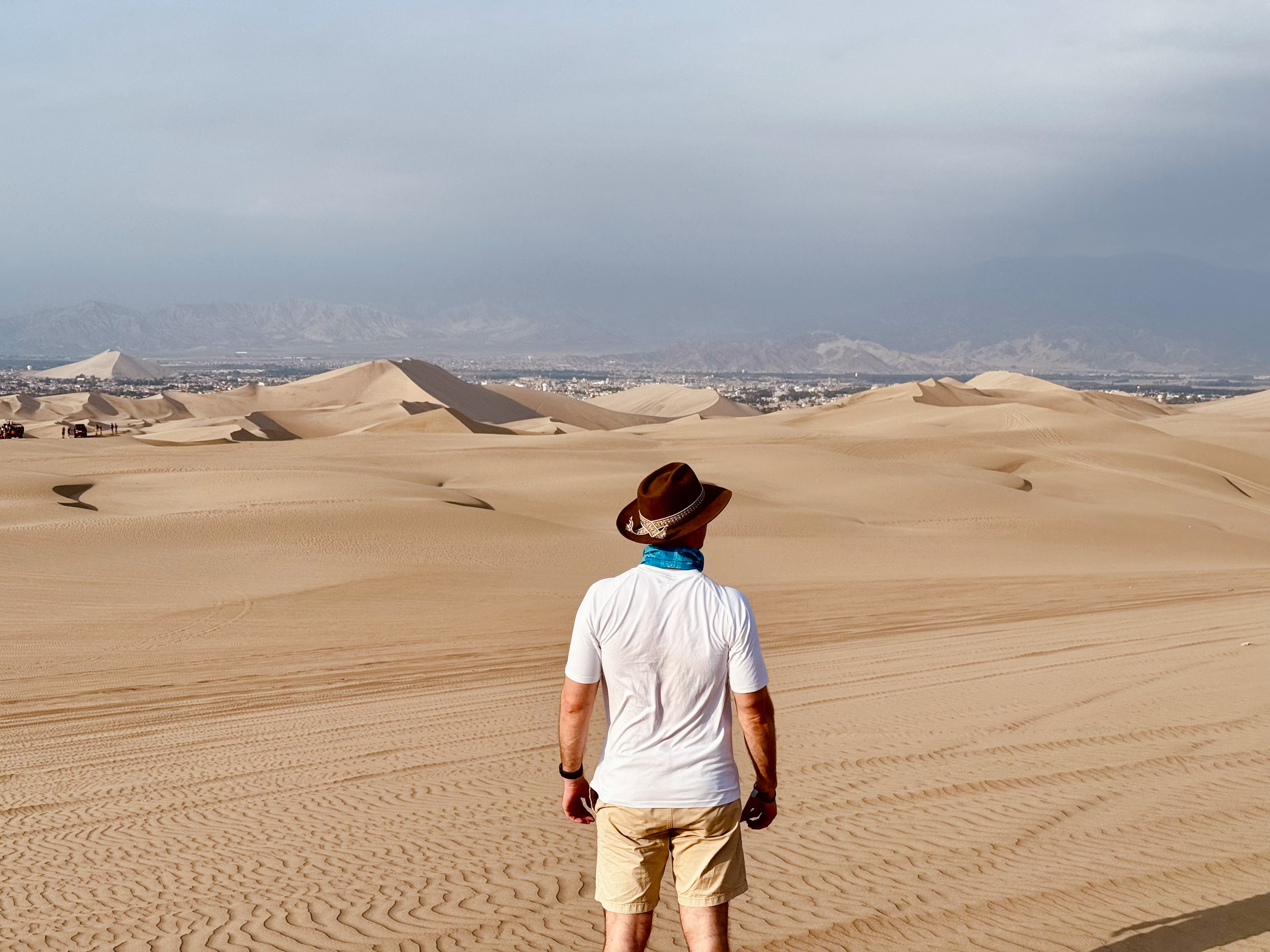 On retrouve notre guide du bus qui nous amène pour manger le déjeuner dans un restaurant qui a une très belle vue sur l’océan. On mange malheureusement trop rapidement car il faut déjà repartir pour Huacachina. C’est un peu le défaut de ces voyages en groupe, cela ne nous correspond pas vraiment, on préfère prendre notre temps, discuter avec d’autres voyageurs, plutôt que de courir pour en voir un maximum dans la journée. On remonte dans le bus pour environ une heure et demi de route jusqu’à Ica, la ville la plus proche de Huacachina. La ville n’est pas attirante, et pourtant les environs ont l’air très intéressants, il y a des vignes qui poussent au milieu du désert. On est ici en terre de fabrication du Pisco, l’alcool national du Pérou. On arrive à Huacachina qui est une oasis au portes du désert qui accueille les touristes. Il y a une oasis et des constructions touristiques qui ont poussé autour à côté des palmiers.
