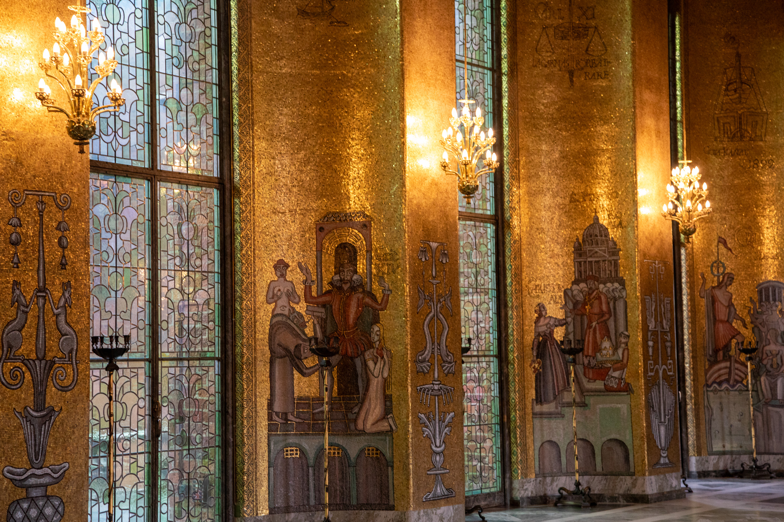 Pour découvrir l’intérieur du bâtiment il faut s’inscrire à un tour guidé. On commence par la salle de gala des Nobel, avec le grand escalier royal. Puis on continue de découvrir les différentes salles, qui n’est pas seulement un bâtiment touristique mais aussi encore en service pour le gouvernement. On traverse les couloirs mais il est interdit de s’arrêter, puis on arrive jusqu’à la salle du parlement. De l’autre côté, du bâtiment il y a la salle du bal qui est magnifiquement décorée de dorures qui représentent la ville.