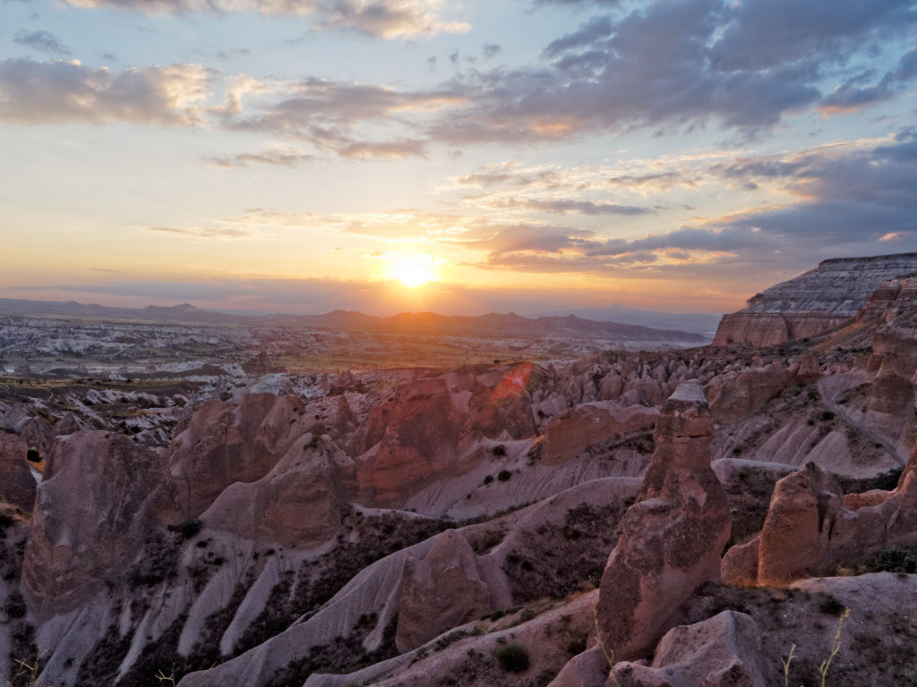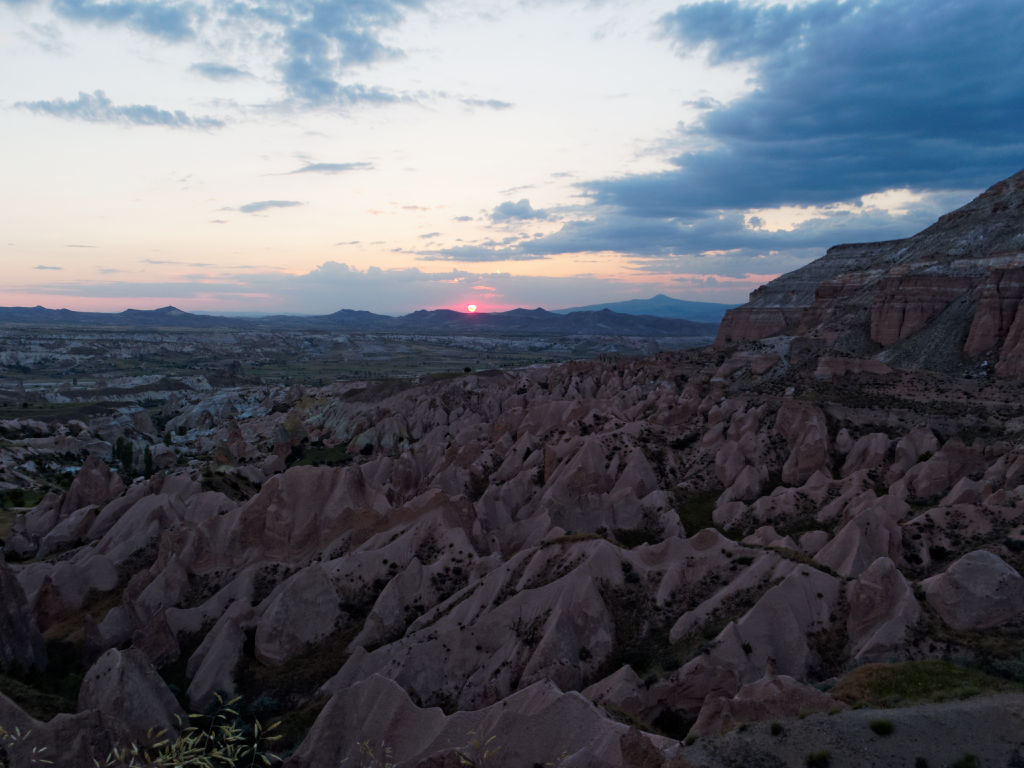 En fin de journée, on décide de trouver notre propre sunset point. En fait, j’avais remarqué lors de notre visite du parc géologique que la zone juste en face semblait aussi très intéressante mais pas du tout visitée. Nous achetons dans un supermarché à Goreme de quoi se préparer un pique nique puis nous nous garons à proximité du site de l’UNESCO. On part sur un petit chemin qui nous amène à d’autres petites églises bien plus modestes, mais aussi vers des roches à la forme carrément hallucinante. On trouve un endroit qui sera parfait pour notre diner, face au soleil couchant. Il n’y a personne et on est plutôt fier de notre trouvaille, on regarde le ciel s’embraser dans le silence quasi absolu.