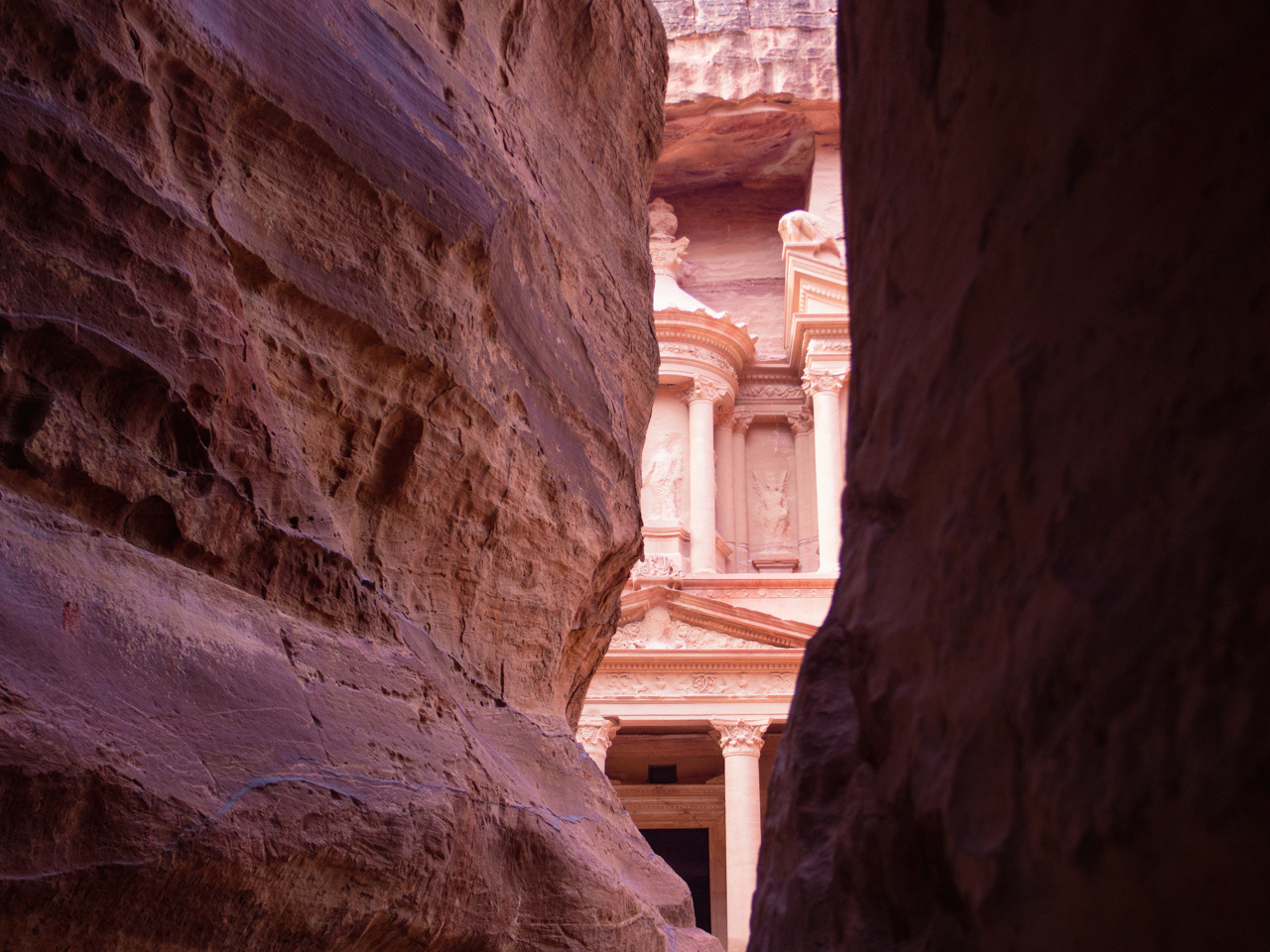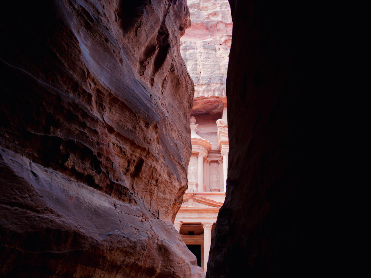 Ce matin nous partons un peu plus tard de Wadi Musa mais en ouvrant les rideaux on se rend compte que la météo nous a joué des tours et que le beau temps prévu est maintenant menacé par de gros nuages noirs et un vent très puissant. On craint que la soirée Petra by night sera annulée et que l’on va rater cette activité qui a l’air magnifique. On retourne dans le Siq et notre guide de la veille nous attend. Il est accompagné d’un de ses amis et ils avaient fait le pari que nous ne reviendrons pas et qu’il n’aurait pas son argent. Finalement, il est rassuré et on descend ensemble dans le Siq. L’ami de notre guide est très jovial, il nous raconte pleins d’histoires sur Pétra, sur les bédouins qui aiment grimper partout dans les montagnes autour, même sur les endroits les plus escarpés, arrivé au bout du canyon, le trésor nous ébloui toujours autant.