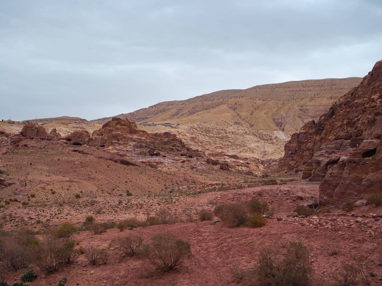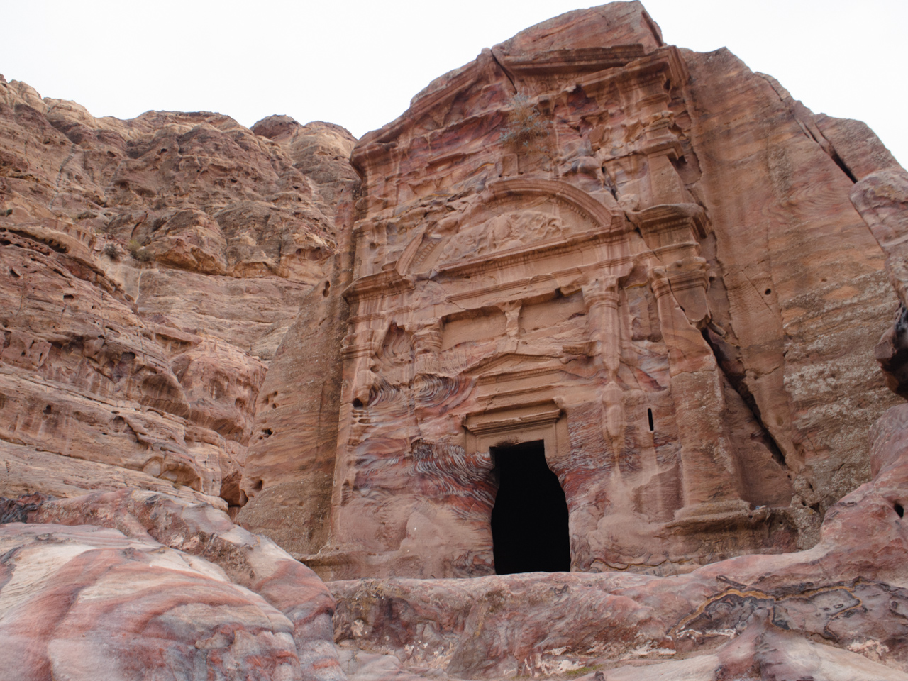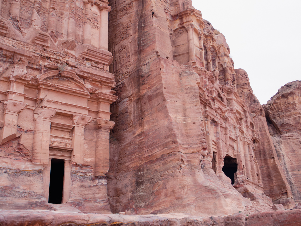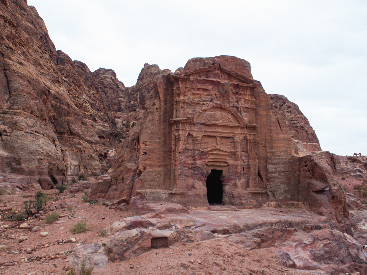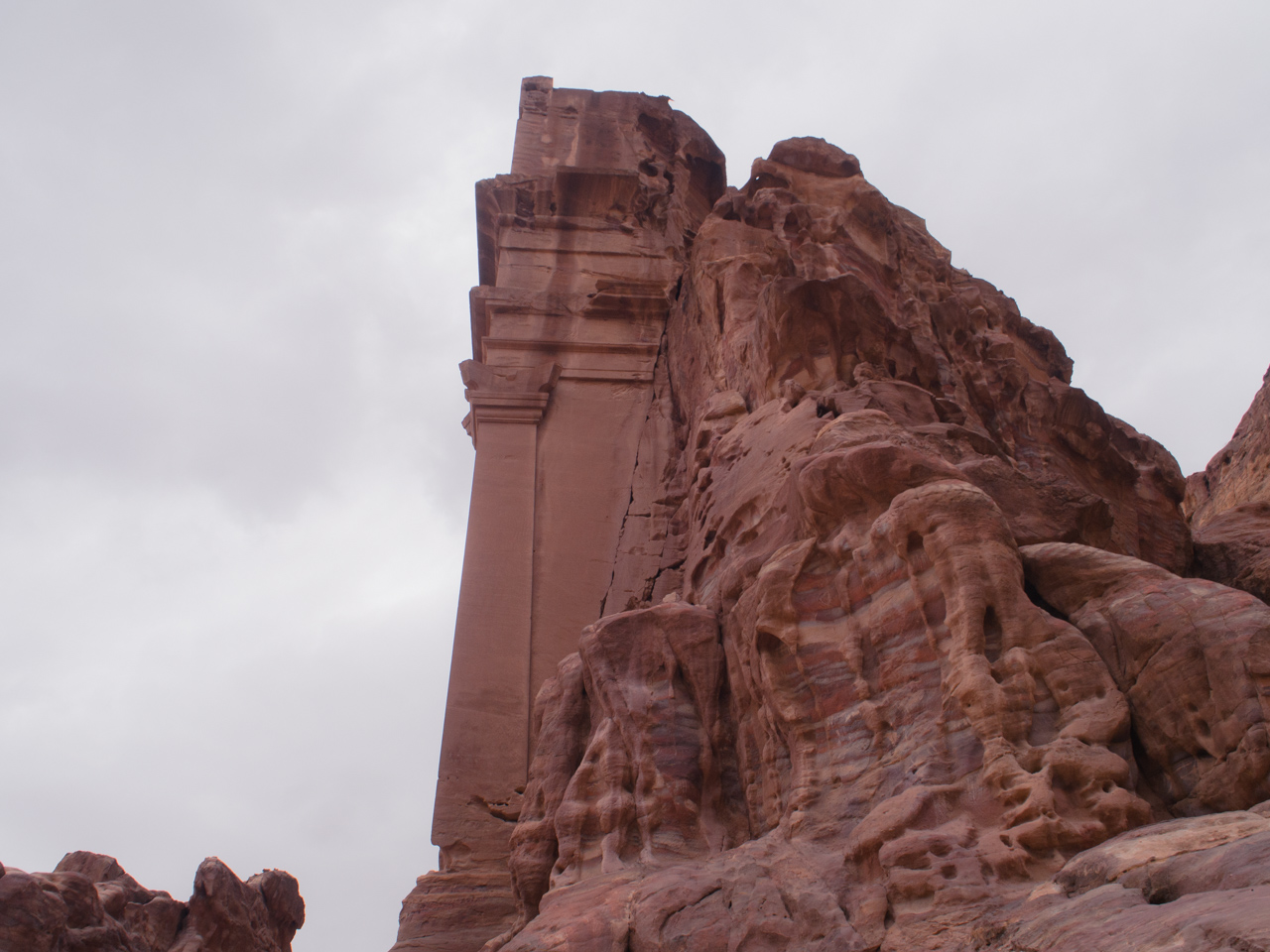 Le temps a changé pour de bons maintenant. Alors que jusqu’à maintenant les nuages alternaient avec le soleil, donnant un beau relief au paysage, maintenant le bleu a complètement disparu. Le vent s’est levé et la température a bien descendu. On grimpe vers les tombes royales mais le temps n’est pas agréable. La lumière est aussi beaucoup moins avantageuse. Une tombe dont seule façade a été creusée dans la roche a un aspect vraiment fascinant. C’est comme si il manquait une partie du bâtiment.