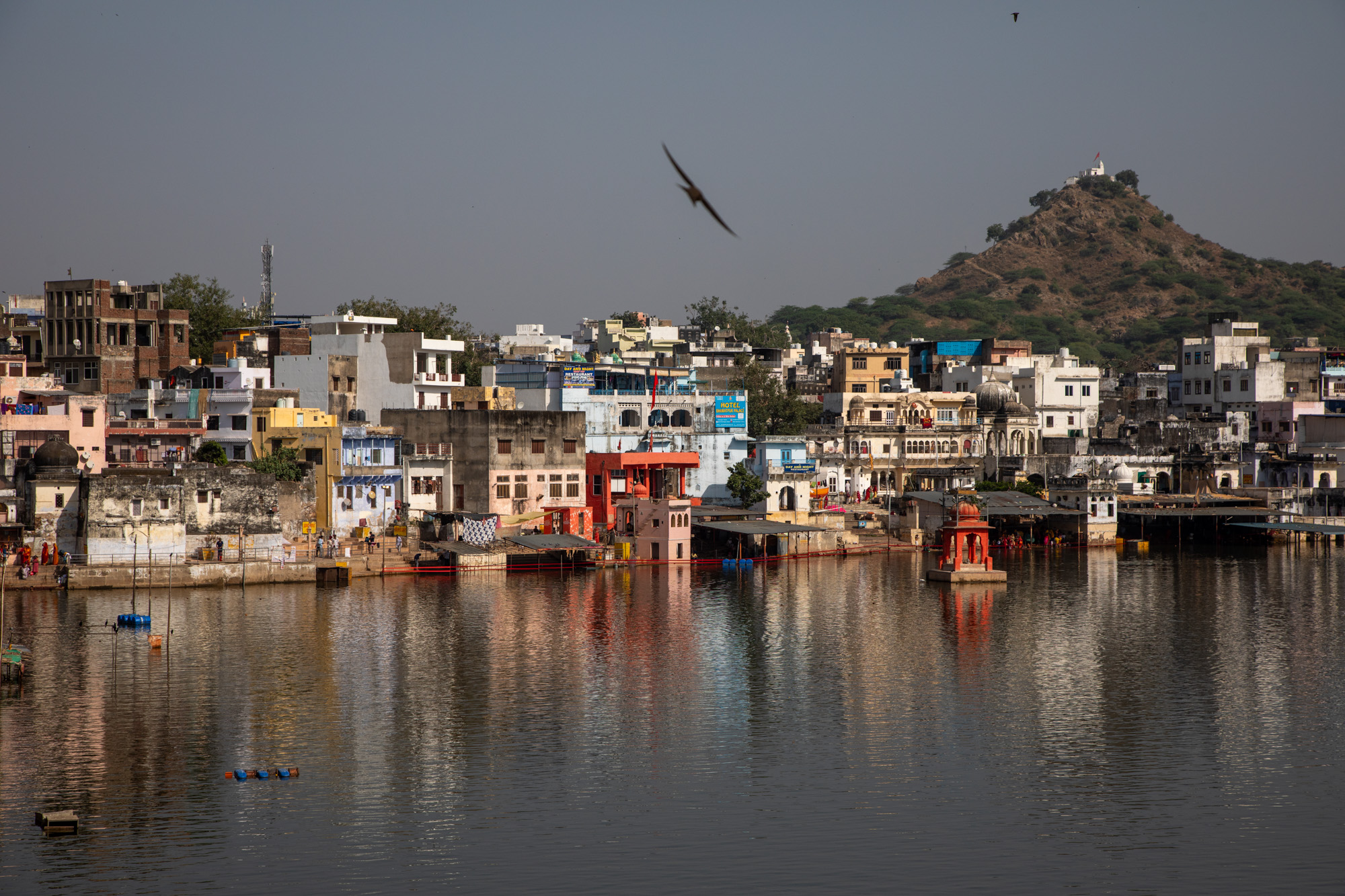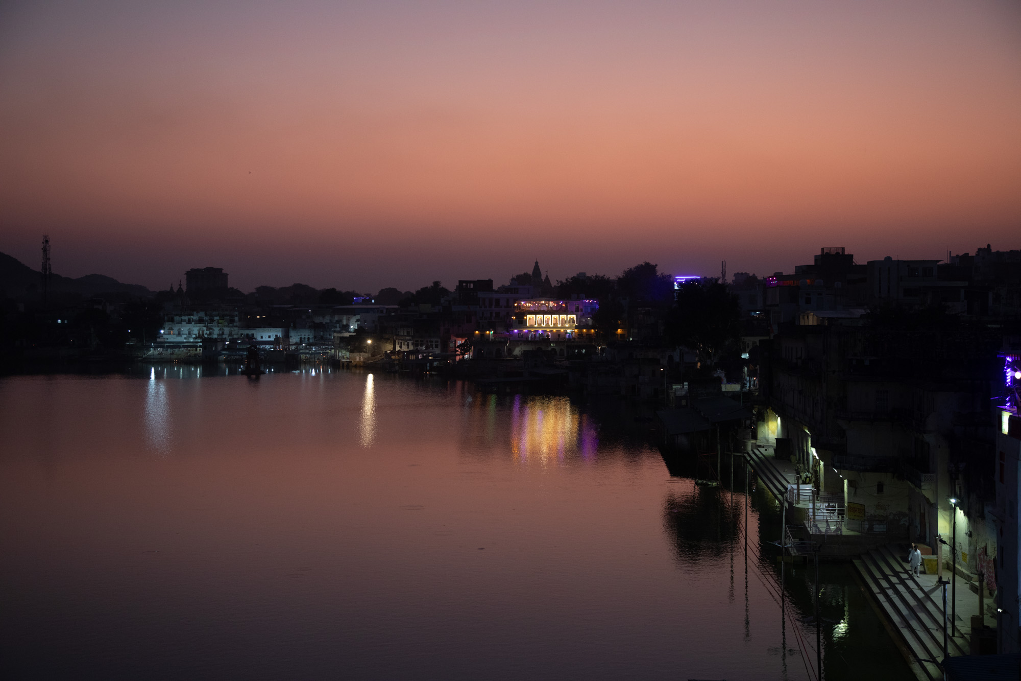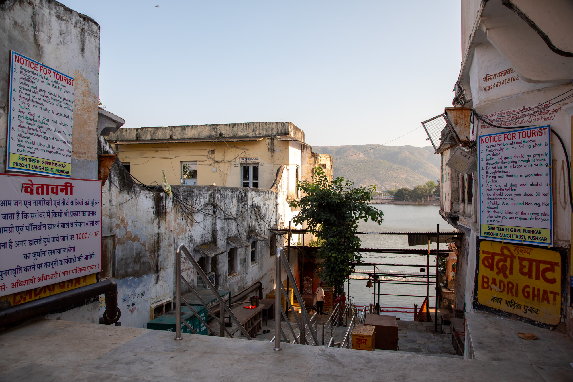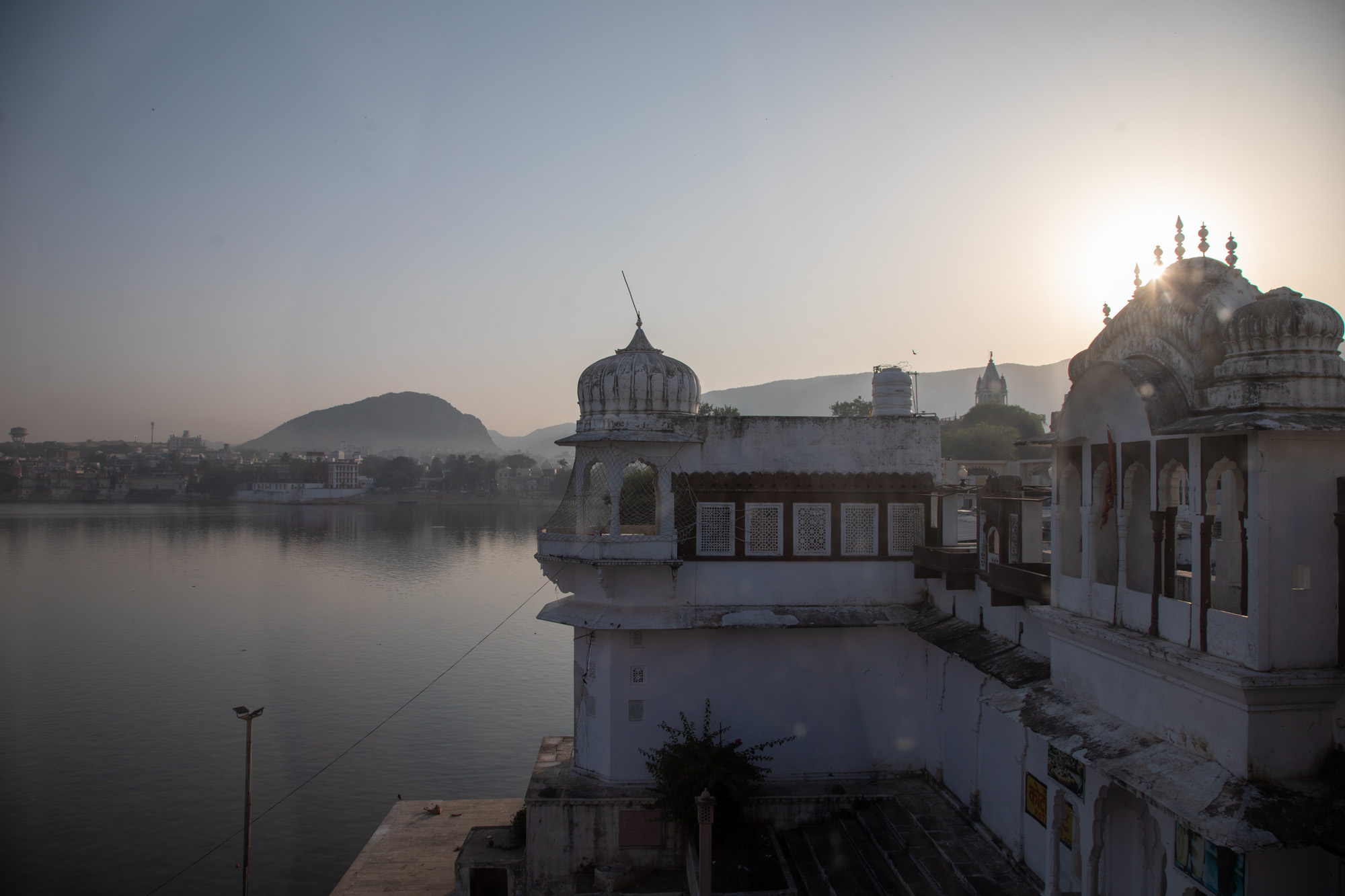 En approchant de Pushkar, le sable du désert du Thar s’accumule sur le bord de la route et commence à former des petites dunes de sable. Pushkar semble surgir de cet environnement aride comme un mirage. Tout à coup une ville avec en son centre un lac. Cette eau, ressource si rare dans le désert revêt une signification religieuse depuis des millénaires. Pushkar est un des endroits les plus sacrés du pays et de la religion hindoue, c’est un des seuls endroits où l’on trouve un temple dédié à Brama. Les pèlerins viennent de loin pour se baigner dans les eaux du lac sacré et ainsi se laver de leurs péchés et pouvoir sortir du cycle des réincarnations. On roule avec notre taxi jusqu’à notre hotel un peu à l’écart de l’agitation. On a choisi un petit hotel qui a la particularité d’avoir une chambre dans un ancien ghat directement sur le lac et face à la ville. La vue est parfaite, on est immergé dans le décor sacré de Pushkar. Quelle belle découverte, on ne peut que recommander de réserver la chambre supérieure avec cette alcôve pleine de charme et d’histoire. Un endroit parfait pour méditer.