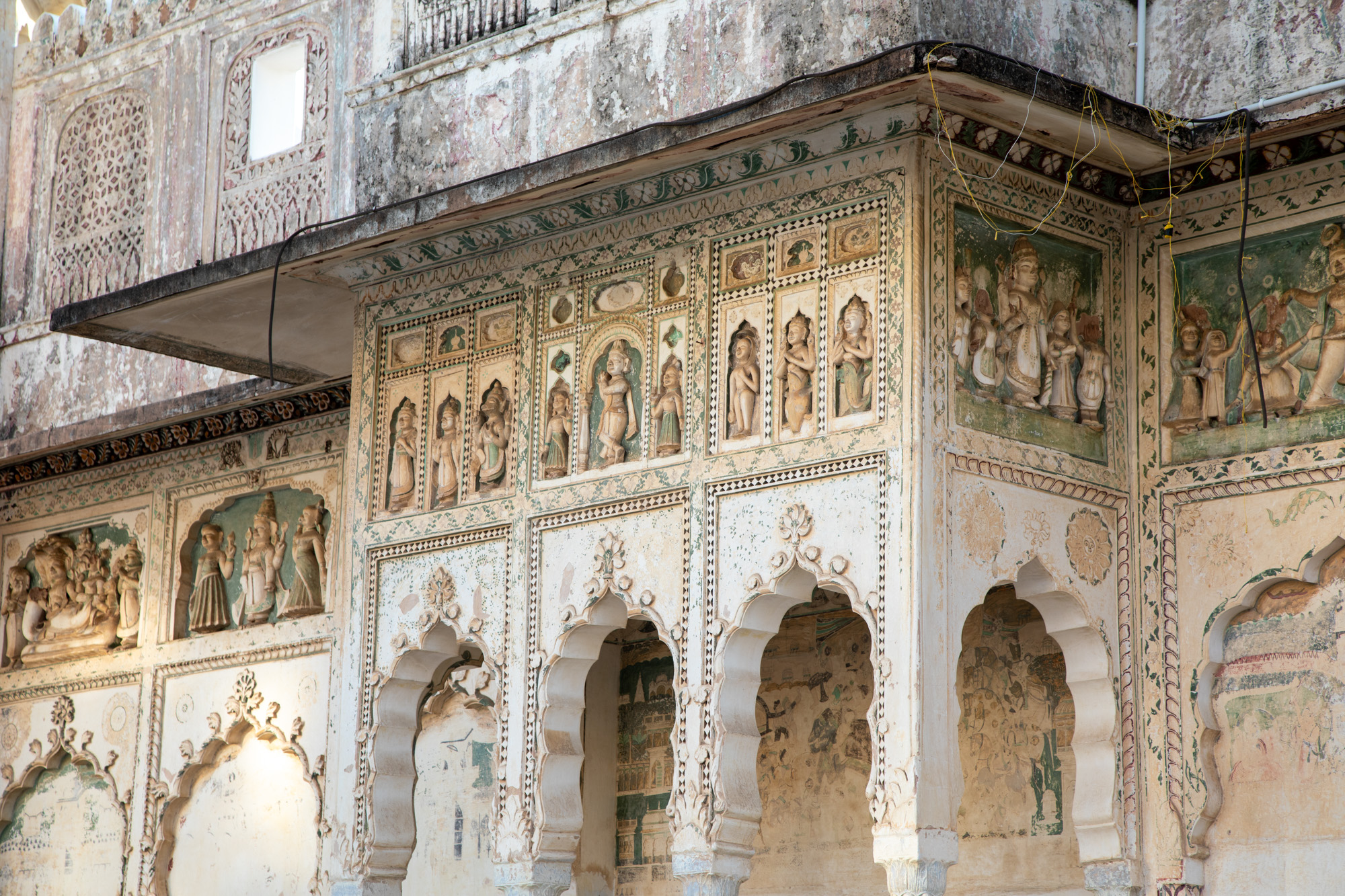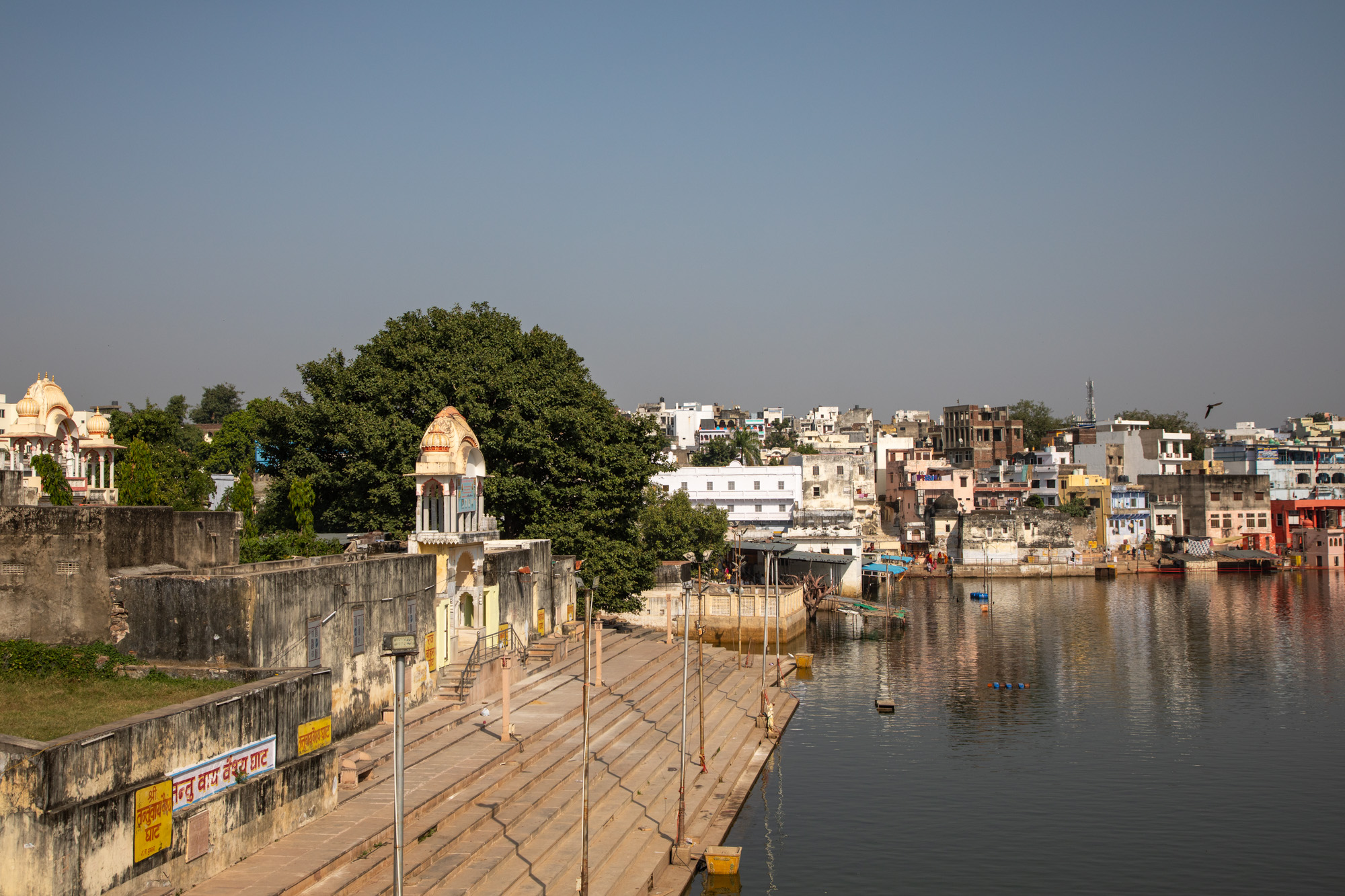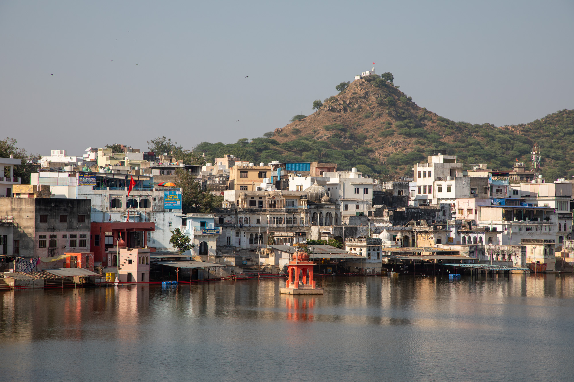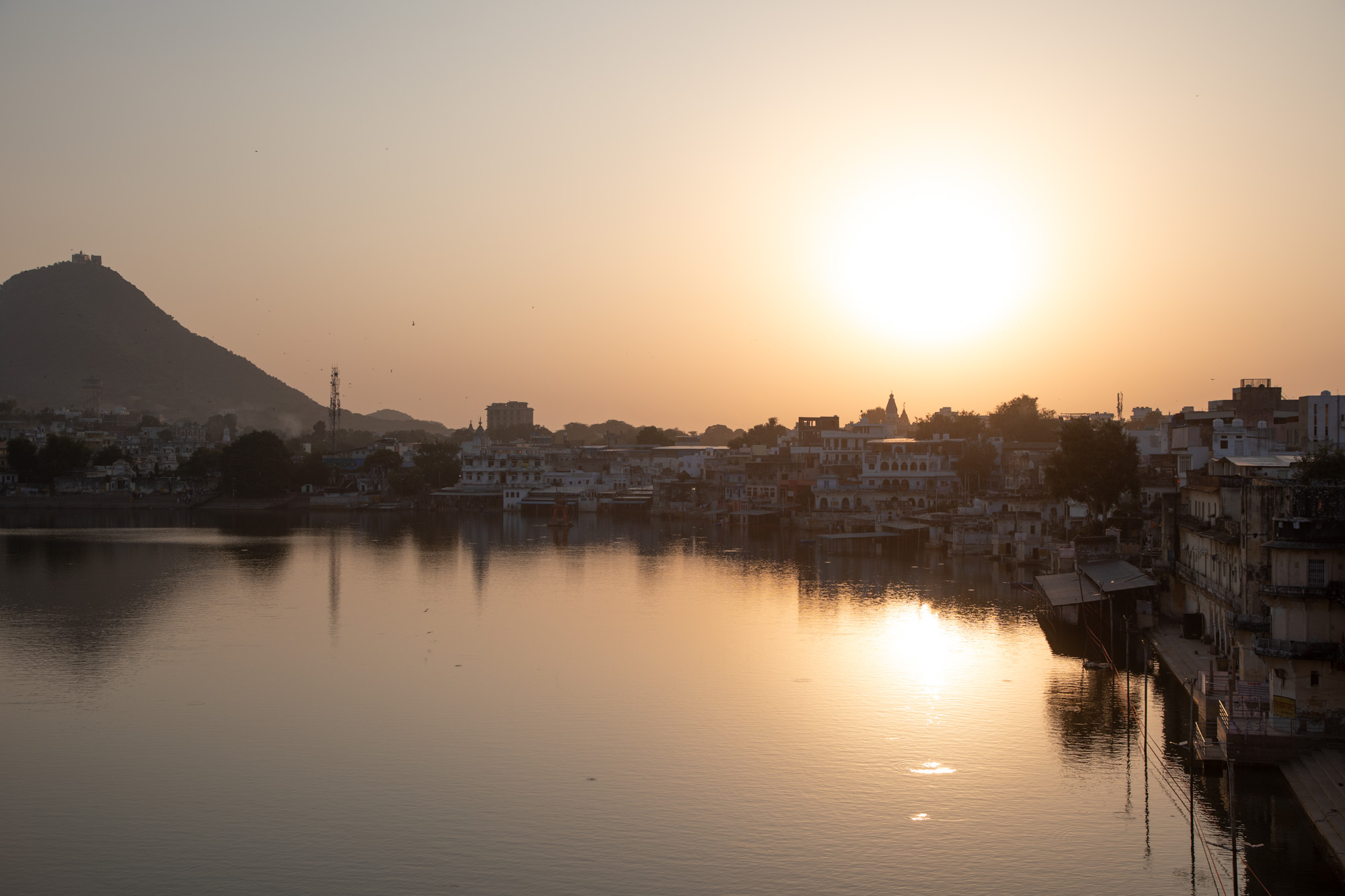 En approchant de Pushkar, le sable du désert du Thar s’accumule sur le bord de la route et commence à former des petites dunes de sable. Pushkar semble surgir de cet environnement aride comme un mirage. Tout à coup une ville avec en son centre un lac. Cette eau, ressource si rare dans le désert revêt une signification religieuse depuis des millénaires. Pushkar est un des endroits les plus sacrés du pays et de la religion hindoue, c’est un des seuls endroits où l’on trouve un temple dédié à Brama. Les pèlerins viennent de loin pour se baigner dans les eaux du lac sacré et ainsi se laver de leurs péchés et pouvoir sortir du cycle des réincarnations. On roule avec notre taxi jusqu’à notre hotel un peu à l’écart de l’agitation. On a choisi un petit hotel qui a la particularité d’avoir une chambre dans un ancien ghat directement sur le lac et face à la ville. La vue est parfaite, on est immergé dans le décor sacré de Pushkar. Quelle belle découverte, on ne peut que recommander de réserver la chambre supérieure avec cette alcôve pleine de charme et d’histoire. Un endroit parfait pour méditer.